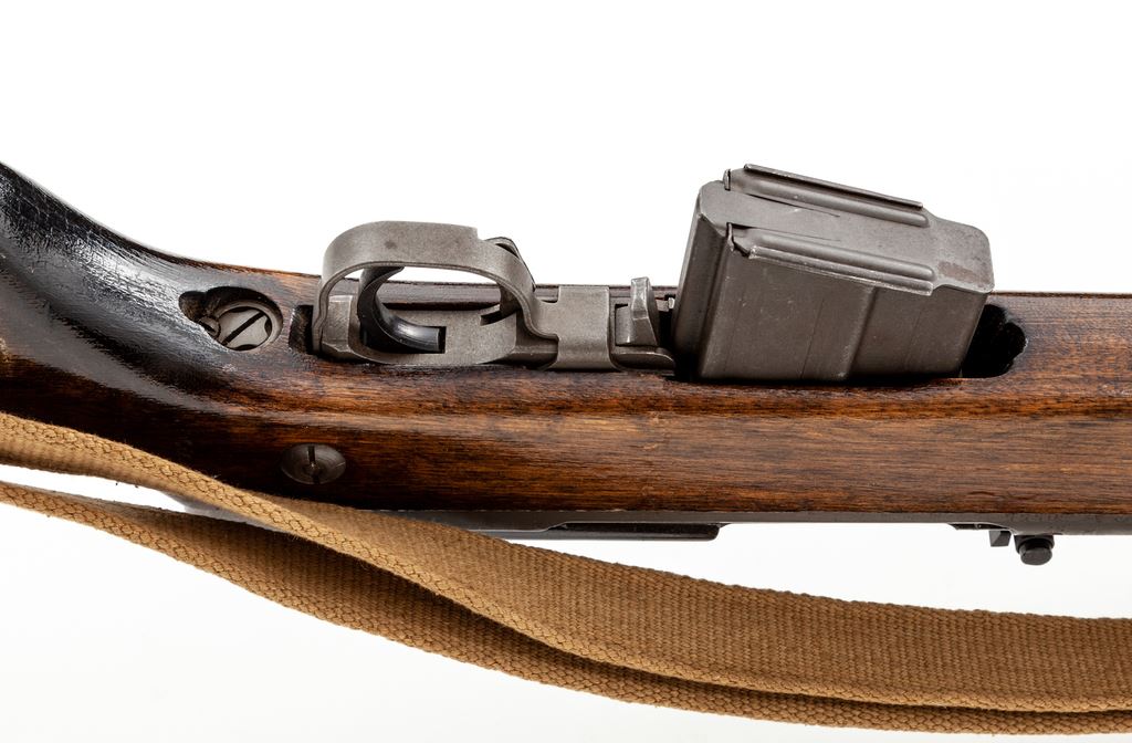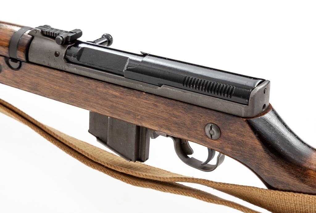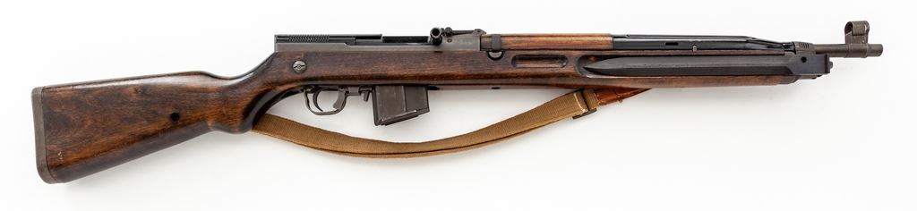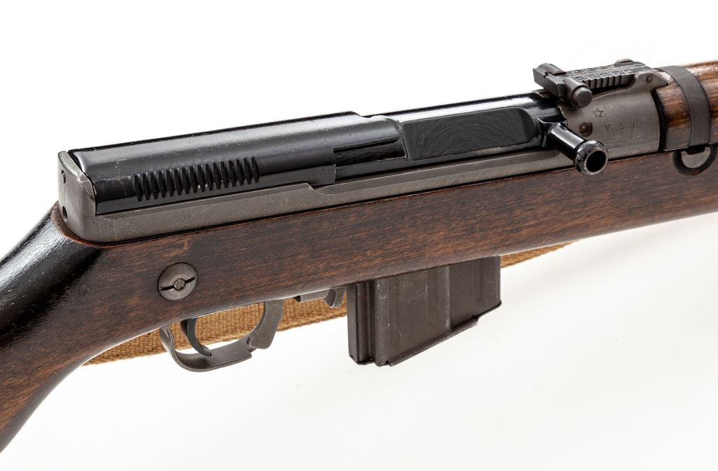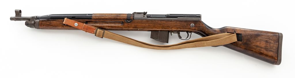 Czech Model 52/57 Semi-Automatic Rifle, with bayonet, #30555, 7.62x39mm cal., 20.66'' barrel, parkerized/painted finish, hardwood stock, hooded blade front sight with notched tangent rear sight. Marked on right side of receiver with a star and ''VZ 52/57'', and on left side of receiver with ''she'', crossed swords, and mfg. date ''57''. Includes one five-round magazine, a side folding bayonet, and an excellent condition cotton and leather sling. Condition overall is about fine with over 90% finish remaining on the grey metal with brown patina on the magazine, sight hood, and buttplate. There is light chipping to the painted finish on the bolt and receiver cover. Wood has had a coat of gloss varnish applied that has dripped in places, and there are areas of light scratches and handling marks. Action operates smoothly, bright bore is excellent. No visible import stamps. Bayonet is very good with no damage to the edges of the blade and a slight nick to the point; almost all of the finish remains on the metal, and the catch operates smoothly. Est.: $800-$1,000. (C&R)