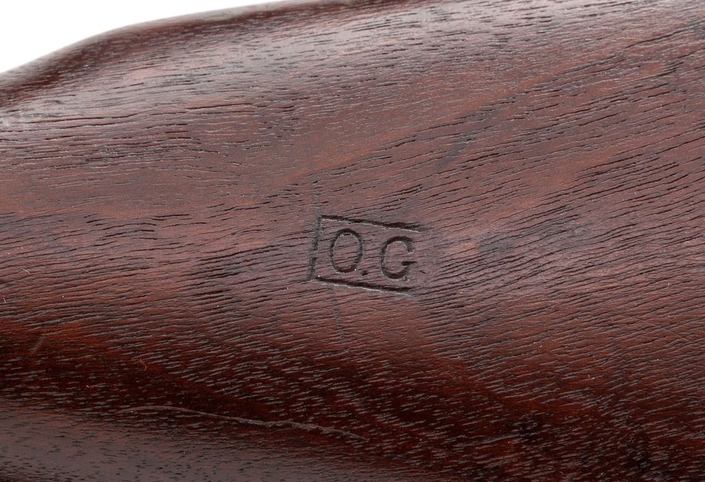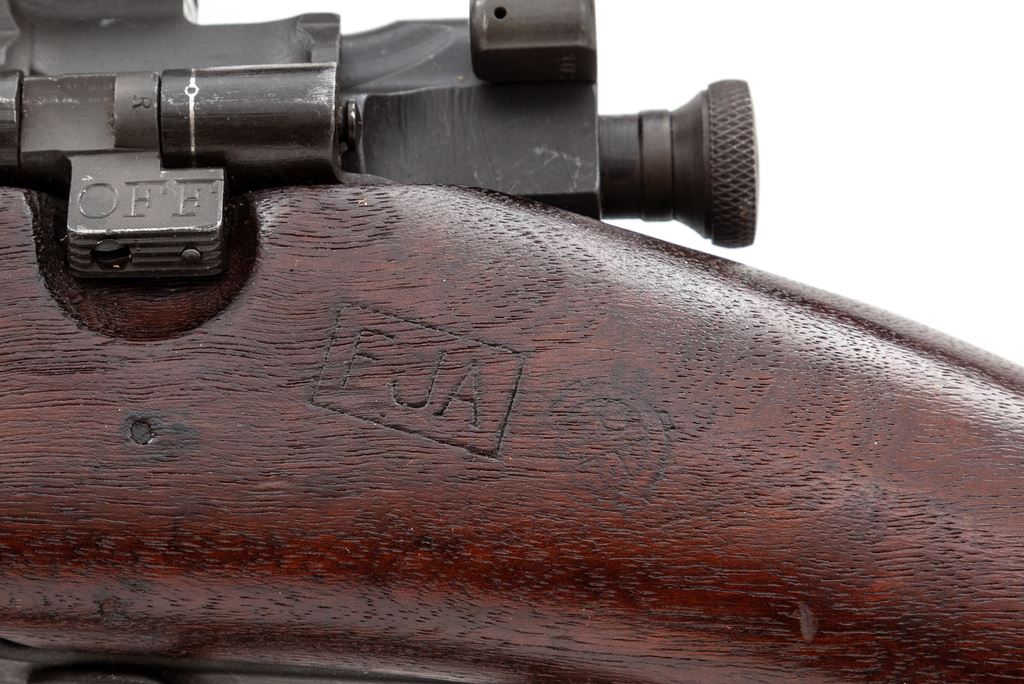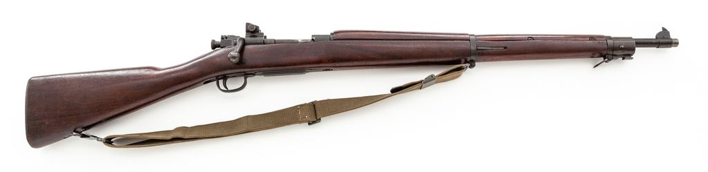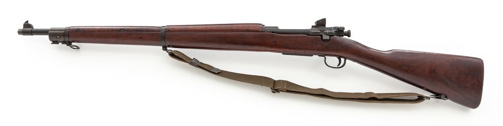 Smith-Corona Model 1903-A3 Bolt Action Rifle, #3697333, .30-06 cal., 24'' barrel, parkerized finish, walnut stock, blade front sight and aperture on ramp rear sight. Marked on receiver ''U.S. SMITH CORONA MODEL 03-A3'', and on barrel behind front sight ''SC/(flaming bomb)/5-43''. Boxed ''FJA'' cartouche next to faint U.S. Ordnance Dept ''wheel'' stamped on left side of stock. There is an additional boxed ''O.G.'' cartouche on left side of buttstock. Two ''P'' firing proofs are stamped on the underside of the wrist. Condition overall is very good with approx. 90% finish remaining on the metal, with thinning at the muzzle and the bolt showing wear that has turned to a lighter mottled green color. Wood has an area of small dents on the left side of the forend, otherwise it has a nice even color with light added finish and a few minor handling marks. Action is smooth, bore is very good. Includes a reproduction U.S.G.I. cotton sling. Est.: $600-$800. (C&R)