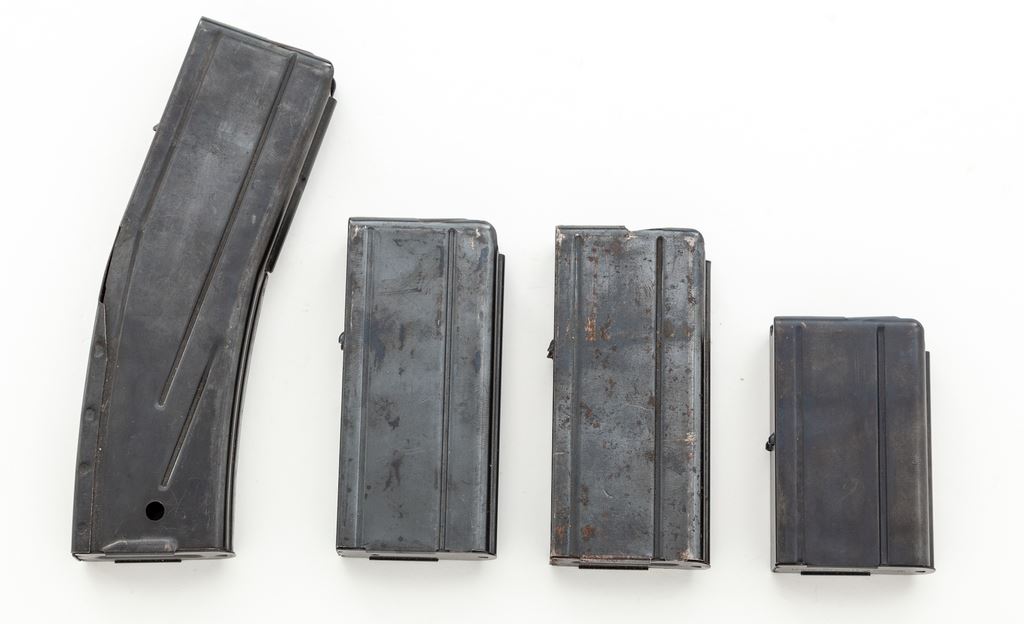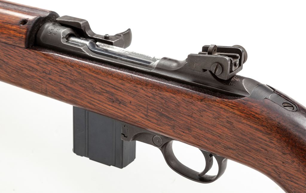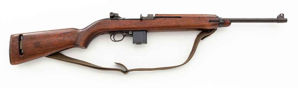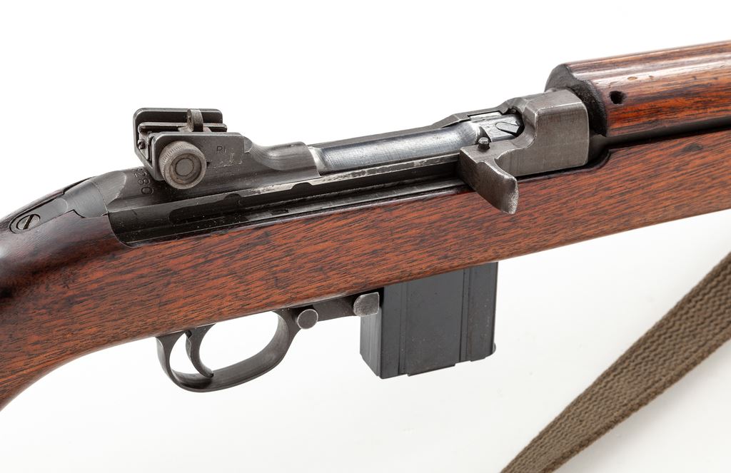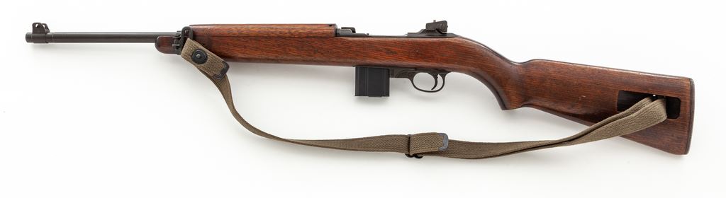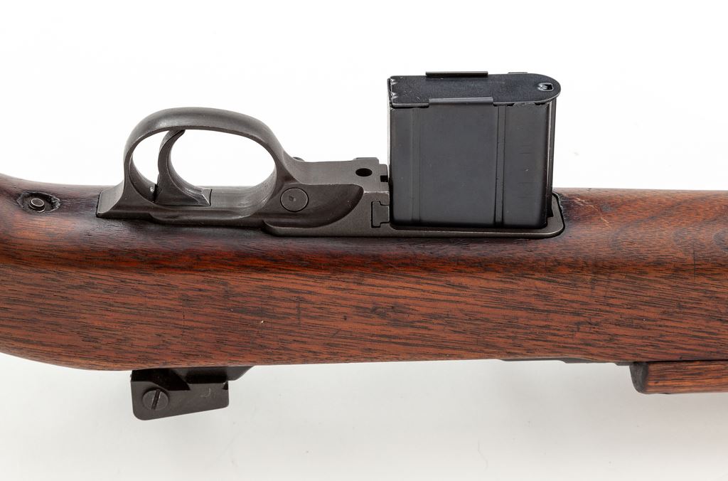 Inland M1 Carbine, #578280, .30 Carb. cal., 18'' barrel, parkerized/blued finish, walnut stock, blade front sight with protective ears and aperture on ramp rear sight. Marked on receiver tang ''INLAND DIV.'', and on barrel behind front sight ''INLAND MFG.DIV. GENERAL MOTORS 8-43''. ''U.S.CARBINE CAL .30 M1'' marked on receiver ring. U.S. Ordnance Dept. ''wheel'' cartouche stamped on right side of buttstock and circled ''P'' firing proof on underside of pistol grip. No bayonet assembly is attached. Condition overall is very good with approx. 80% finish remaining on metal surfaces, browning in places, and thinning on right side of receiver and buttplate. Bolt shows a few spots of patina across the top. Wood is very good with added finish over old scratches and impressions, with old gouges and a couple of recent chips at the oiler slot. Action is smooth, bore is very good. No visible import stamps. Includes an oiler, aftermarket cotton sling in good condition, two U.S.G.I. 15-round magazines, two 10-round aftermarket magazines, and one 30-round aftermarket magazine in good condition. Est.: $700-$900. (C&R) (High-cap mags not available to Calif. residents.)