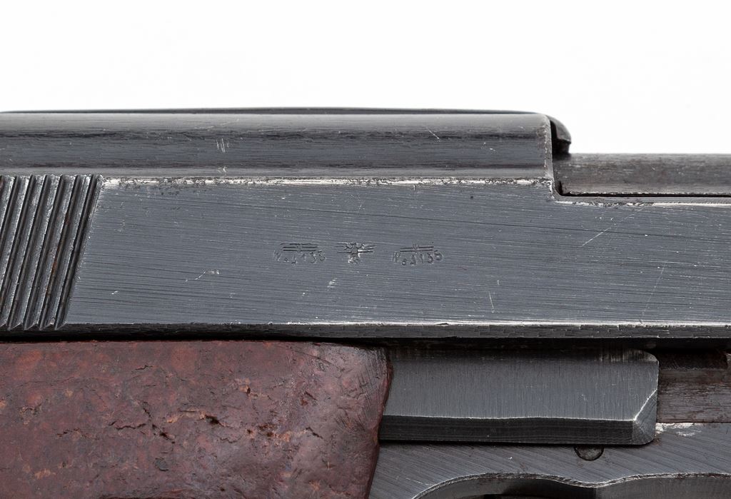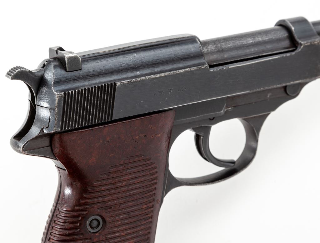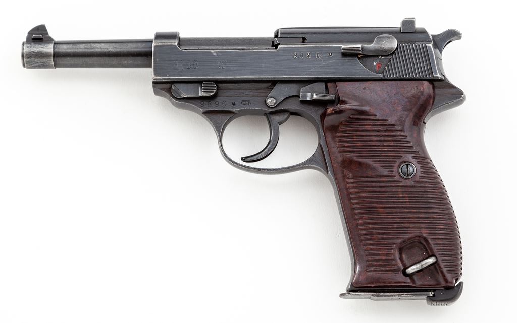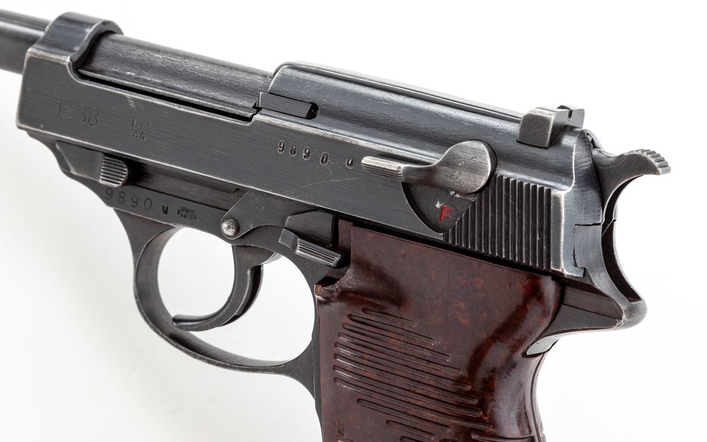 WWII P.38 Semi-Automatic Pistol, by Mauser (byf/44), #9890u, 9mm, 4-7/8'' barrel, blue finish, brown phenolic resin grips, with one ''P.38v'' marked magazine. Condition is excellent retaining approx. 94% original blue with light general thinning to highpoints and near muzzle from holster wear; magazine retains approx. 65% blue. Brown grips and action are excellent, bore is mirror bright. Est.: $500-$750. (C&R/PPT)