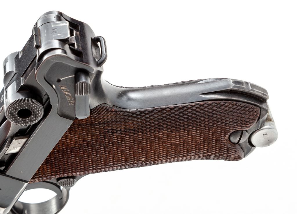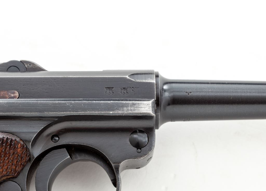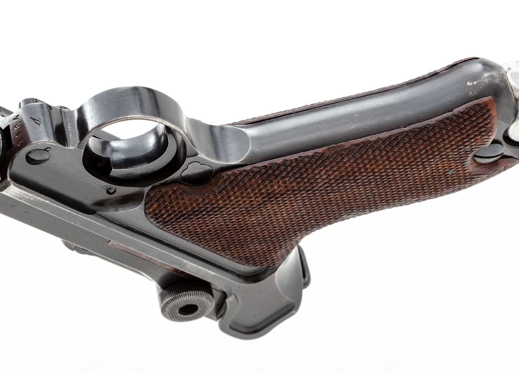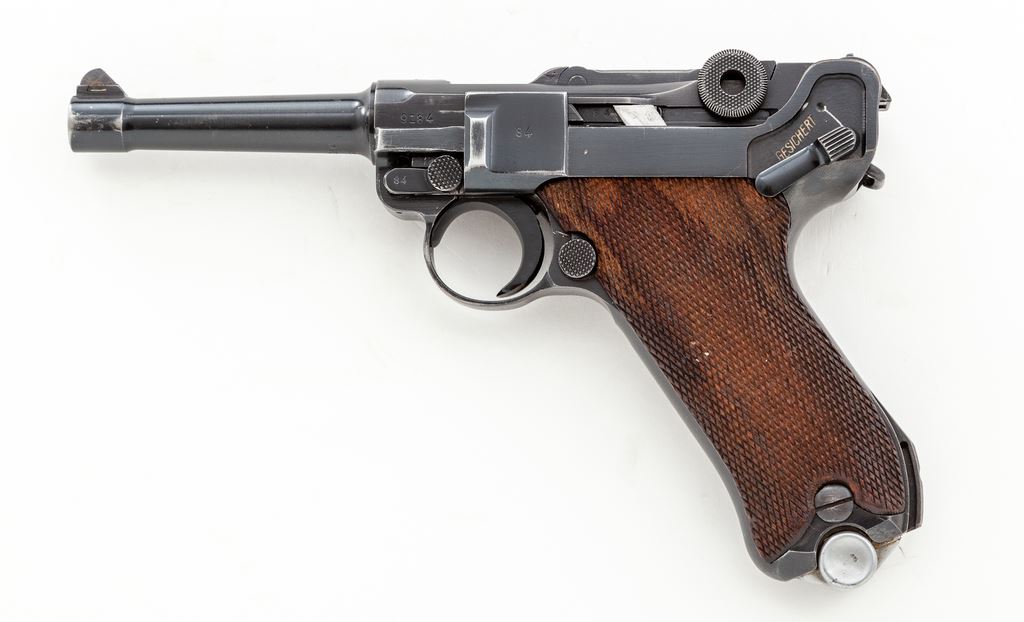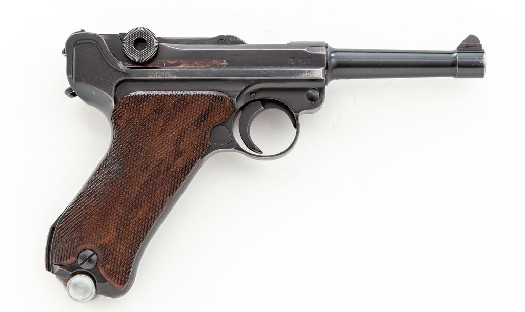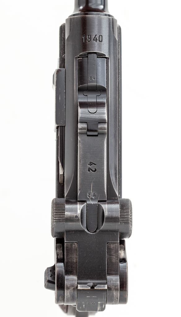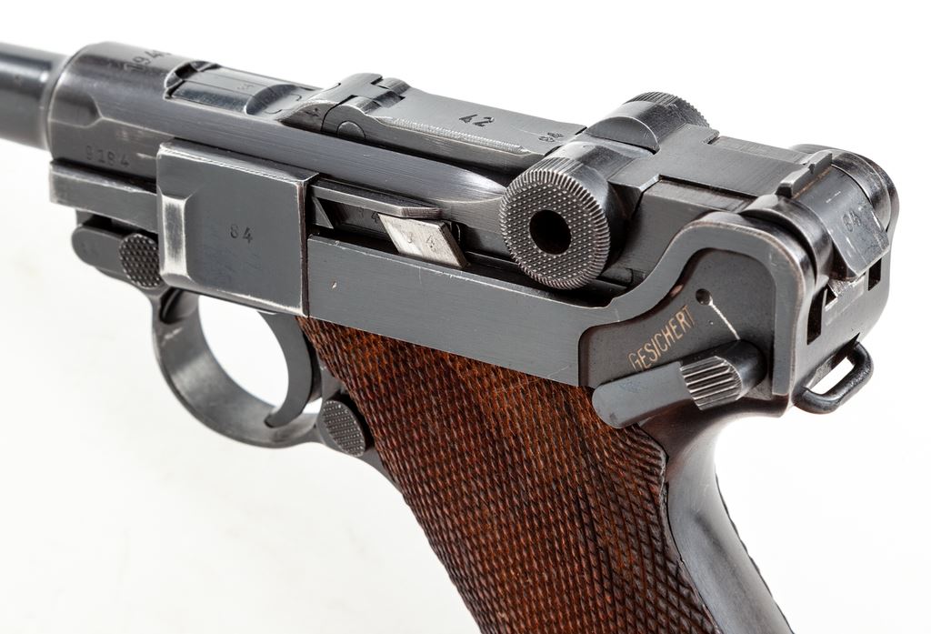 WWII German Mauser 42 Code P.08 Luger, #9184d, 9mm, 4'' barrel, blue finish, factory checkered walnut grips, with earlier mismatched magazine. Chamber dated 1940, toggle coded 42, with all visible matching numbers; thumb safety marked ''Geischert'', extractor marked ''Geladen''. Condition is fine retaining approx. 94% blue, with wear at muzzle, forward edges of frame, triggerguard, and high edges of sideplate. Front and back strap have thinned to approx. 80%. Grips are very good with minor losses to checks and even general overall thinning. Good action, very good bore. Est.: $1,200-$1,800. (C&R)