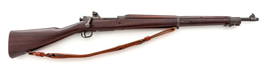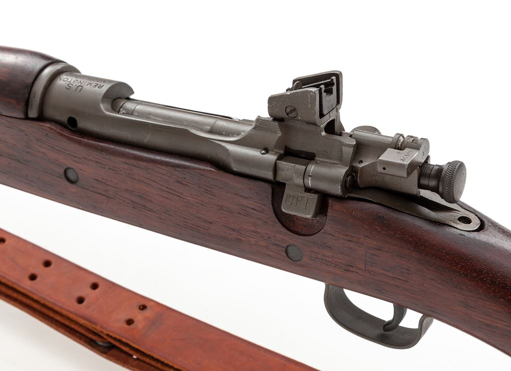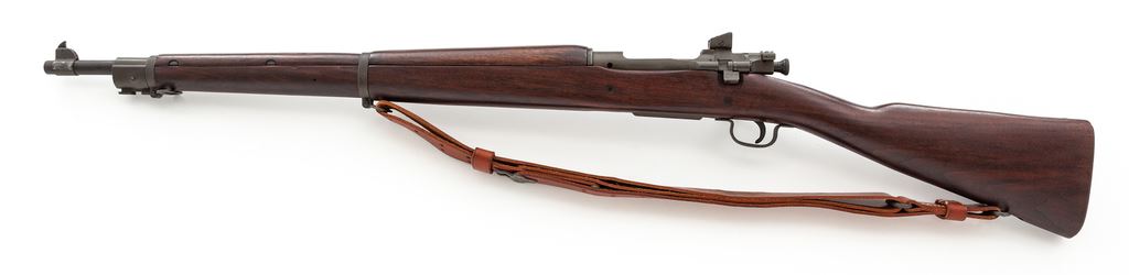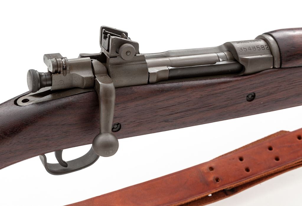 Remington Model 1903-A3 Bolt Action Rifle, #3548582, .30-06 cal., 24'' barrel, parkerized finish, walnut stock, blade front sight and aperture on ramp rear sight. Marked on receiver ring ''U.S.REMINGTON MODEL 03-A3'', and on barrel behind front sight ''RA''/(flaming bomb)/3-43''. U.S. Ordnance Dept ''wheel'' and partial boxed ''FJA'' cartouche on left side of stock, along with an additional ''RA'' stamp. Circle ''P'' firing proof on underside of wrist and small inspection stamps on forend forward of triggerguard. Condition overall is very good with metal surfaces retaining over 95% of its green-colored finish. Handguard has been lightly sanded, and stock has a mostly even color with scattered impressions and some light scratches. Action is smooth, bright bore is excellent with strong rifling. Includes a reproduction U.S.G.I. leather sling in very good condition. Est.: $500-$700. (C&R)