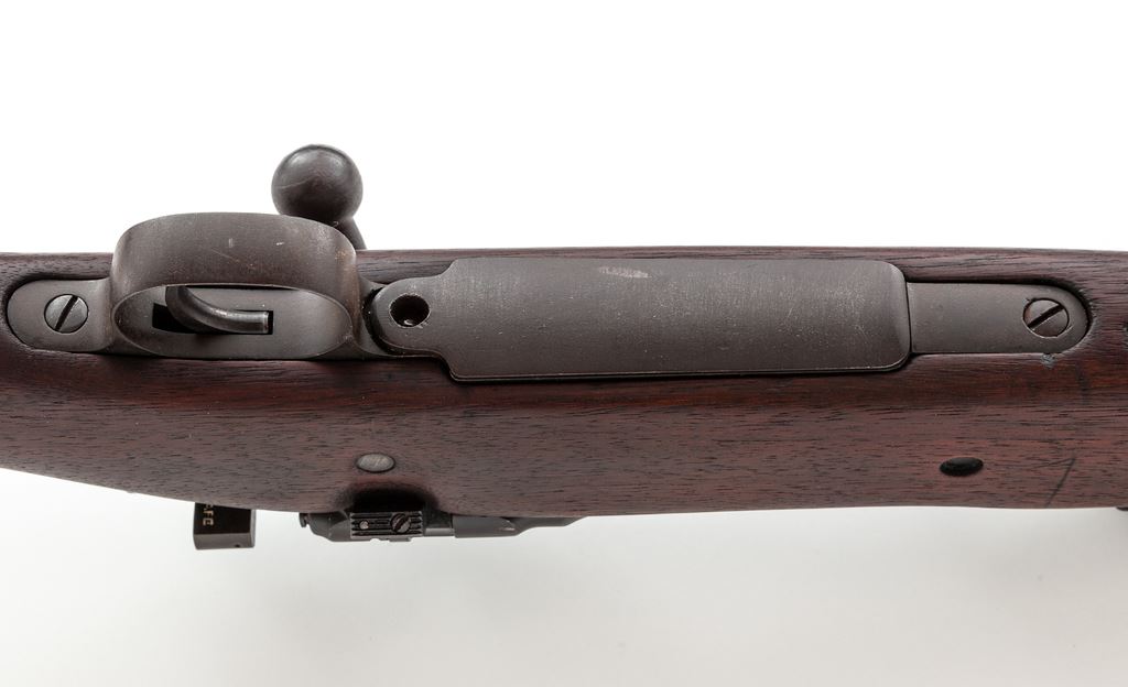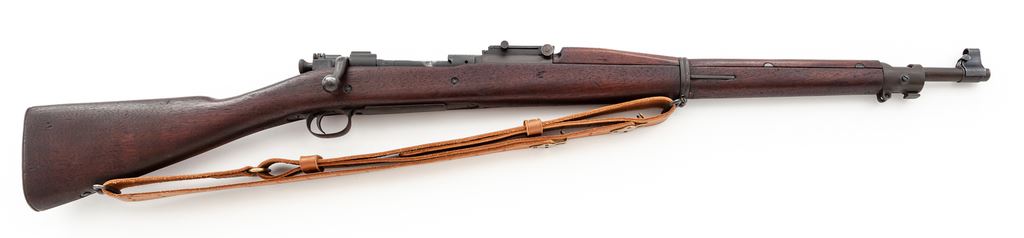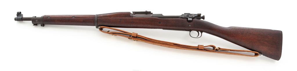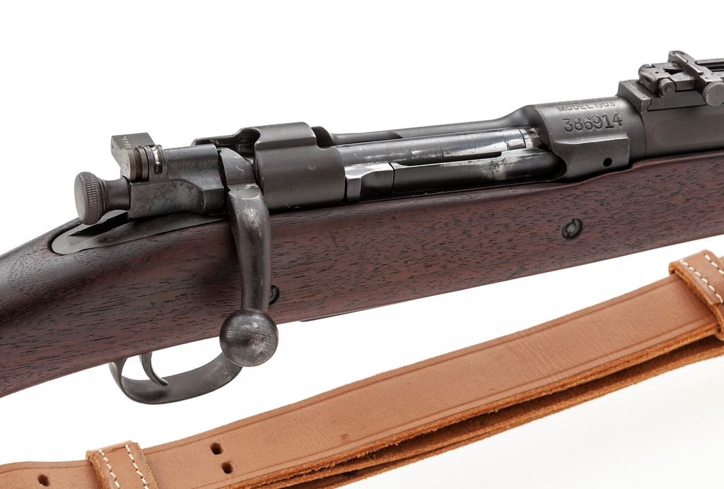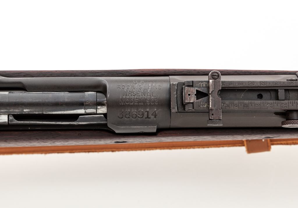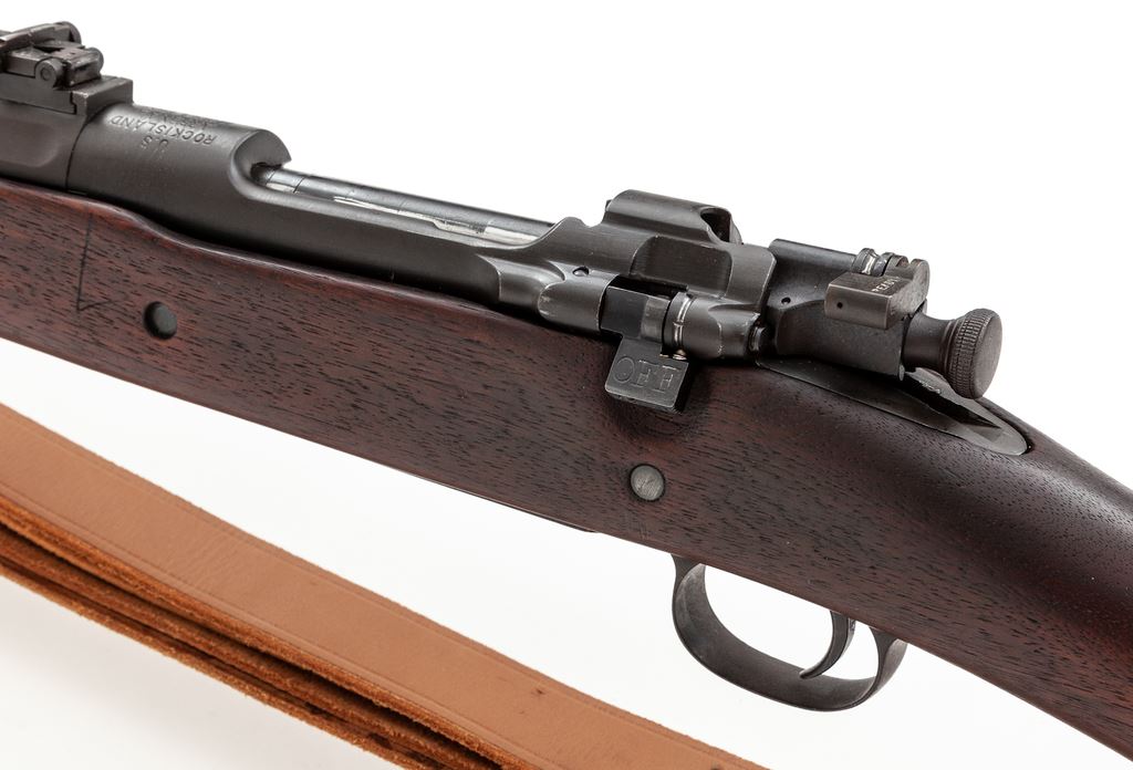 Rock Island Model 1903 Bolt Action Rifle, #386914, .30-06 cal., 24'' barrel, parkerized finish, walnut stock, blade front sight with added protector and leaf with aperture battle sight. Marked on receiver ring ''U.S. ROCK ISLAND ARSENAL MODEL 1903'', and on barrel behind front sight ''SA/(flaming bomb)/1-34. Faint unreadable cartouche on left side of stock. Two ''P'' firing proofs on underside of wrist. Stacking hook has been removed. Condition overall is very good with approx. 90% finish remaining on the metal, wear on the bolt, and light patina on the cocking piece. Wood has been sanded and refinished over old handling marks and showing a prominent scratch on left side of forend. Action is smooth, bore is good with darkening at the muzzle and two prominent pits visible below the upper band. Includes a tan reproduction U.S. leather sling stamped ''HOYT 1917'' in new condition. Est.: $500-$700. (C&R)