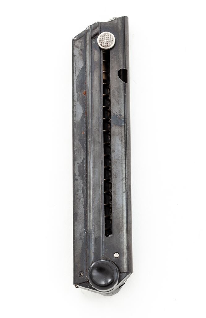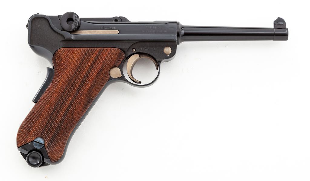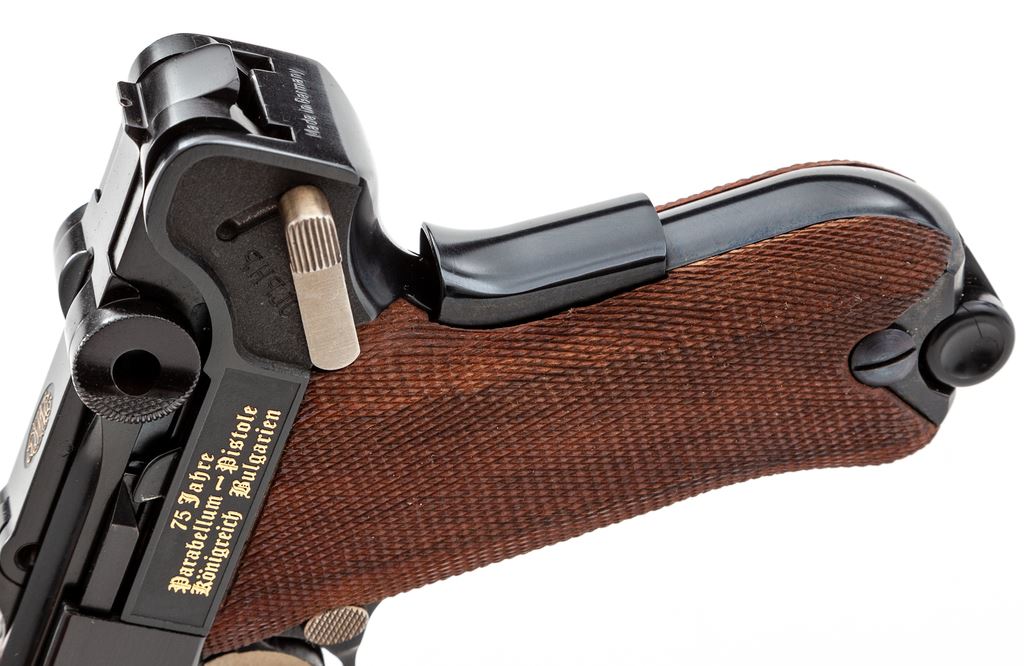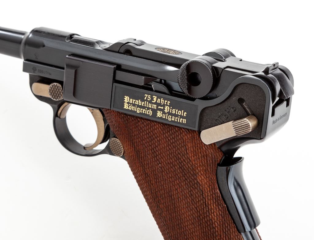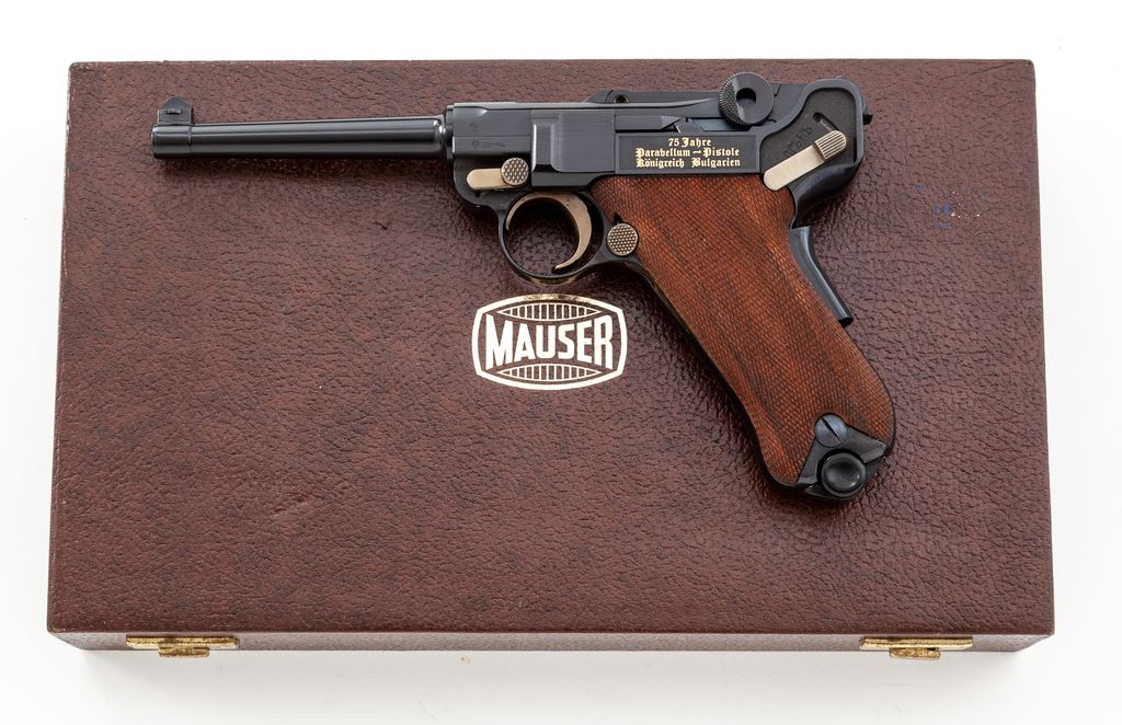 Original Mauser 75-Year Konigreich Bulgarien Commemorative Luger, #119 von 250B, .30 Luger cal., 4.75'' barrel, blue finish, straw-colored small parts, factory checkered walnut grips, with two (2) black plastic based blue magazines. Blank chamber area with gold DWM central toggle link, and left side of frame marked ''75 Jahre/Parabellum-Pistole/Konigreich Bulgarien''; safety markings are in Cyrillic. In original factory brown leatherette case lined in red velvet. Complete with extra magazine, brass cleaning rod, and green Mauser hang tag; cleaning brush is missing. Condition is excellent, appearing as new and unfired. Est.: $800-$1,200. (C&R/PPT)