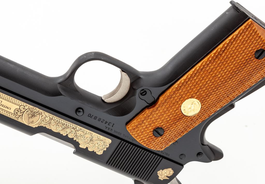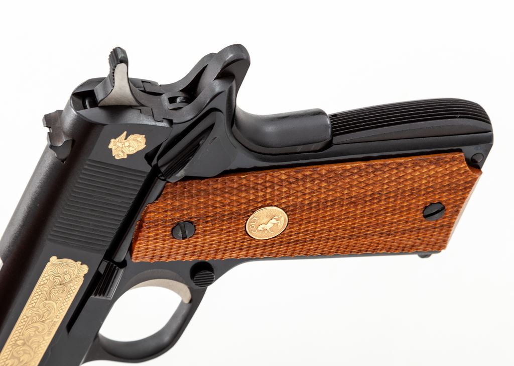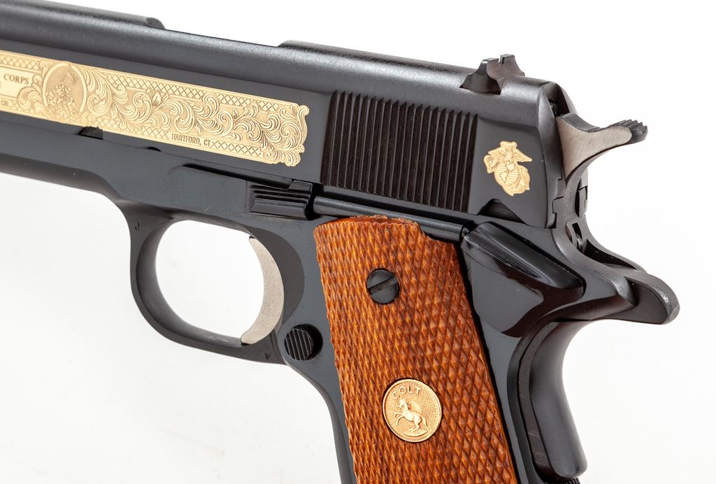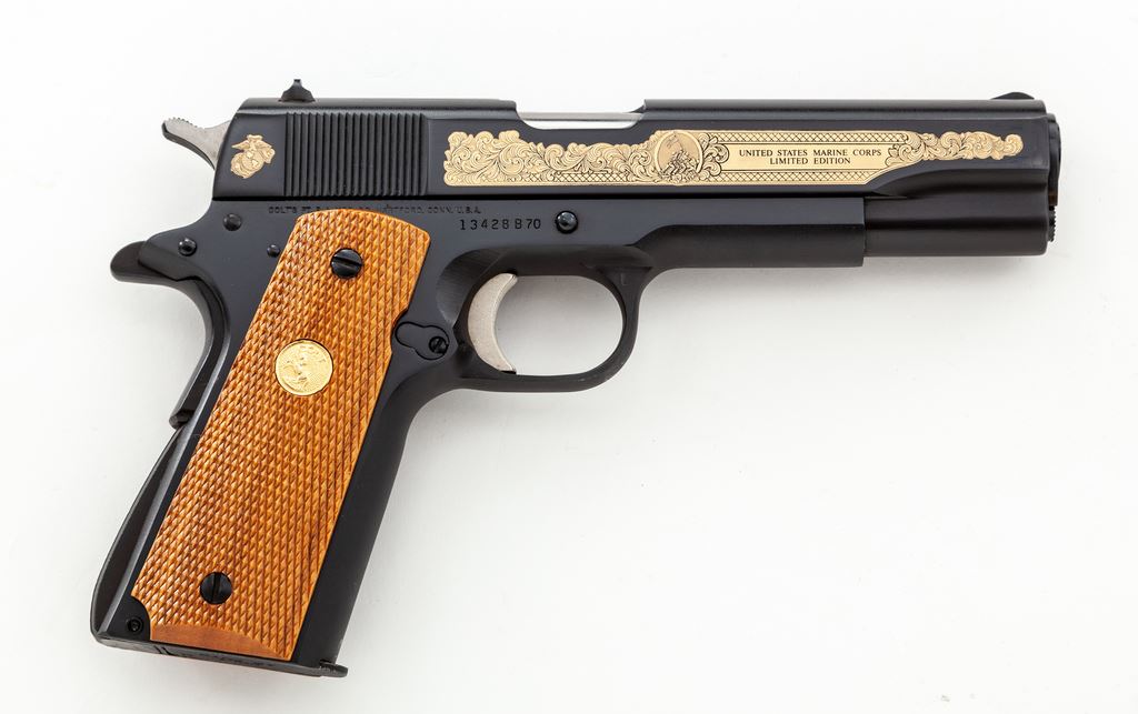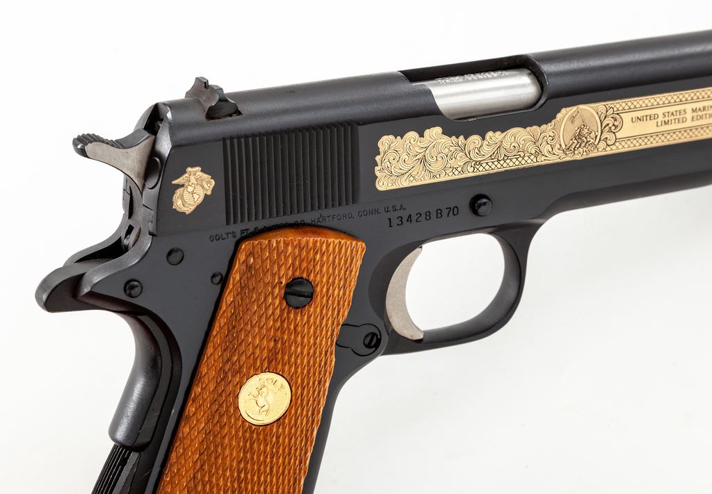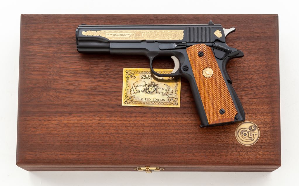 Colt U.S. Marine Corps Commemorative Government Model Semi-Automatic Pistol, MK IV Series 70, #13428B70, .45 ACP cal., 5'' barrel, blue finish, checkered wood grips with gold Colt medallions, standard fixed sights, and one Colt magazine. Both sides of slide are embellished in gold-colored scrollwork and Marine Corp. emblems, etc. In original wood display case with fitted blue velvet interior; commemorative brass plaque and Colt medallion are on the outside of lid. Condition is excellent with approx. 99%+ original blue and gold finishes. Grips appear as new with clean sharp checkering and bright gold medallions. Action is smooth with a mirror bright bore. Case is excellent; exterior shows only a few very minor spots of storage wear; brass plaque with light micro-scratching. Est.: $1,000-$1,500. (Modern) (Not available to Calif. residents.)(Sierra Sid's Casino, Sparks, NV.)