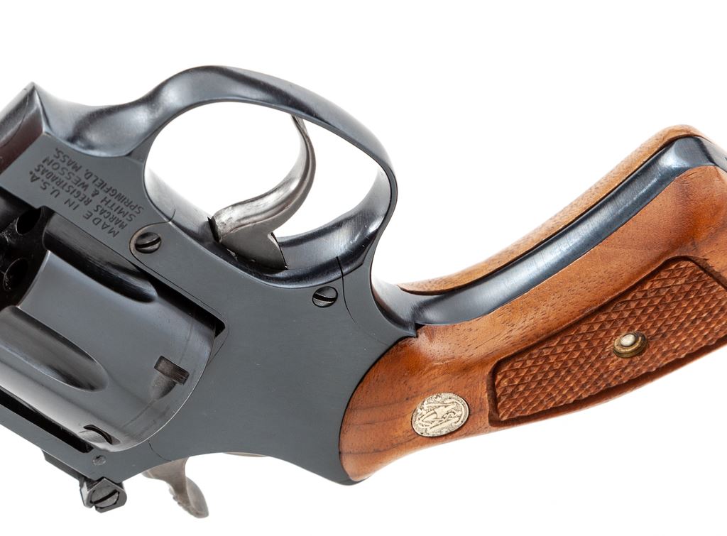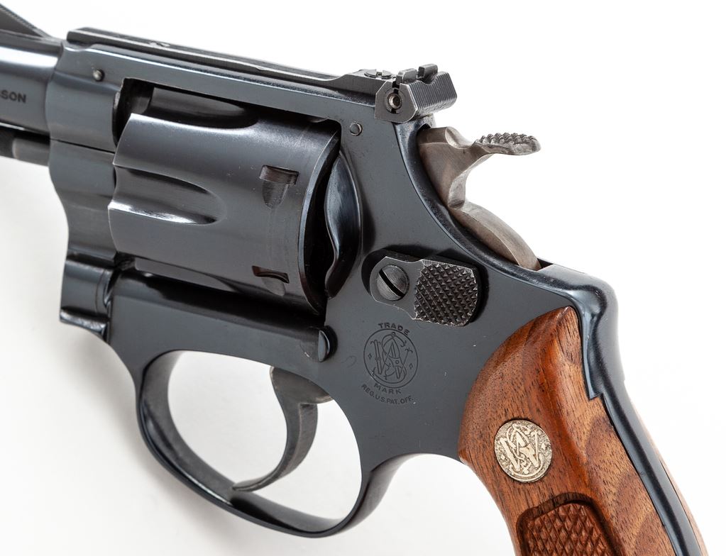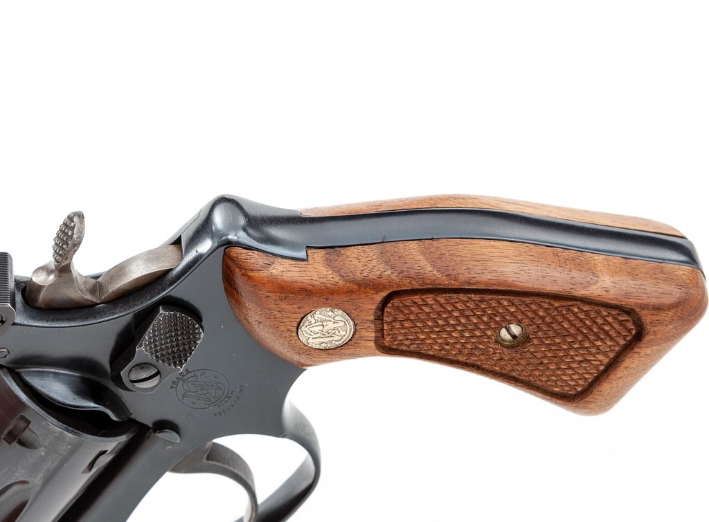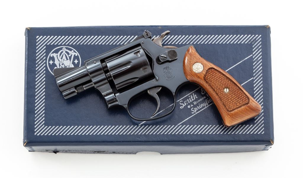 Smith & Wesson Model 34-1 .22/32 Kit Gun, #M174240, .22 LR cal., 2'' pinned barrel, blue finish, factory checkered walnut grips with S&W medallions, and factory adjustable rear sight. In original box with accessories. Condition is excellent with very light index mark to cylinder. Grips are like new. Action and bore are excellent. Est.: $500-$750. (Modern/PPT)