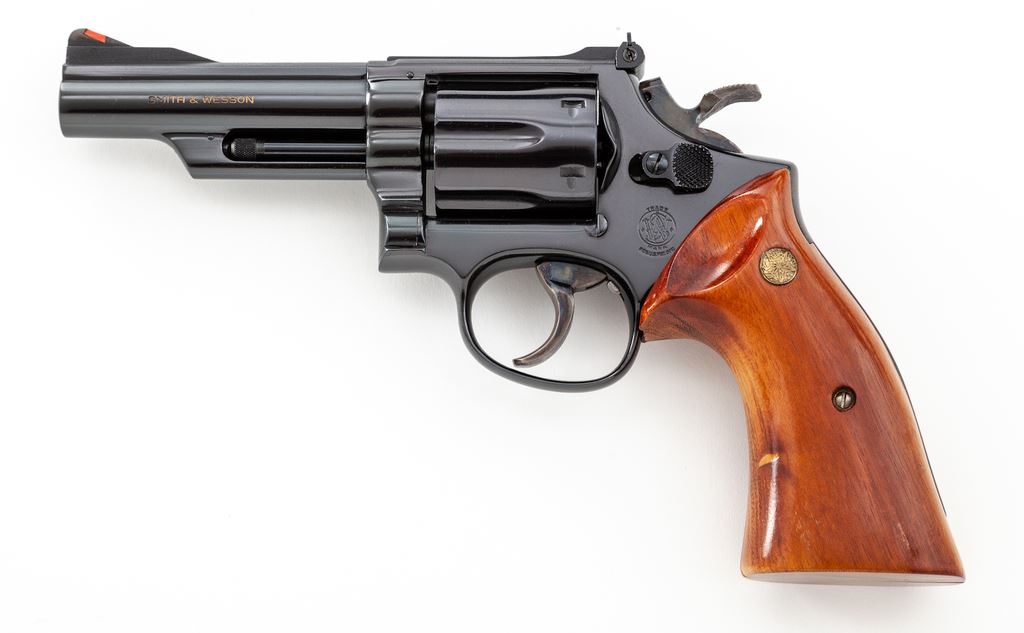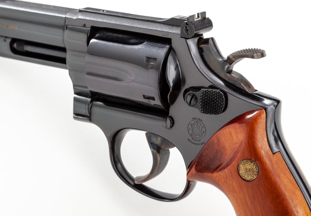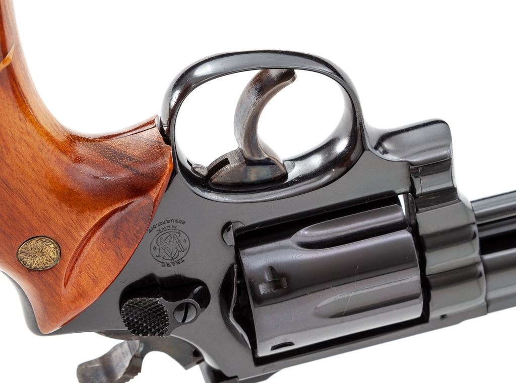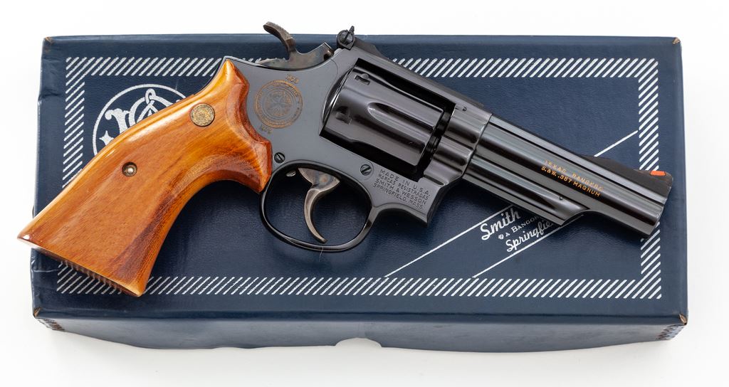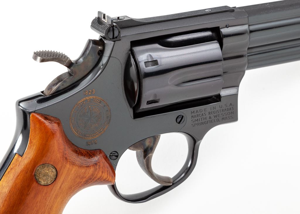 Smith & Wesson Model 19-3 Texas Ranger Commemorative Double Action Revolver, #TR1906, .357 mag. cal., 4'' pinned barrel, blue finish, smooth wood target grips with Texas Ranger medallions, red ramp front sight, white-outline adjustable rear sight, with color case hardened wide spur checkered hammer and wide smooth trigger. Right sideplate with Texas Ranger commemorative logo in gold. In original two-piece box with matching end label and sealed cleaning kit. Metal surfaces rate excellent with approx. 98% original blue and bright case colors; cylinder with a thin light index line and some general micro-scratching; factory lettering is clear. Revolver was used as a display in the casino causing the grips to fade, with an added coat of varnish; left grip with a small wood filler type repair, otherwise both show only minor handling marks. Action is smooth with an excellent bore. Box is very good. Est.: $600-$800. (C&R)(Sierra Sid's Casino, Sparks, NV.)