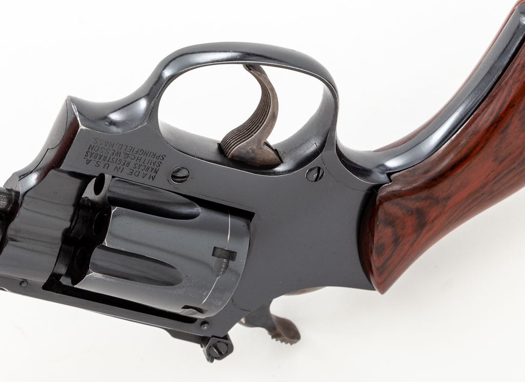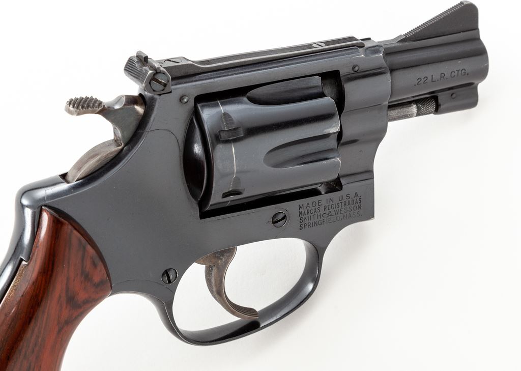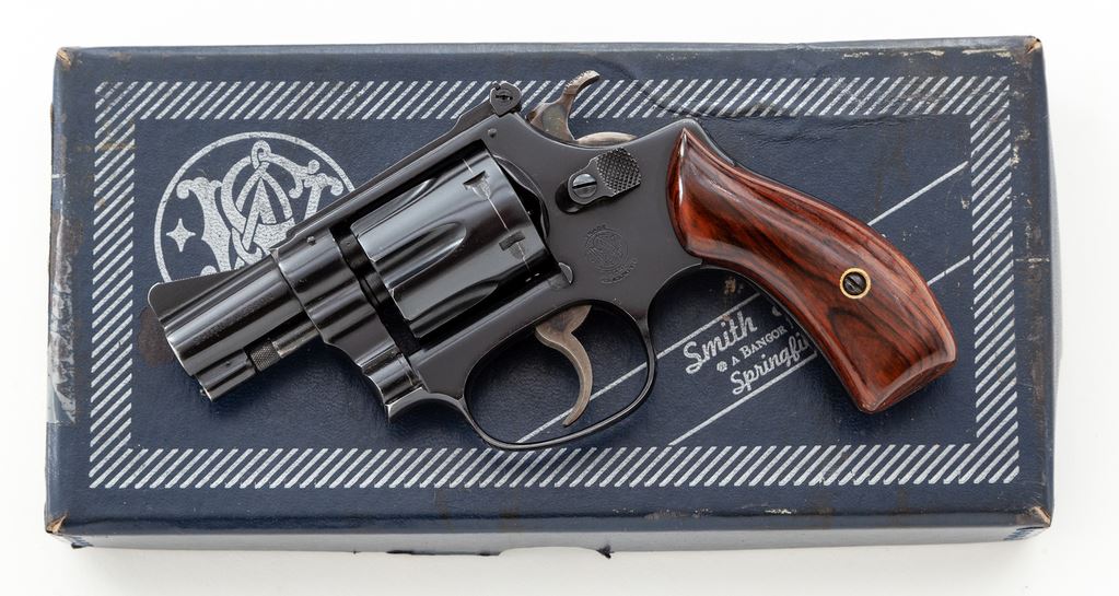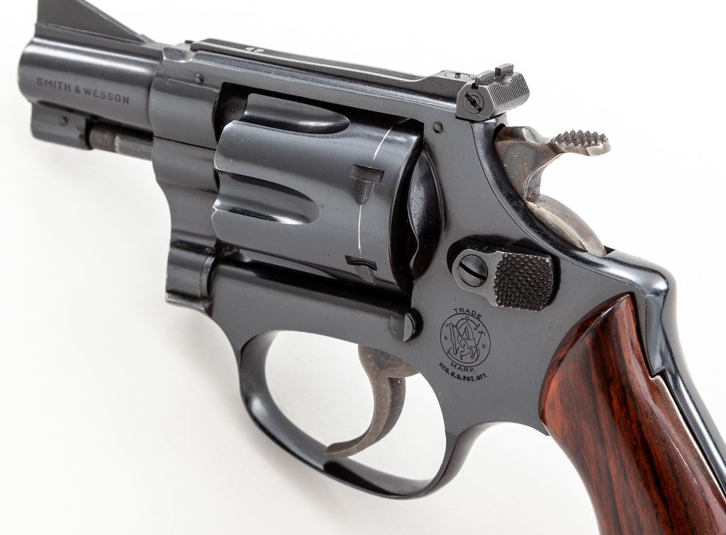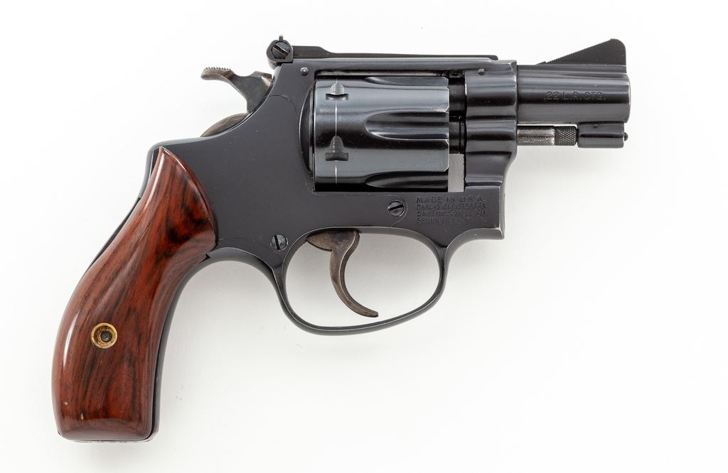 Smith & Wesson Model 34-1 Double Action Revolver, #102807, .22 LR cal., 2'' pinned barrel, blue finish, smooth rosewood grips, and factory adjustable rear sight. In period-correct box not numbered to gun. Condition is excellent with light index mark to cylinder. Grips are like new. Action and bore are excellent. Est.: $500-$750. (Modern/PPT)