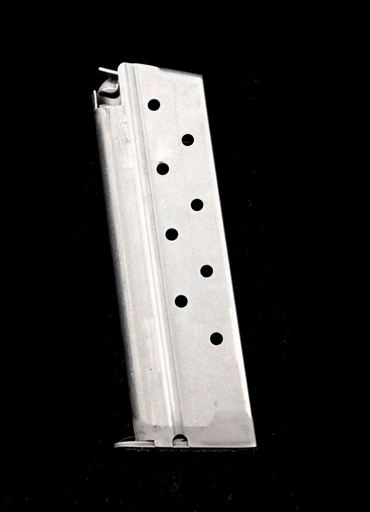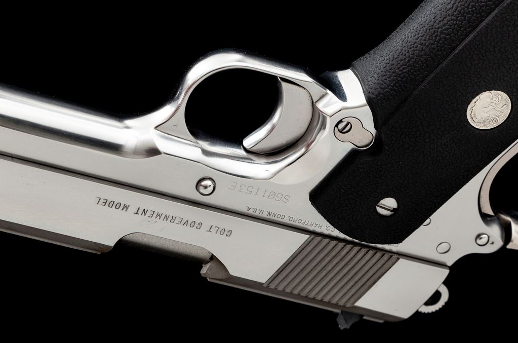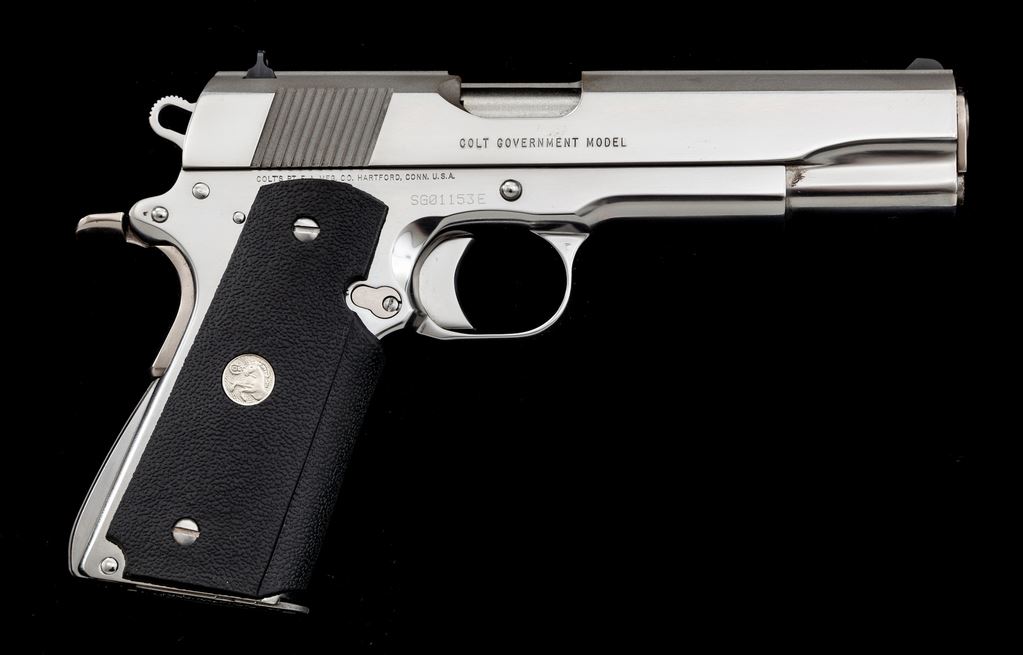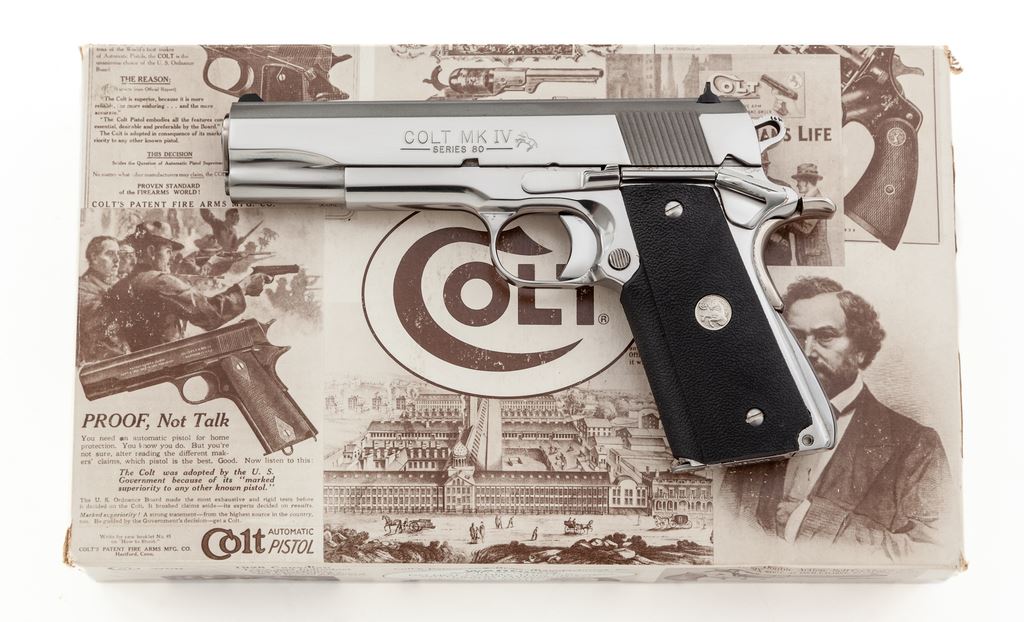Colt MK IV Series 80 Government Model Semi-Automatic Pistol, #SGO1153E, .38 Super cal., 5'' barrel, bright stainless, factory wraparound pebbled rubber grips, with two (2) factory magazines, hang tag and instructions, all in original blue plastic box, with ''The Legend Lives'' slipcover numbered to the gun. Condition is excellent, appearing as new. Est.: $1,000-$1,500. (Modern/PPT)