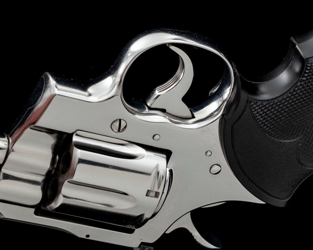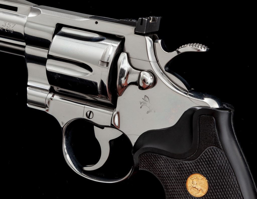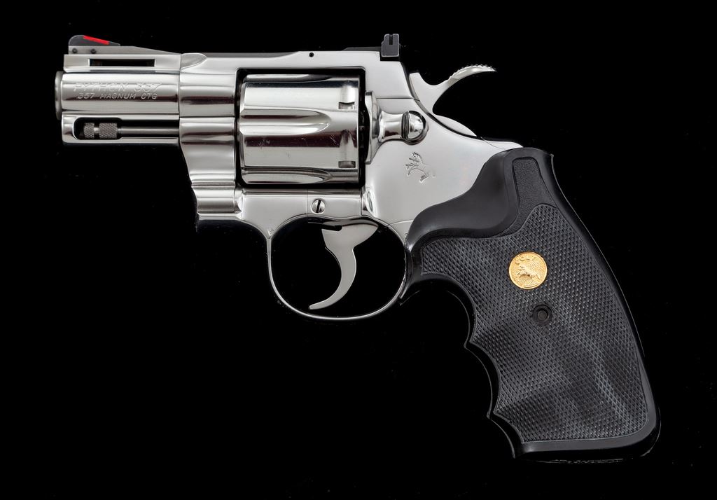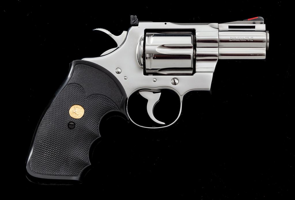 2.5'' Stainless Colt Python Double Action Revolver, #T33159, .357 mag. cal., 2.5'' vent rib barrel, checkered black rubber Pachmayr ''Gripper'' grips with finger grooves and gold Colt medallions, red ramp front sight, and white outline adjustable rear sight. Mfg'd 1984. Revolver shows signs of light range use and rates fine to near excellent overall. Metal with general light micro-scratching and small handling marks. Cylinder with a light and thin index line; face with mild burn rings. Grips are excellent with bright medallions and show slight marks from handling. Action is smooth and crisp with and excellent bore. Est.: $3,000-$4,500. (Modern/PPT)