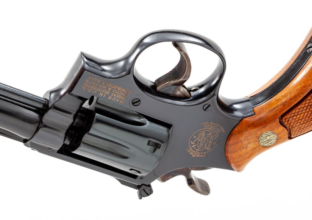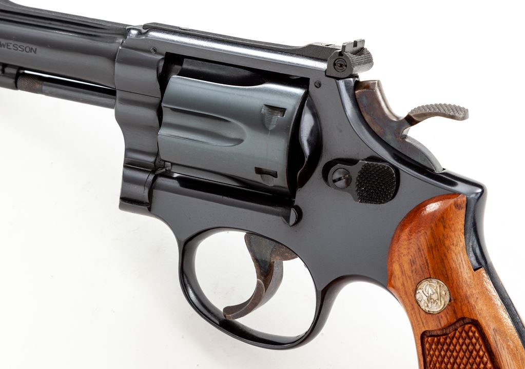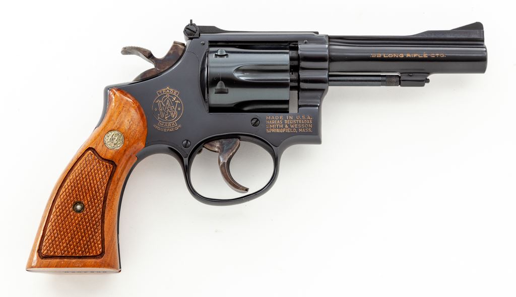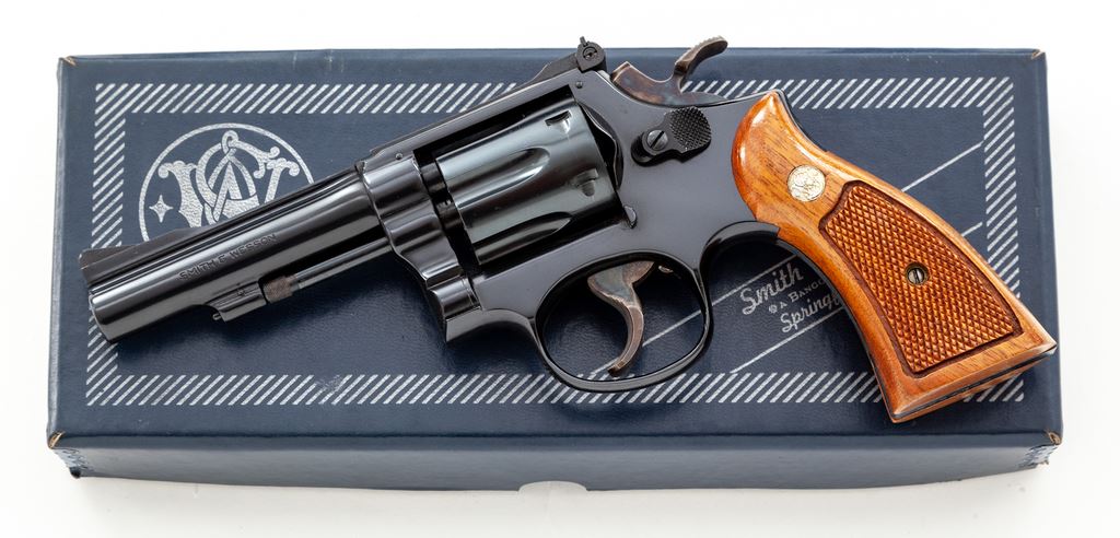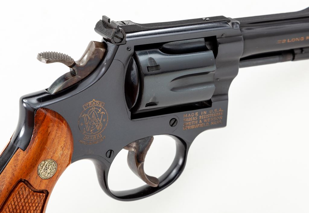Smith & Wesson Model 18-3 .22 Combat Masterpiece Double Action Revolver, #8K54020, .22 LR cal., 4'' pinned barrel, blue finish, case hardened wide target hammer and trigger, factory checkered square butt walnut magna grips with S&W medallions, Baughman Quick Draw front sight, with micrometer click adjustable rear sight. In original blue two-piece S&W factory box numbered to the gun with misc. factory paperwork (no owner's manual), S&W packing paper, and opened cleaning accessories. Mfg'd 1975. Factory lettering on the right side has been highlighted in gold. Grips are numbered #41626. Approx. 98%+ original blue finish remains and revolver rates as excellent overall. Metal with scattered micro-scratching and slight handling marks; cylinder with a thin index line. Factory lettering is clear and well defined. Hammer and trigger retain 98%+ deep rich case colors. Grips with a nice even finish and color, both showing a few shallow marks from handling; checkering is clean and sharp. Action is crisp with a smooth hammer and trigger; bright bore is excellent. Box shows normal light storage wear. Est.: $700-$900. (Modern) (Not available to Calif. residents.)(Sierra Sid's Casino, Sparks, NV.)