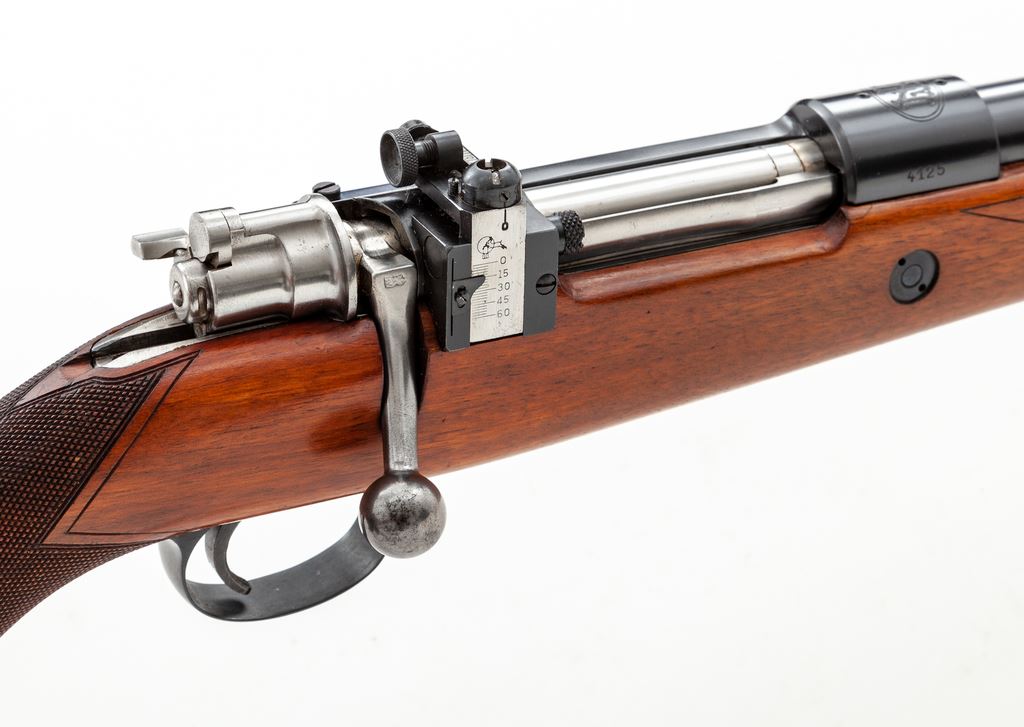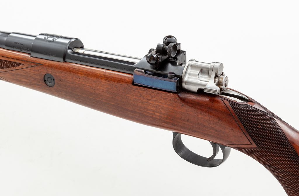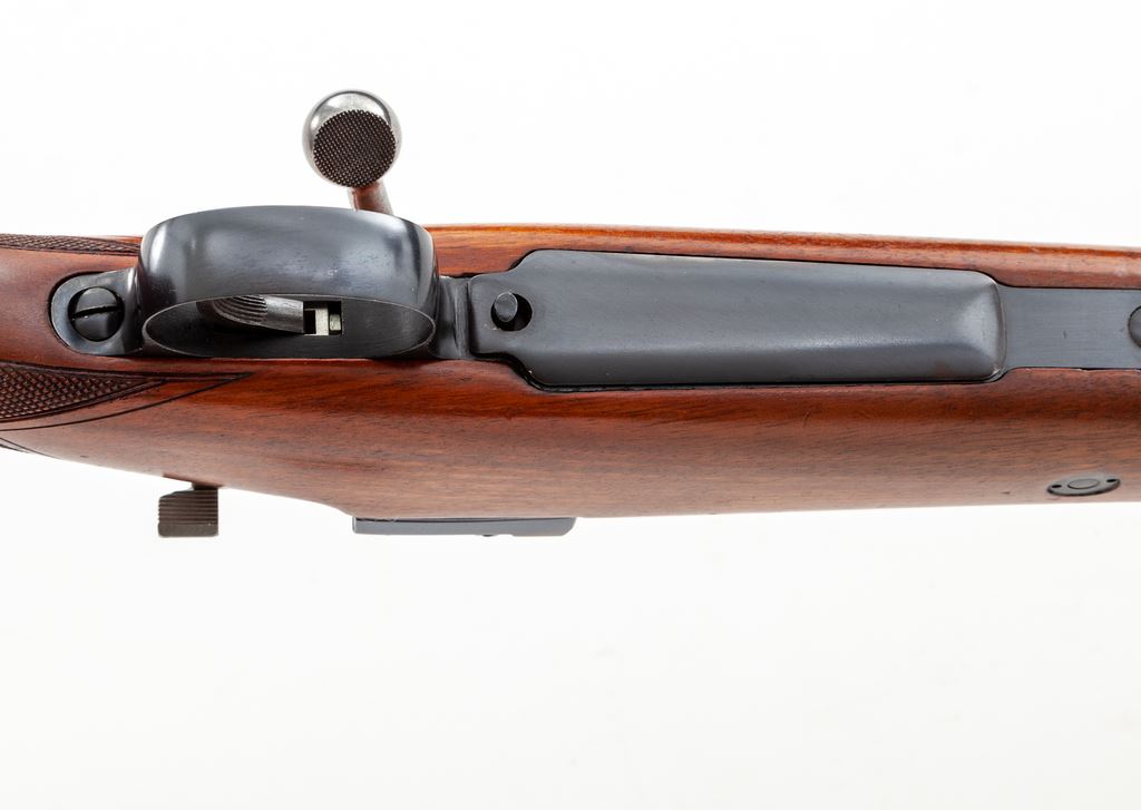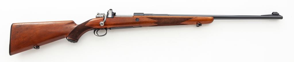 Belgian Browning FNH 98 Bolt Action Rifle, #4125, .30-06 cal., 24'' barrel, blue finish, polished bolt, sling swivels, factory checkered cheekpiece walnut stock, with Lyman receiver sight and standard ramp front sight. Condition is excellent, dating from the early 1960s, retaining approx. 97%+ factory blue, with most of the losses to the niter-blue bolt release and some thinning to the magazine floorplate and high edges of triggerguard. Finely checkered stock with very mild scuffs and several minor aberrations to pistol grip checkering. Crisp action, mirror bright bore. Est.: $750-$1,000. (C&R)