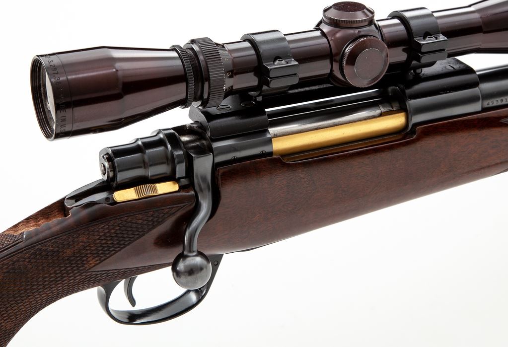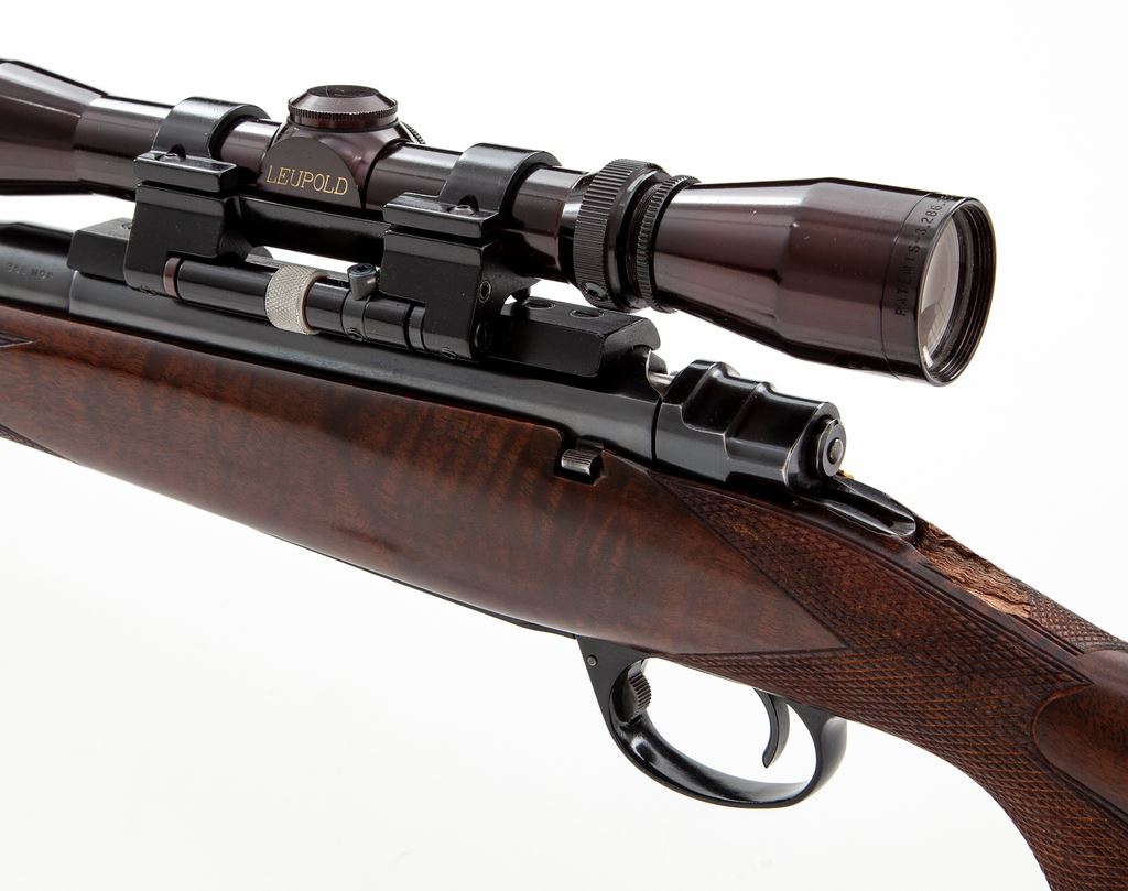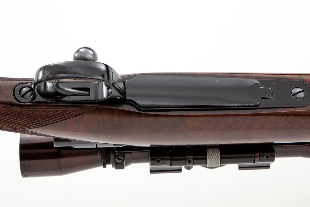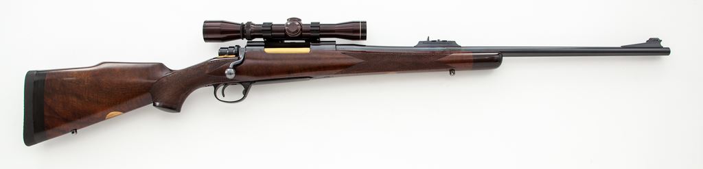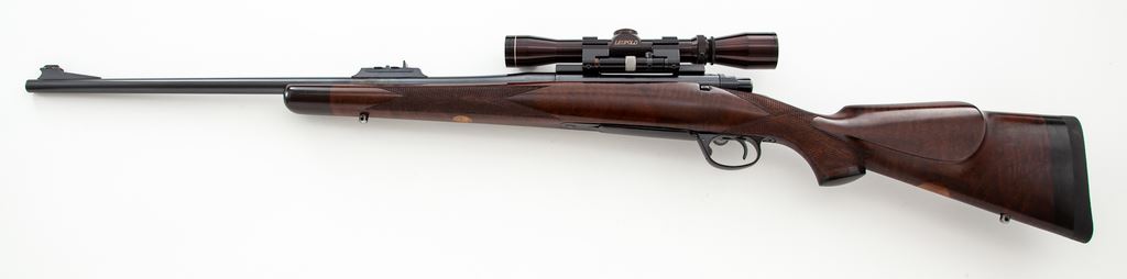 FN Custom Bolt Action Mauser Rifle, #45361, .358 Norma cal., 24'' barrel, blue finish, checkered cheekpiece walnut stock, ebony forend and pistol grip cap, ramp and bead front sight, three-leaf Express rear sight; an African coin is inlaid into the stock, as well as a blank ovoid escutcheon. Topped with a Leupold Vari-X II 2x7 scope on tip-off scope mounts. Condition is near excellent retaining approx. 96% blue. Stock is nicely built, however there is an area approx. 1.25''x.05'' behind the upper tang that has chipped away and needs repair. Scope optics are clear, action is crisp, bore is bright. Est.: $600-$900. (Modern)