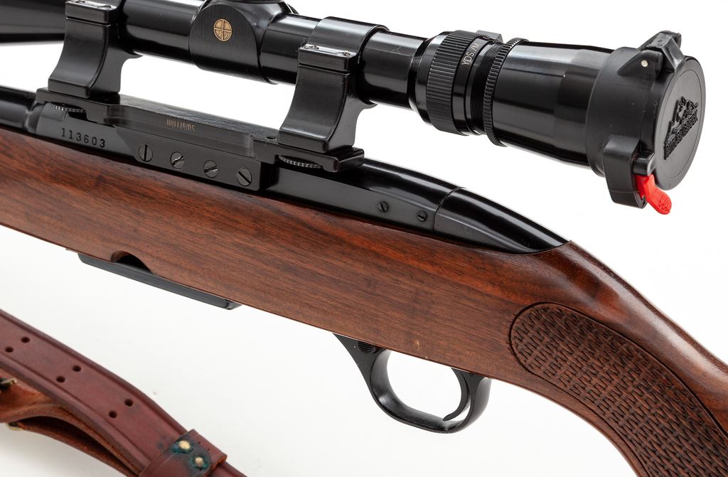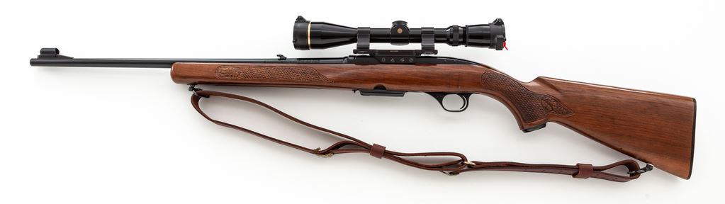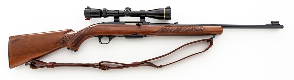 Winchester Model 100 Semi-Automatic Rifle, with Leupold scope, #113603, .308 cal., 22'' barrel, blue finish, basket weave pattern press checkered walnut stock, checkered black composite buttplate, quick-release sling swivels, brown leather sling by Hunter, hooded silver bead front sight and folding rear sight, with one factory magazine. Topped with a Williams scope base and Leupold Vari-X III 3.5x10 scope; scope with duplex reticle and plastic Butler Creek lens covers. Top of the barrel and receiver are both Winchester proofed. Mfg'd 1965. Approx. 98%+ original blue finish remains and the metal surfaces rate as excellent overall; barrel address with crisp raised edges. One-piece stock rates as fine with intermittent normal small impressions from handling and use; press checkering is clean and shows no visible wear. Action is smooth with a bright bore. Scope also rates excellent with bright, clear optics. Est.: $600-$800. (C&R)
