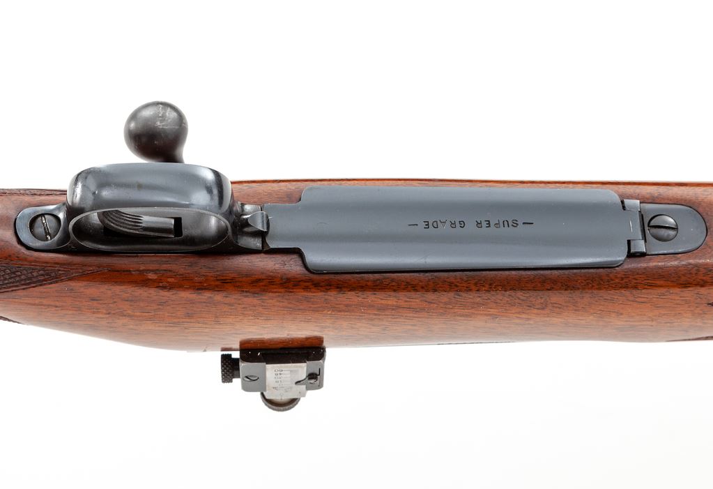Winchester Pre-64 Super Grade Model 70 Bolt Action Rifle, #67447, .30-06 cal., 24'' barrel, blue finish, checkered cheekpiece walnut stock, with ebony forend cap and hard rubber Winchester pistol grip cap; red Winchester butt pad is present. Floorplate is factory marked Super Grade''; pistol-grip checkering extends completely around wrist. Factory sling swivels are present. Mfg'd 1947. Condition is excellent retaining approx. 96% factory blue. Rear sight dovetail is neatly plugged with dovetail blank; Redfield receiver sight is in place. Stock with only the most minor thinning and flattening to checks. Good action, bore is as new. Est.: $1,800-$2,400. (C&R)