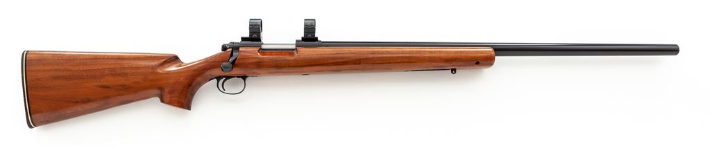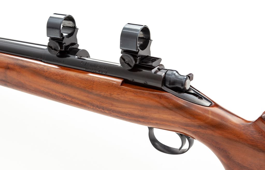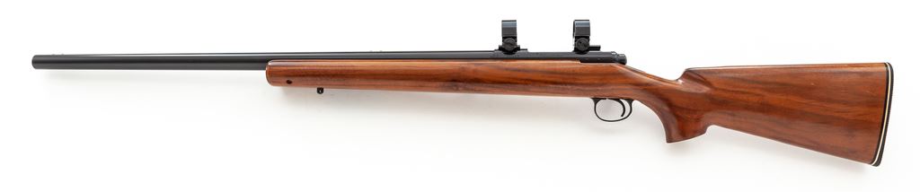 Remington Model 40-X Single Shot Bolt Action Rifle, #32016B, .222 Rem. cal., 28'' medium-weight barrel, blue finish, smooth pistol-grip walnut stock with fluted comb, factory buttplate, and Weaver rings and mounts. Condition is excellent retaining approx. 98%+ original blue. Stock with very minor marks to cheek area. Action is crisp, bore is bright. Est.: $500-$750. (Modern)