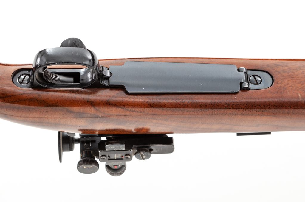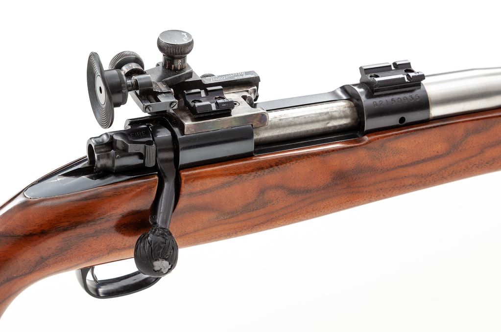 Custom Winchester Model 70 Bolt Action Target Rifle, #G2150935, .223 cal., 27'' medium-weight stainless steel target free-floating barrel by Krieger, glass-bedded stock to blue frame, walnut target cheekpiece stock with adjustable aluminum buttplate and handstop; Redfield Int'l Match rear sight and modern spirit level globe front sight. Top of receiver has been fitted with a case hardened stripper clip guide, as well as a two-piece Weaver mount. Follower, ramp and bolt are polished. Krieger spec disc is wired to front sling swivel. Condition is excellent as modified. Bolt handle has been dipped in silicone. Stock shows just the lightest marks from range use. One-stage trigger is light and crisp. Finely grooved bore is mirror bright. Est.: $1,200-$1,800. (Modern)