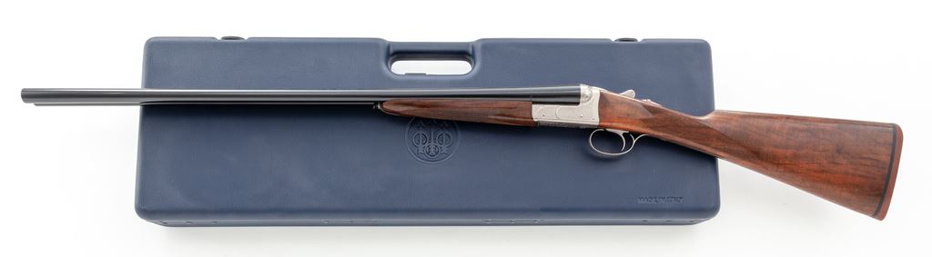 Beretta Model 471 Silver Hawk Side-by-Side Shotgun, #S10371A, 20 ga. 28'' barrels have 3'' chambers and are fitted for Beretta Optima chokes (IC/IM installed). The coin-finished receiver has roll engraving over frame, top tang and triggerguard, with golden hawk inlay on opening lever. Action features single selective trigger, auto ejectors, and non-auto safety. Small forend and straight grip buttstock are nice European walnut with satin finish, good checkering, and a 14.5'' LOP to a solid red recoil pad. Contained in a correct blue plastic Beretta hard case with three extra choke tubes and wrench, oil, parts, and Beretta paperwork. Mfg'd approx. 2005. Condition is like new, with no mars to the wood or metal and little wear to the action. Bores are slightly dirty but otherwise bright. Est.; $1,500-$2,000. (Modern)