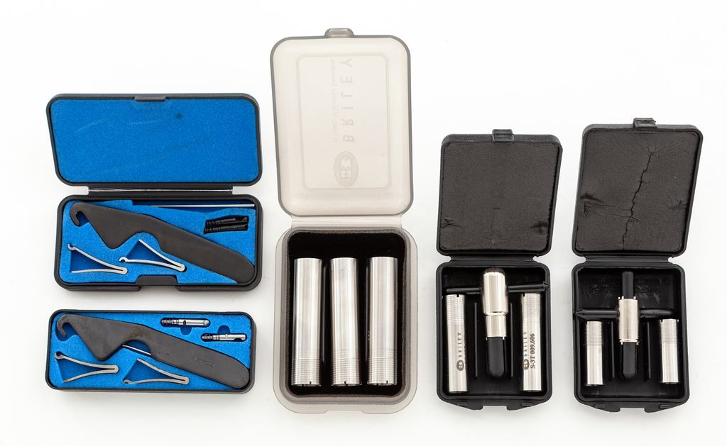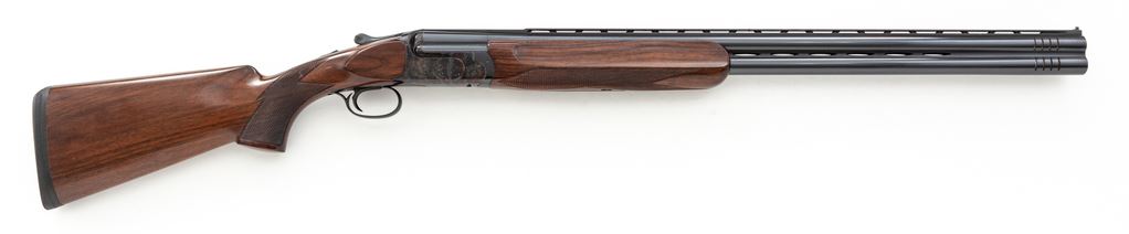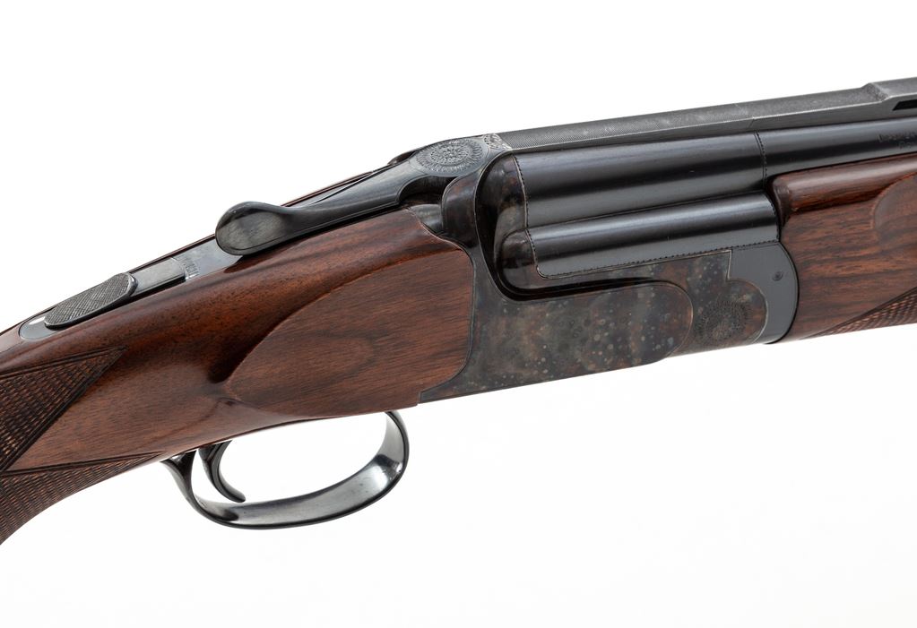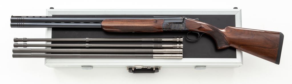 Perazzi Mirage Over/Under Skeet Gun, with small bore tube sets, #56965. 12 ga 27-9/16'' (70cm) barrels have 2-3/4'' chambers, a stepped and tapered vent rib with target beads, a vent rib between barrels, and are fitted for choke tubes, as are all the tube sets (approx. 17 in all). Also includes extra trigger serial numbered to the gun. MX-8 type boxlock action fires bottom barrel first, with non-auto safety and auto ejectors. Semi-beavertail Type 4 forend and pistol-grip buttstock are of Standard Grade walnut, with no grip cap and Kick-Eez recoil pad. Stock dimensions are 13.5''x1.5''x2.5''. Contained in a metal Americase, with paperwork, choke tubes, tools and spare parts. Mfg'd 1990s. Condition is approx. 98%, with only a few small handling marks to wood, no loss of case color, and almost no wear to action. Est.: $4,000-$6,000. (Modern)