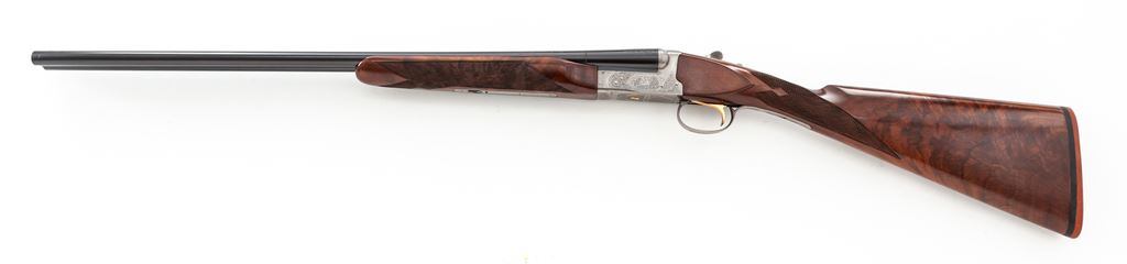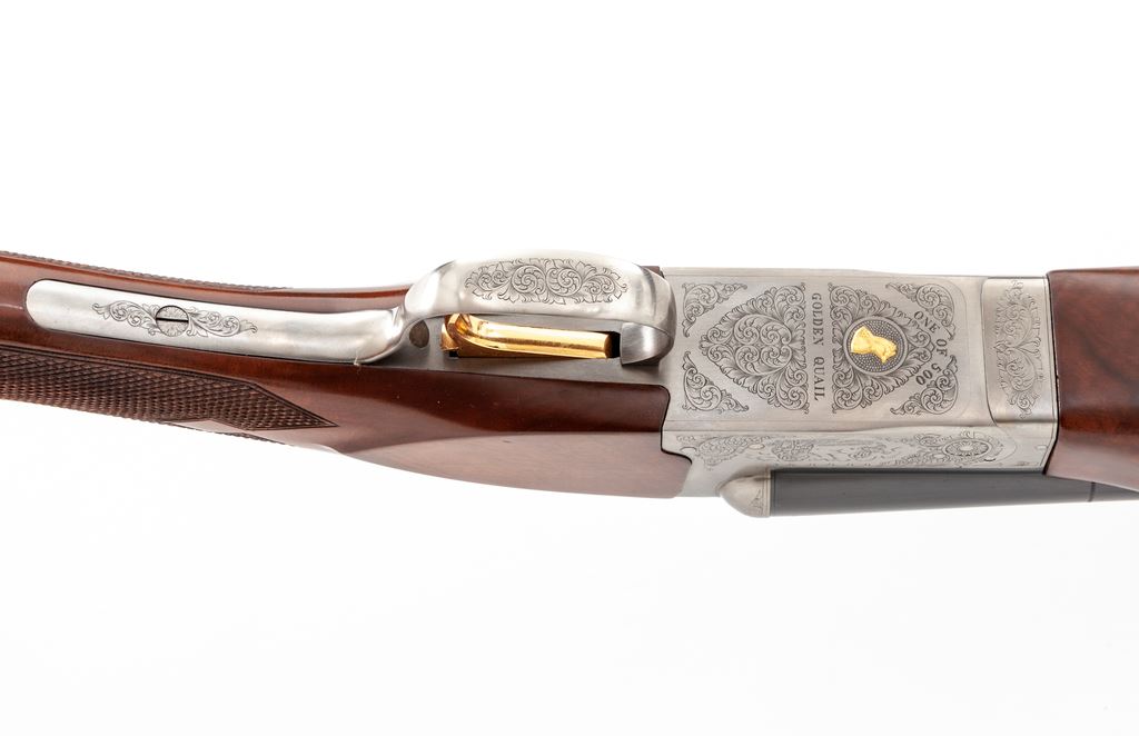 Winchester Model 23 Golden Quail Side-by-Side Shotgun, #GQ-57E, 28 ga. 25.5'' barrels have a concave rib and are choked Quail 1/Quail 2 (IC/M). The coin-finished receiver has engraved scenes of flushing quail on sides, with ''One of 500'' and ''Golden Quail'', gold quail head inlay on bottom, and scroll engraving on balance of receiver, triggerguard, tangs and barrels. Action has gold single selective trigger, machine-turned surfaces, auto ejectors, non-auto safety, and double underlug lock. Beavertail forend and straight grip buttstock are of Presentation Grade walnut with extensive checkering and original Winchester butt pad. Mfg'd approx. 1985. Condition is excellent with little wear to the action, very tight lockup and mirror bores. Est.: $2,500-$3,000. (Modern)