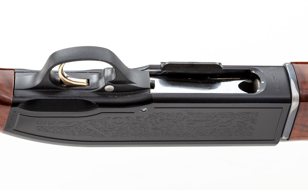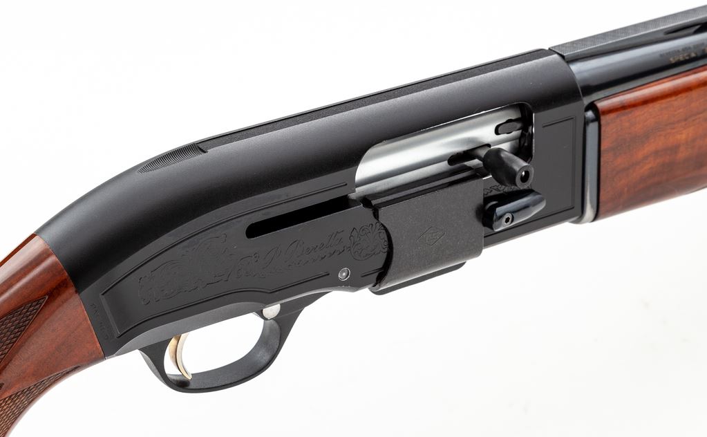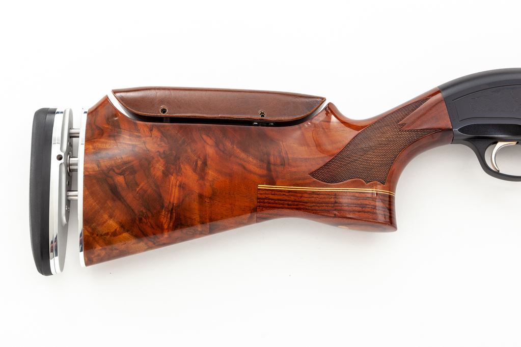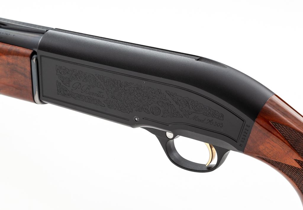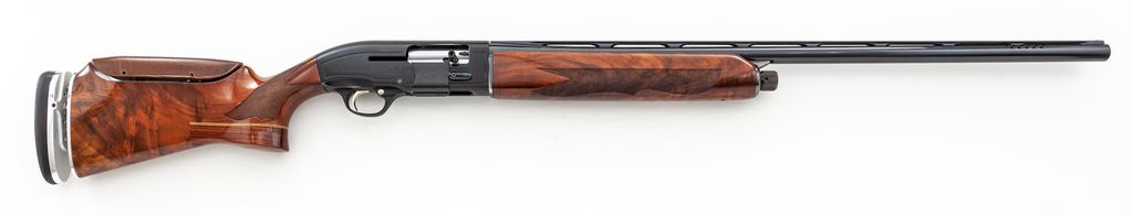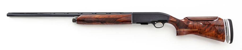 Beretta Model A303 Special Trap Semi-Automatic Shotgun, #M95322E. 12 ga. 30'' ported barrel has wide 10mm vent rib, choked IM., with a 2-3/4'' chamber. Standard A303 action has been modified to add a release trigger, safety delete, large bolt release and shell catcher. Beavertail forend and Monte Carlo buttstock are from Exhibition Grade walnut, with buttstock expertly modified to add a full pistol grip, adjustable butt pad, and an adjustable leather-covered comb. Mfg'd early 1990s. Condition is excellent as improved, with no marks to wood, little action wear, and mirror bore. A very nice custom Trap gun. Est.: $600-$900. (Modern)