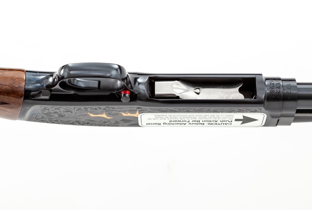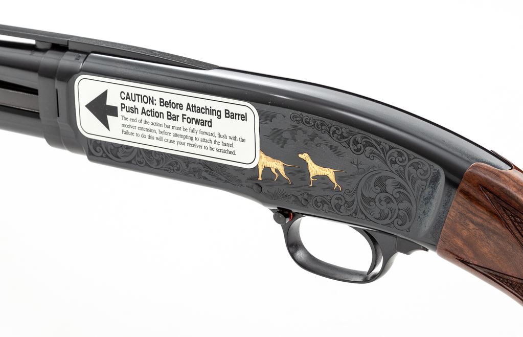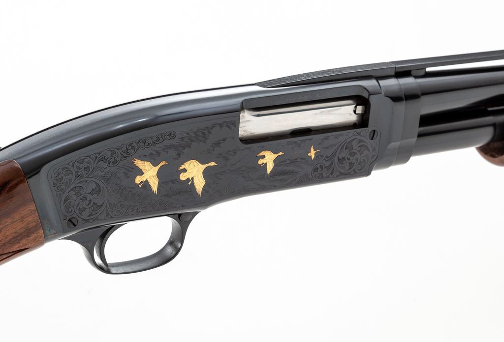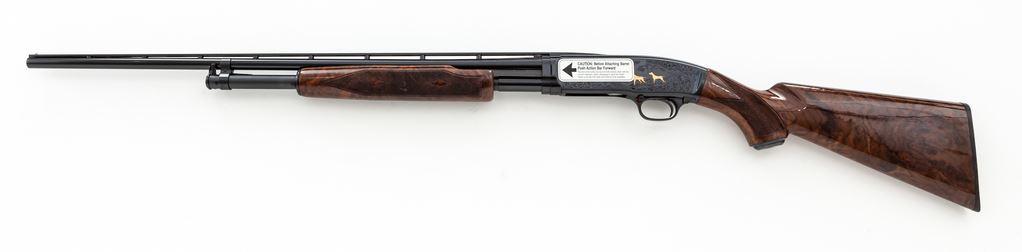 Browning Model 42 Grade V Limited Edition Slide-Action Shotgun, #01729NZ982. .410 bore 26'' vent rib barrel has 3'' chamber and is choked Full. Receiver has elaborate game scene engraving, with gold inlaid ducks on one side and gold inlaid hunting dogs on the other, surrounded by elaborate scrolls. Forend and pistol-grip buttstock are Exhibition Grade walnut with high-gloss finish, checkering done at 22 LPI, with metal grip cap and black Browning buttplate, contained in original box serial numbered to the gun, with all original paperwork. Mfg'd 1991 by Miroku in Japan for Browning. Condition is as new, in original box, appearing unfired. Est.: $1,200-$1,500. (Modern)