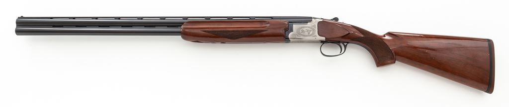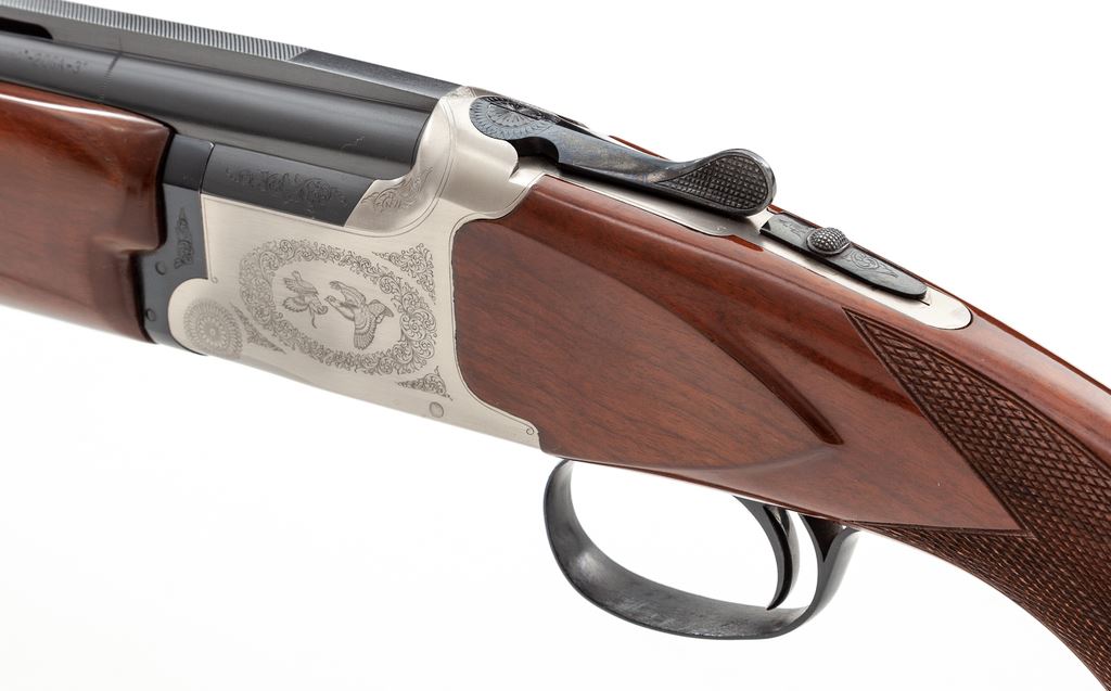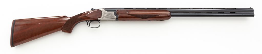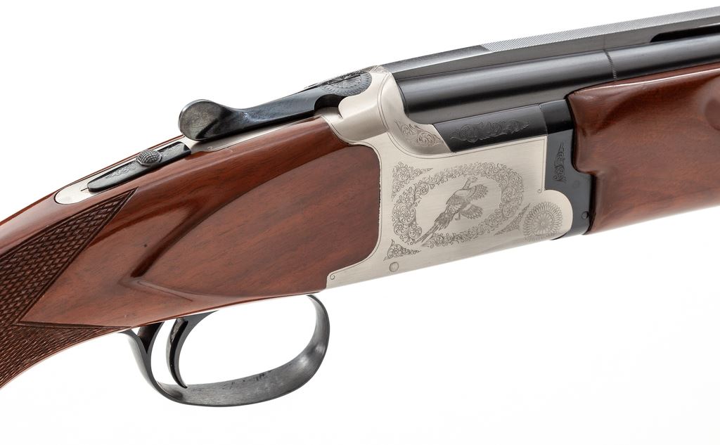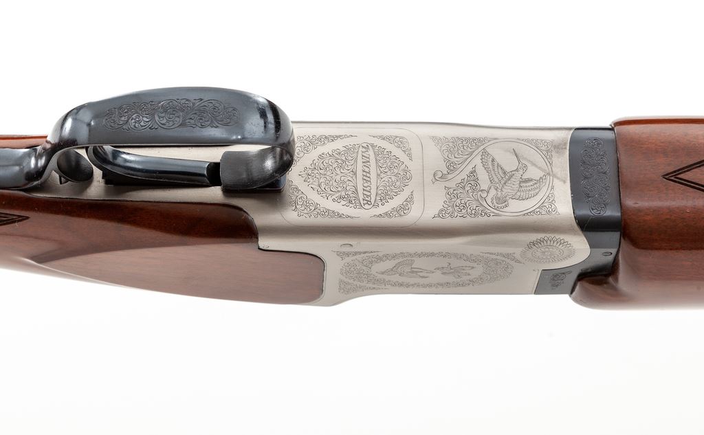 Winchester Model 101 XTR Lightweight Over/Under Shotgun, #K281732E. 20 ga. 27'' vent rib barrels have 3'' chambers, white target beads, and are fitted with Winchokes (Mod./Full installed). Boxlock action features a single selective trigger, auto ejectors, and a non-auto safety. Grayed receiver has engraved game birds surrounded by nice rose and scrolls. Standard Grade walnut semi-beavertail forend and pistol-grip buttstock have a high-gloss finish, adequate checkering, no grip cap, and an original Winchester solid red recoil pad. Mfg'd by Nikko in Japan for Winchester in the mid-1980s. Condition is excellent and original, with very little use shown. There are several handling marks to the wood, but almost no wear to the action, which functions correctly; center bead requires repair. Locks up tight and has mirror bores. Est.: $700-$900. (Modern)