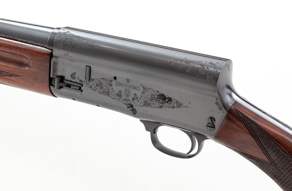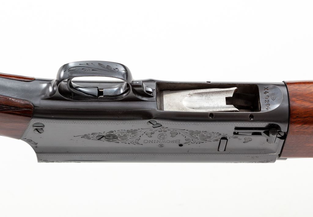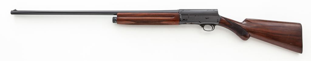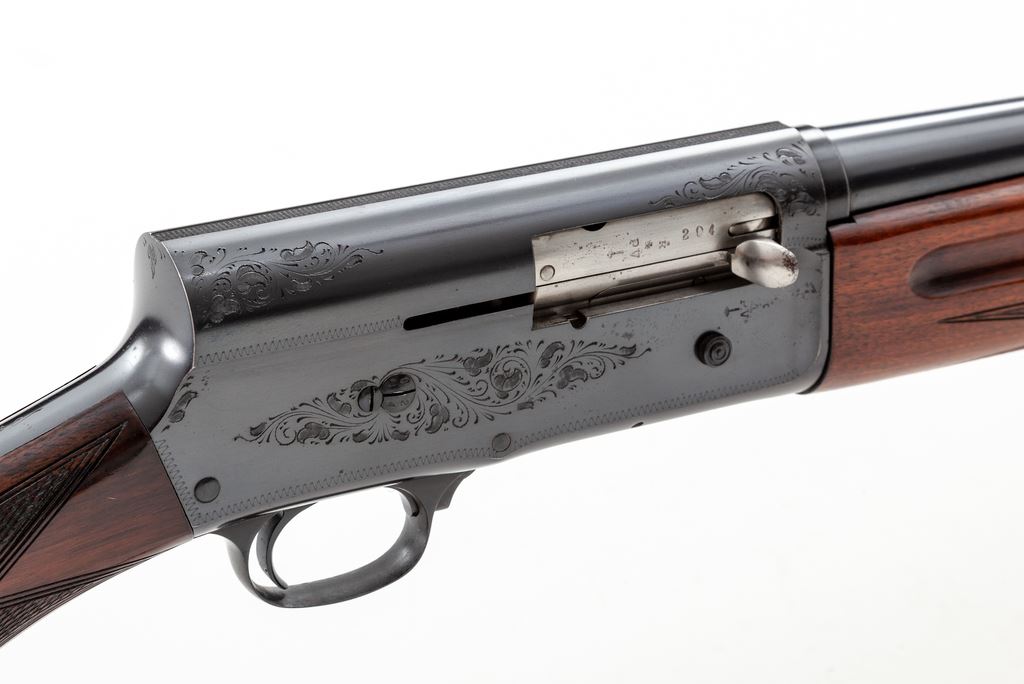 Browning Auto-5 Standard-Weight Semi-Automatic Shotgun, #X49204. 16 ga. 30'' plain barrel has 2-3/4'' chamber and is choked Full. Barrel is marked ''Made in Belgium'', with correct ''St. Louis, MO'' address. Receiver has correct and complete engraving and has the older front slide safety and small operating handle. Wood is nice Field Grade walnut, with slender finger-groove forend and round-knob pistol-grip buttstock, including original FN/Browning Automatic buttplate. Mfg'd 1951. Condition is exceptional and shows little use, except for a few handling marks on buttstock. Action looks new, bore needs cleaning but looks bright. Est.: $750-$950. (C&R)