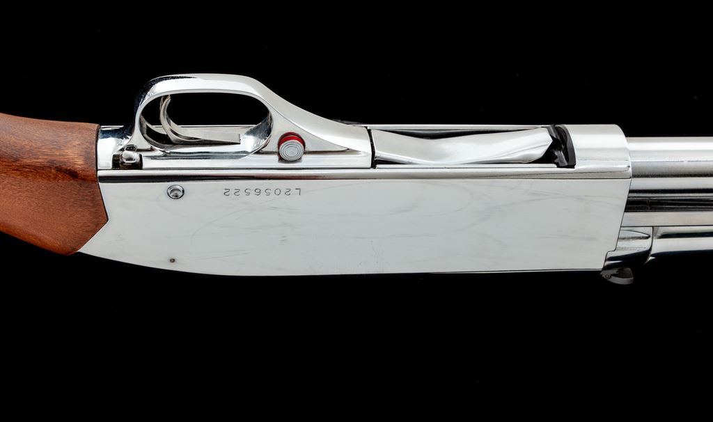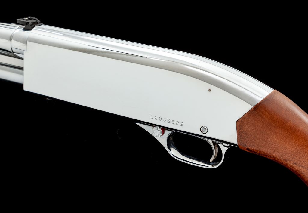 Scarce Winchester Stainless Marine Pump Action Shotgun, #L2056522, 12 ga., 3'' chamber, 18'' barrel, high polish bright stainless finish, dovetailed silver bead front sight on ramped base and folding rear sight. Smooth pistol-grip wood stock with factory black rubber recoil pad, stainless sling swivel studs, and grooved forend. Top of barrel is Winchester proofed. Shotgun is in excellent overall condition showing signs of little use. Bright stainless finish shows only scattered small marks from handling. Factory lettering is crisp; barrel address with clean raised edges. Wood appears as new. Action is smooth. Chamber area is extremely clean but oddly the mostly bright bore does need a thorough cleaning, as there is some powder fouling at about the mid-point. Est.: $800-$1,200. (Modern)