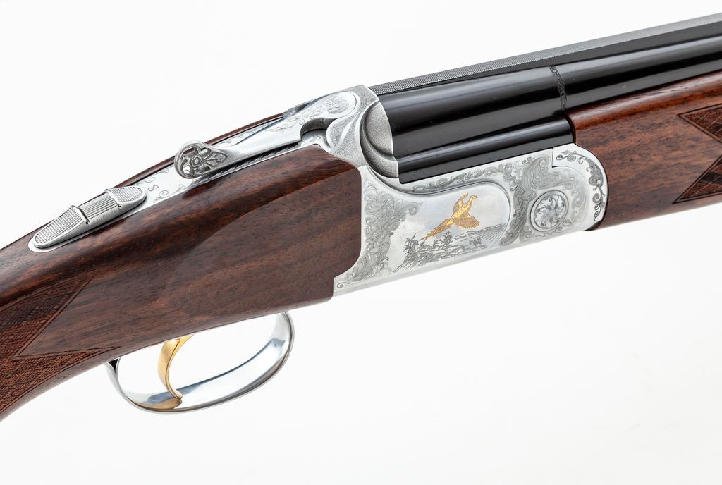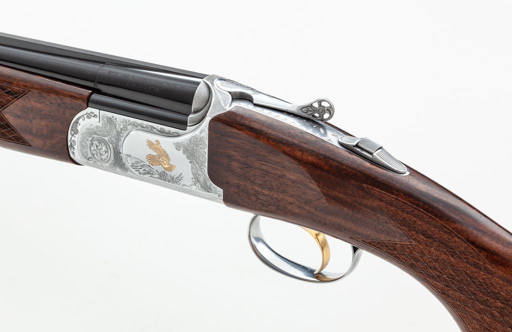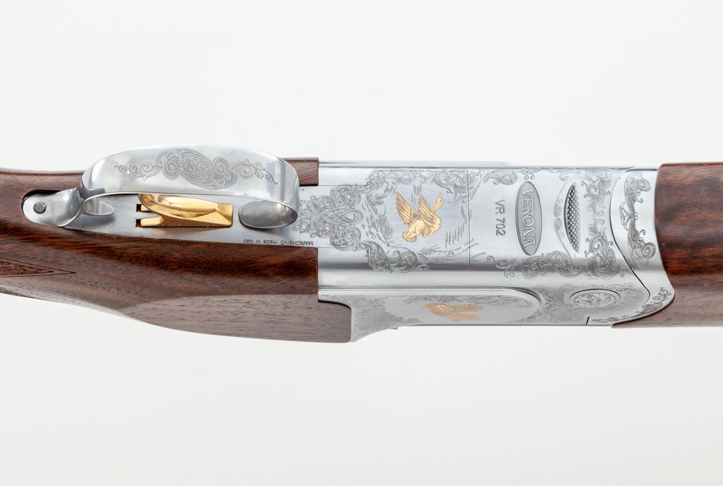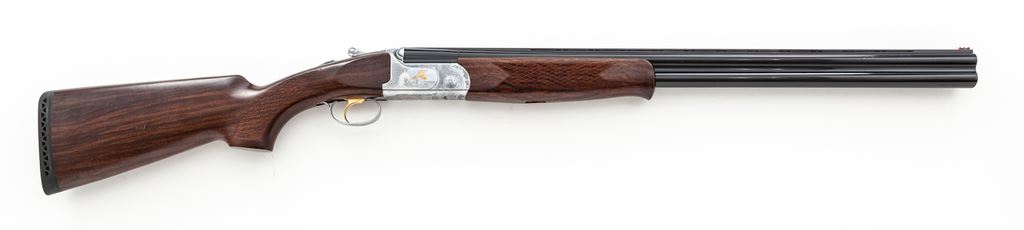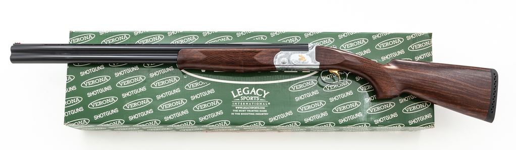 Verona Model 702 Series Over/Under Shotgun, #240620, 12 ga., 3'' chamber, 28'' vent rib blued steel barrels with internal IM/M chokes, and ejectors; barrel rib with a red fiber optic front sight. Nickel finished receiver with scroll engraving and gold inlaid bird scenes. Checkered walnut stock with Schnabel forend and black rubber pad; LOP is 14.5'' to the face of the gold-colored single select trigger. Included is the original box, choke tube wrench, and an additional Full, Cyl., and Imp-Mod. choke tube. Made in Italy and imported by LSI. With the exception of a few light scratches to the right side and bottom edge of the buttstock, this shotgun is in excellent as new overall condition. Inside and out a high condition, clean firearm. Est.: $600-$900. (Modern)