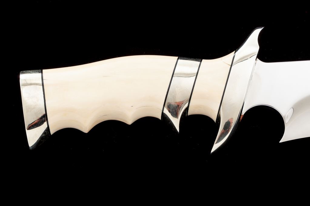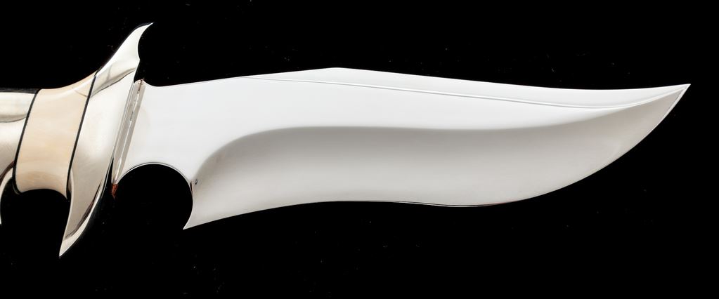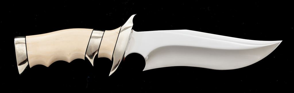 Rare Buck Knives 20-Year Service Award Custom Shop Subhilt Bowie Knife, 7-1/4'' mirror polished blade is marked on one side in 24k gold plating ''BUCK KNIVES 20 YEAR SERVICE AWARD'', with collector's ''Blacksmith & Anvil'' logo in the background. Blade is also marked ''Buck Custom U.S.A.'' and ''013'' is lightly engraved near the finger choil. Finger-grooved ivory handle with nickel silver guard and pommel. Overall length is 12-1/2''. In glass topped wood display case with royal blue velvet interior. Blade is in mint condition with a bright high polished finish and showing no wear to the 24k gold plating. Nickel silver surfaces show some micro-scratching from handling; top lower portion of the guard with a little more noticeable scratching that could probably be polished out. Wood display is excellent and shows only minor storage type wear. Seldom seen, this knife comes from a long-time Buck knife collector. Est.: $1,400-$1,800.