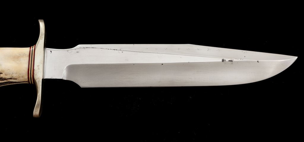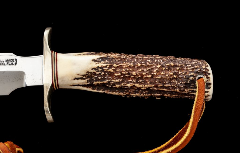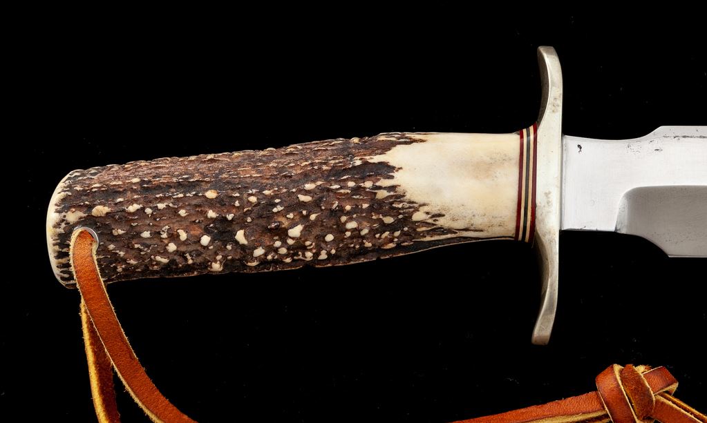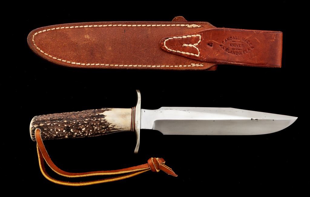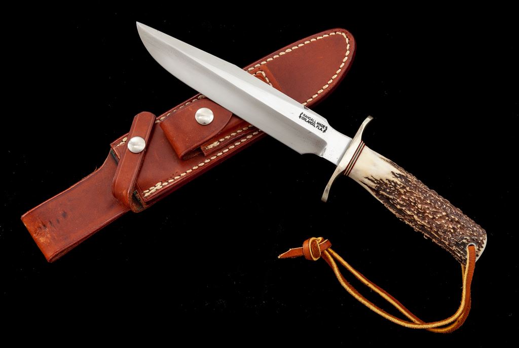 Randall Model 1 ''Fighting'' Knife, with sheath, 7'' blade with Randall logo, 11-3/4'' overall, really nice stag handle, brown leather bootlace type wrist thong, nickel silver double hilt with two red, two white, and one bluish/gray center spacer. In rough-back brown leather sheath, stamped on back with Randall logo and ''7'', with smooth nickel snaps, and includes a plain salmon-colored sharpening stone. Condition is fine. Blade with little micro-scratching and a handful of dark spots that appear to have been light pitting that was very neatly cleaned. Randall logo is clear and crisp, cutting edge is clean and excellent with no chips or blemishes. Stag handle shows a nice mellow patina from age. Sheath shows moderate age and wear with an area of shallow pressure dents on front side of belt loop; stitching and seams are excellent. Est.: $400-$600.