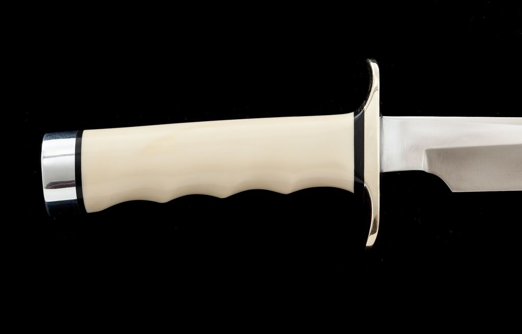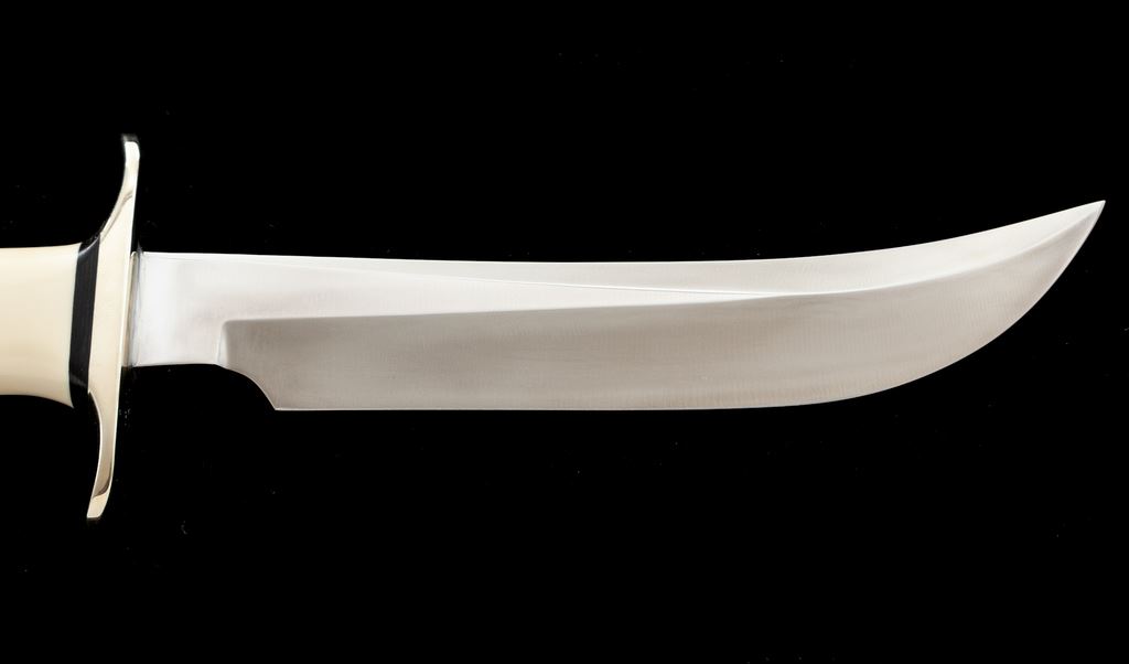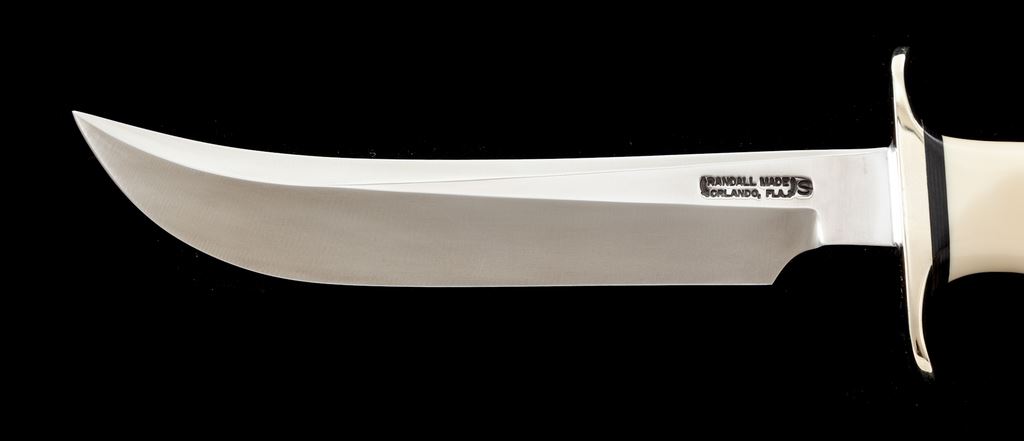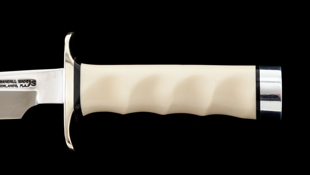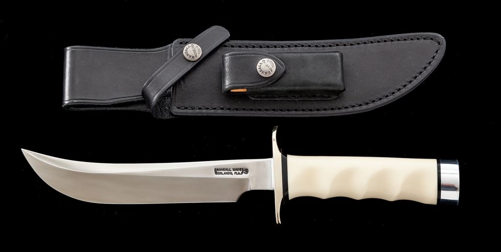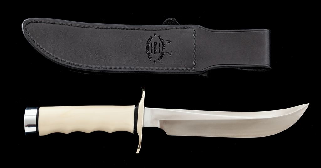 Randall Model 4 ''Big Game and Skinner'' Fixed Blade Knife, with sheath, 7'' blade with standard Randall stainless logo; 12-1/8'' overall length. Finger-grooved ivorite handle with nickel silver double hilt and duralumin pommel cap with black spacers. In black leather Randall sheath stamped on backside with Randall logo and ''4 7'', with ''Randall Made'' snaps and unmarked salmon-colored sharpening stone. In excellent overall condition, never carried or sharpened, with a small amount of micro-scratching and minor handling marks, mainly to the hilt and pommel cap. Sheath is excellent. Est.: $400-$600.