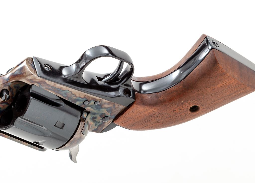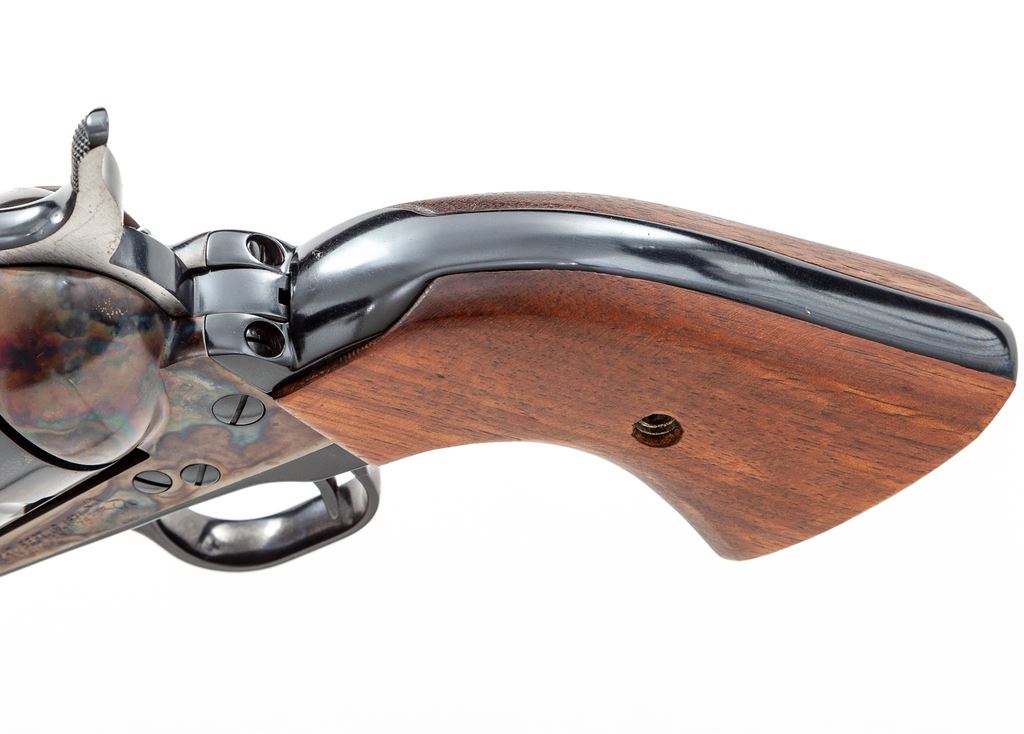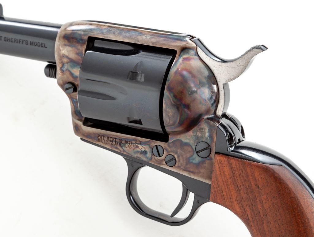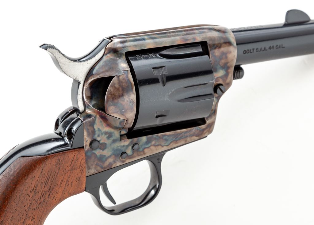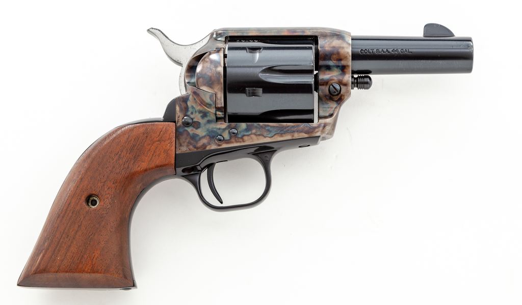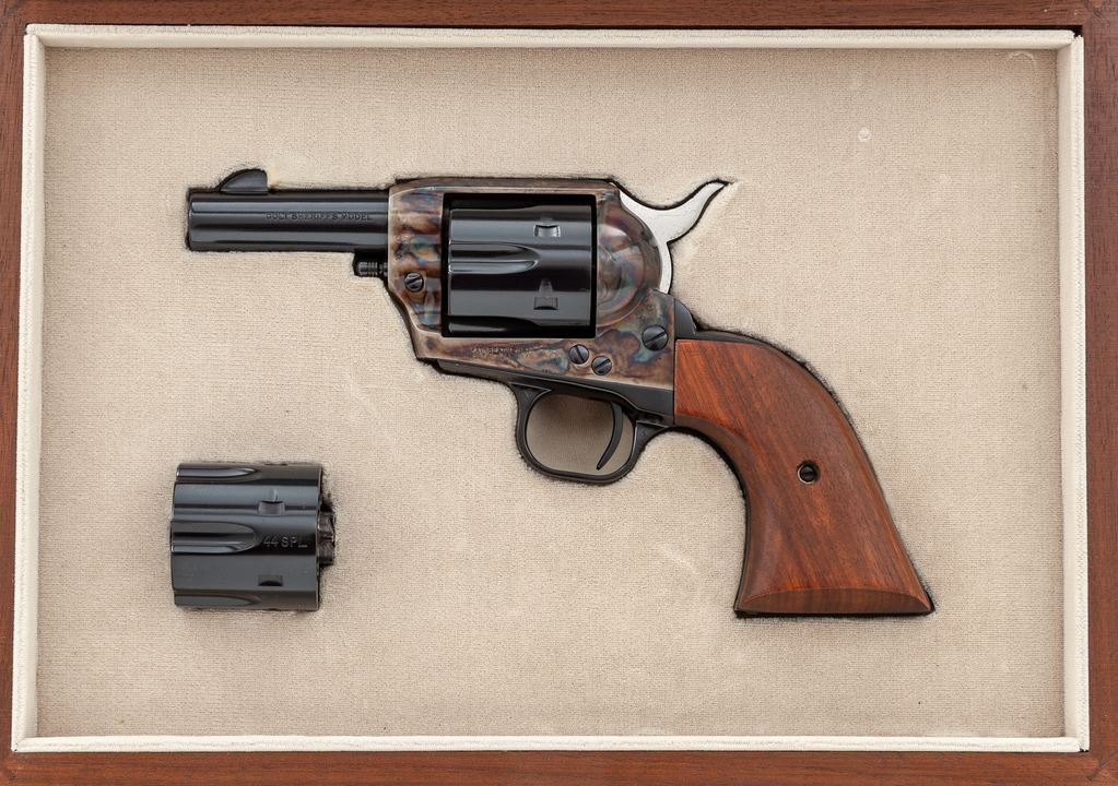 Early 3rd Generation Colt Sheriff's Model Single Action Revolver, with extra cylinder, #SA40572, .44-40 and .44 Special cal., 3'' barrel, blue finish, color case hardened frame, smooth walnut grips, with standard fixed sights. Both cylinders with matching numbers ''0572'' on the front. In glass-topped wooden display case with fitted tan velvet lining. Mfg'd 1980. Condition is excellent and appearing near new. 99% factory finishes remain with a few tiny spots of finish loss to the upper left edge of the frame. .44-40 cylinder shows only a very faint index line between a few of the cylinder stop notches and a few small scratches to the cylinder face. .44 Special cylinder with light micro-scratching and a thin light index line. Case colors are deep with clean and crisp factory lettering. Grips with a few small handling marks. Exterior of the display case shows only normal minor storage wear. Est.: $1,200-$1,800. (Modern/PPT)