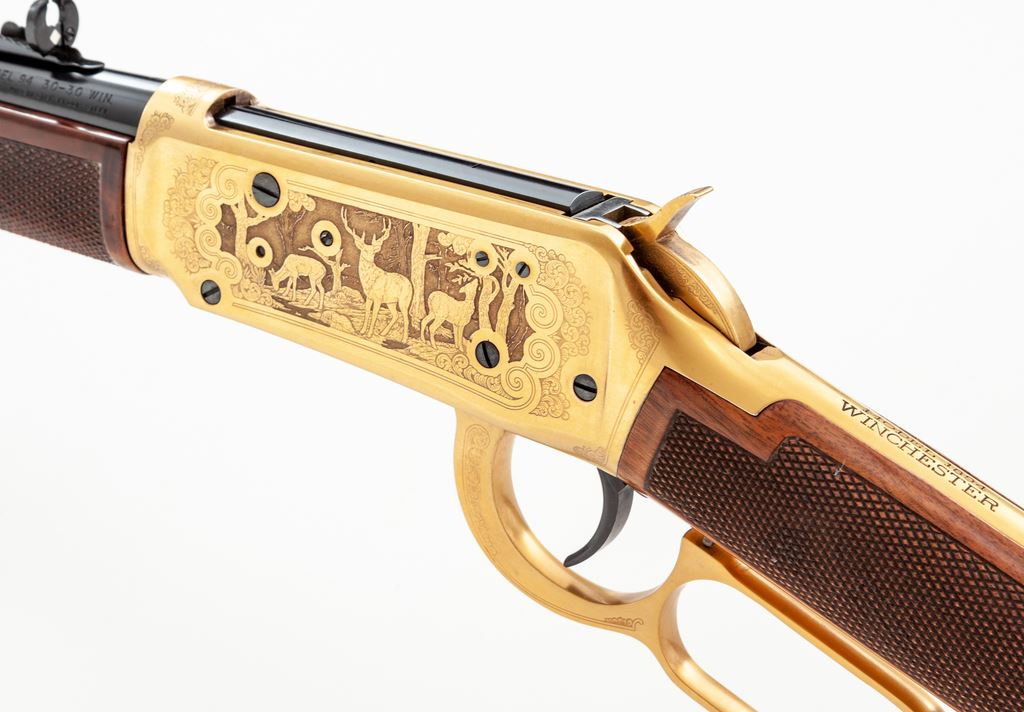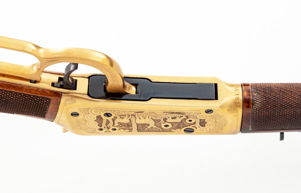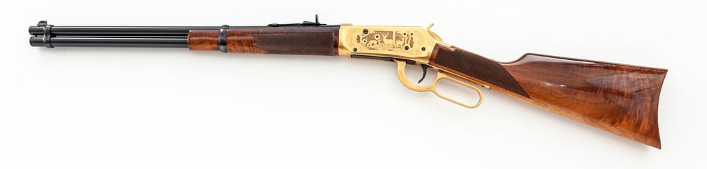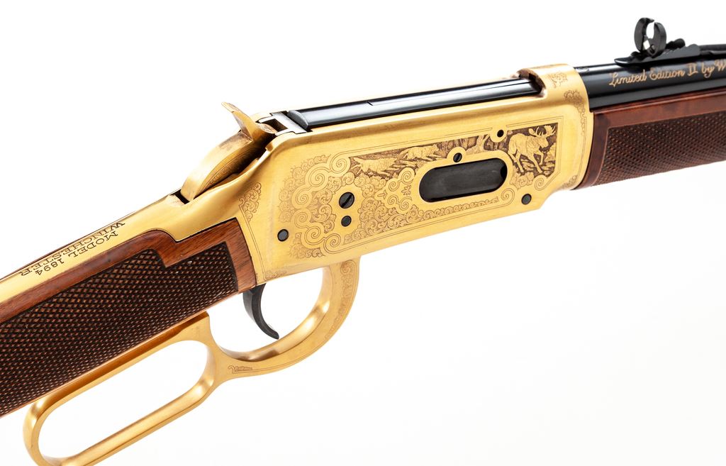 Cased Winchester Model 94 Limited Edition II Lever Action Carbine, #78L162, .30-30 cal., 20'' round blued steel barrel with standard sights; right side of barrel is marked in gold lettering ''Limited Edition II by Winchester''. Receiver and lever are gold plated; receiver with fine game scene engraving to both sides. High grade straight grip checkered walnut stock and forend with a blued steel buttplate. In original box with matching end label and paperwork. Also included is the wood display case with fitted blue velvet lining; case interior with a wood topped storage compartment. Appearing unfired, rifle is in fine to near excellent overall condition retaining approx. 99%+ original blue finish. Hammer and some of the protected areas of the frame show some tarnishing but should improve with a thorough cleaning. Wood is as new with the exception of some lightening to the right side and lower edge of buttstock, which is most likely from being used as a display piece. Bore is like new. Box has been stored in its original shipping carton and slipcover is a little tattered at the corners; shipping carton also has a label and is numbered to the gun. Wood display case is a little warped or out of alignment and the middle latch will not close. Case was also stored in its shipping box and both the interior and exterior are excellent. Only 1,500 of these rifles were mfg'd in 1979. Est.: $900-$1,200. (C&R)(Sierra Sid's Casino, Sparks, NV.)