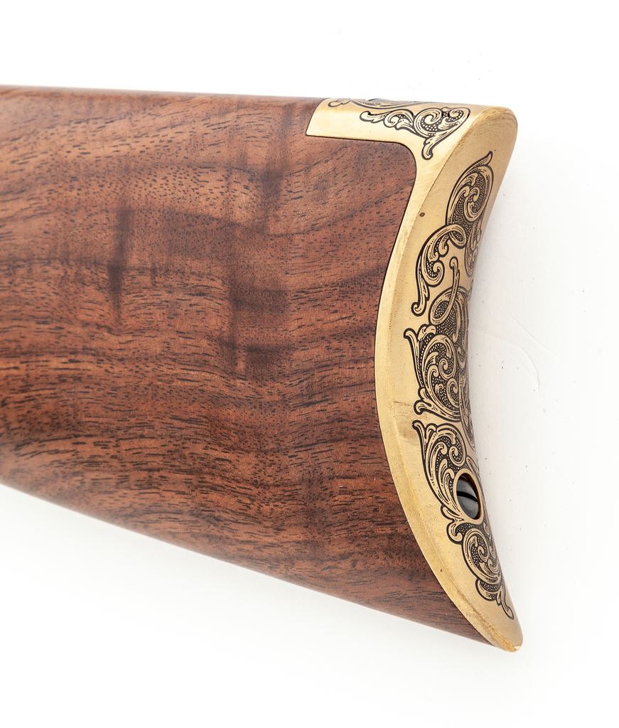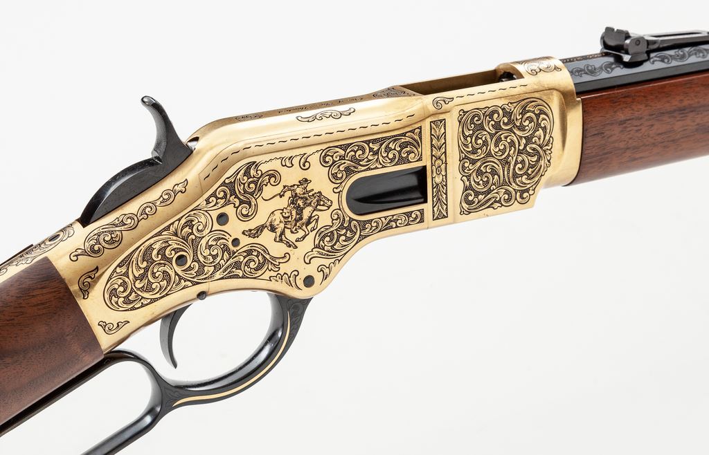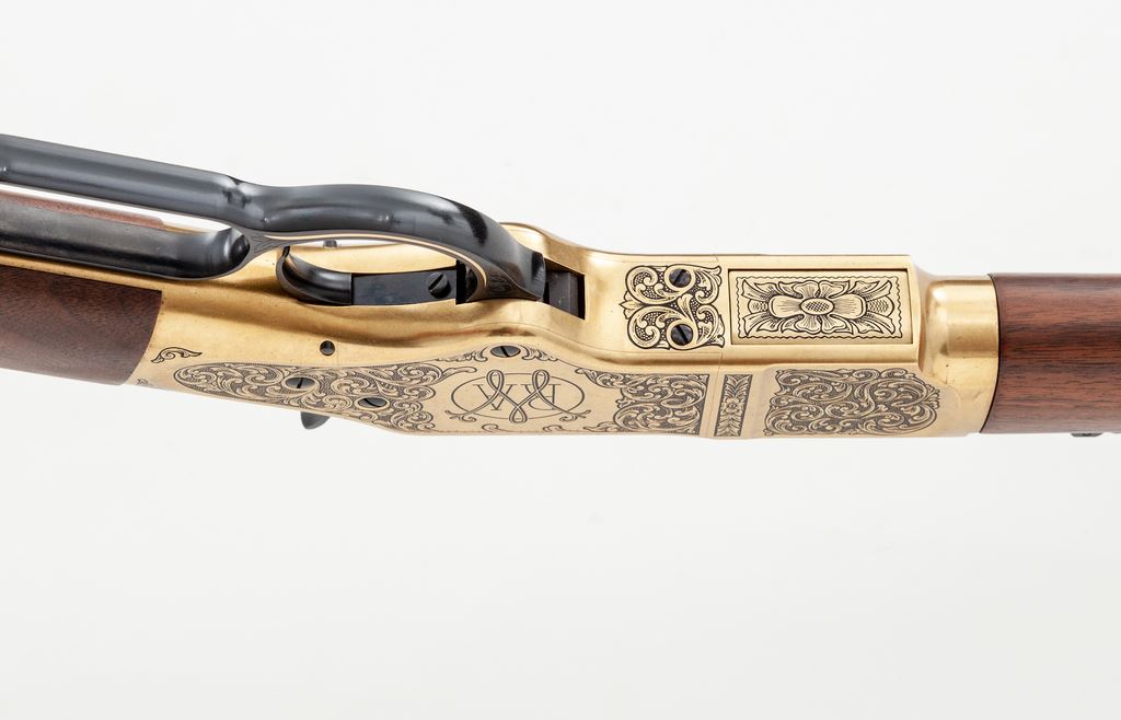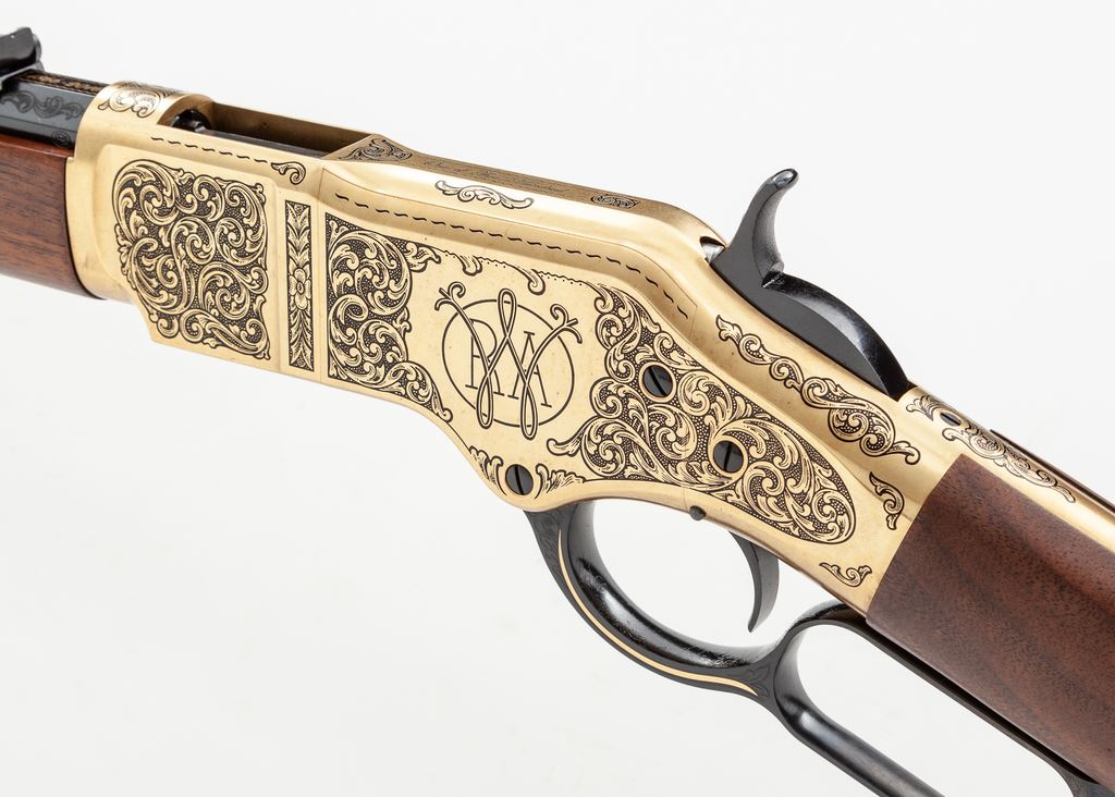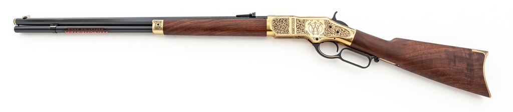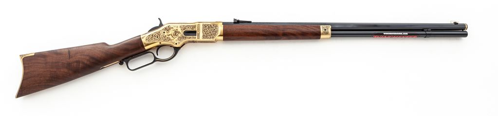 Winchester 150th Anniversary Commemorative High Grade One of Five Hundred Model 1866 Lever Action Rifle, #M662016356, chambered in .44-40 cal., 24'' blued steel octagon barrel with scroll engraving in the area around the rear sight, gold band at the muzzle, and top is marked in gold script ''Winchester Repeating Arms'' and ''1866-2016''. Brass receiver, forend cap, and crescent buttplate are also extensively scroll engraved; top of receiver is marked ''One of Five Hundred''; right side with ''Horse and Rider'' logo; left ''WRA''. Oil-finished custom grade straight grip walnut stock and forend. Sights include a carbine ladder rear sight and silver blade front sight. Rifle is in excellent as new overall condition and appears unfired. Magazine tube with the original Winchester sticker still attached. Bore is mirror bright. Est.: $2,000-$2,500. (Modern)