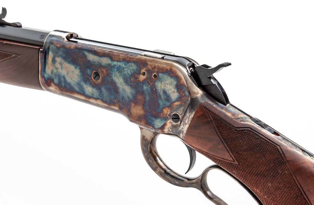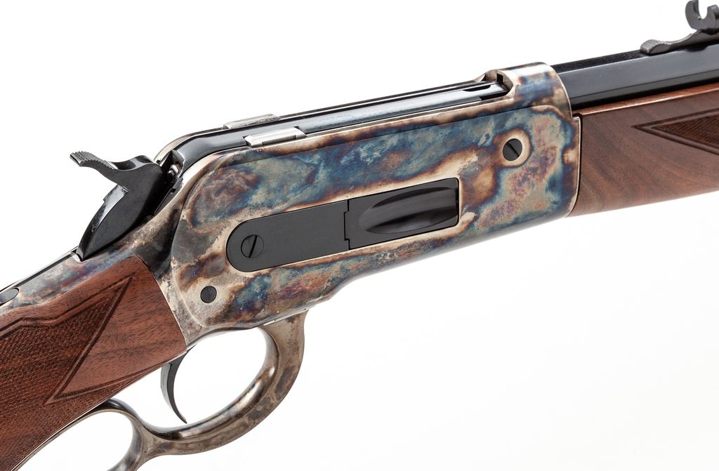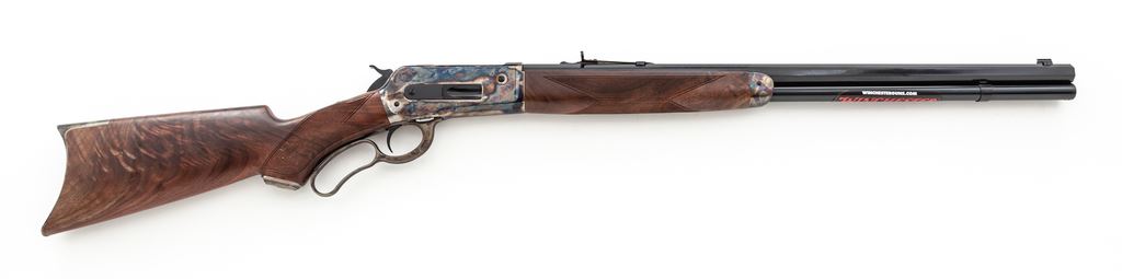High Condition Modern Deluxe Winchester Model 1886 Lever Action Rifle, #00213ZV86C, .45-70 cal., 24'' octagon barrel with dark blue finish, vibrant color case hardened receiver and lever. Deluxe pistol-grip walnut stock is checkered at the wrist and forend with a color case hardened crescent steel buttplate, grip and forend cap. Rifle also features a dovetailed front sight with brass bead, semi-buckhorn rear sight, and upper tang mounted safety. Top of receiver and left barrel flat are Winchester proofed. Bottom of magazine tube with the original Winchester sticker still attached. Mfg'd in Japan by Miroku. Overall condition is excellent, appearing as new and possibly unfired. Factory lettering is sharp. Wood with an attractive wood grain pattern, checkering is unmarred. Excellent action and mint bore. Est.: $1,000-$1,500. (Modern)