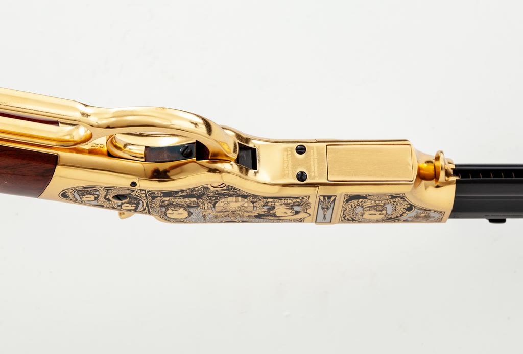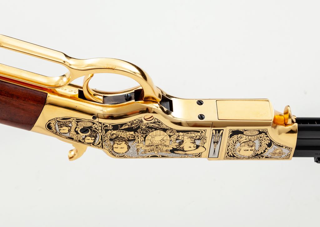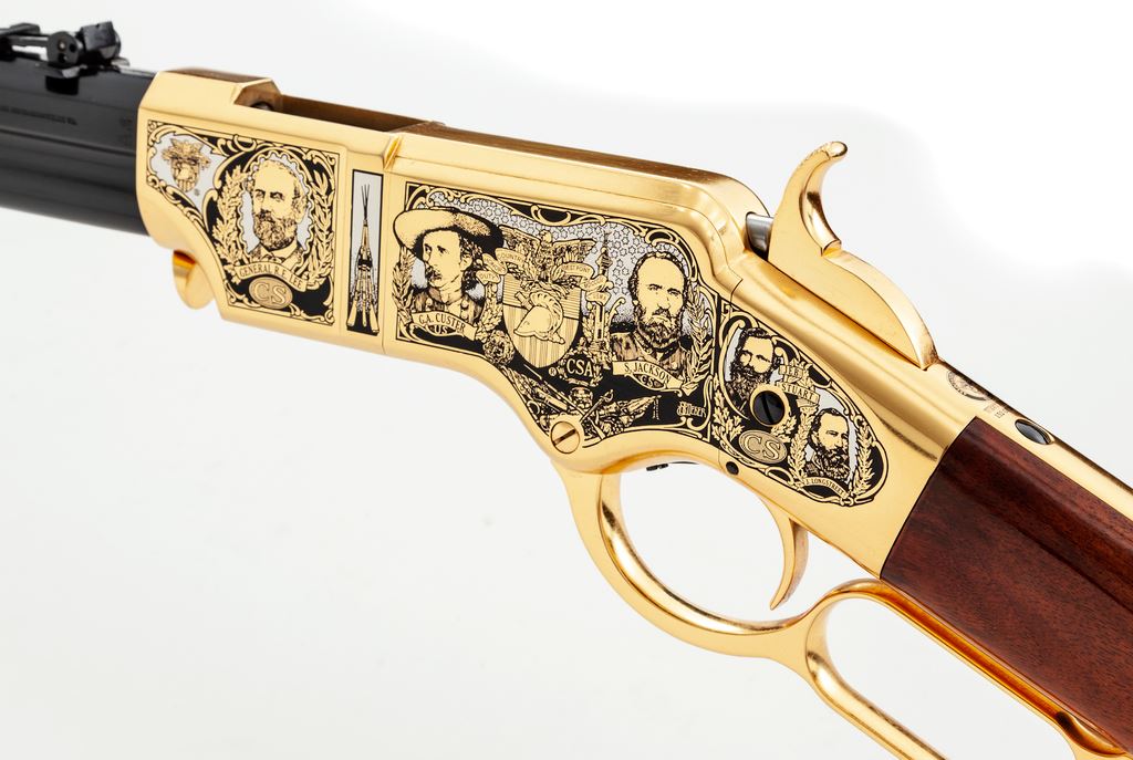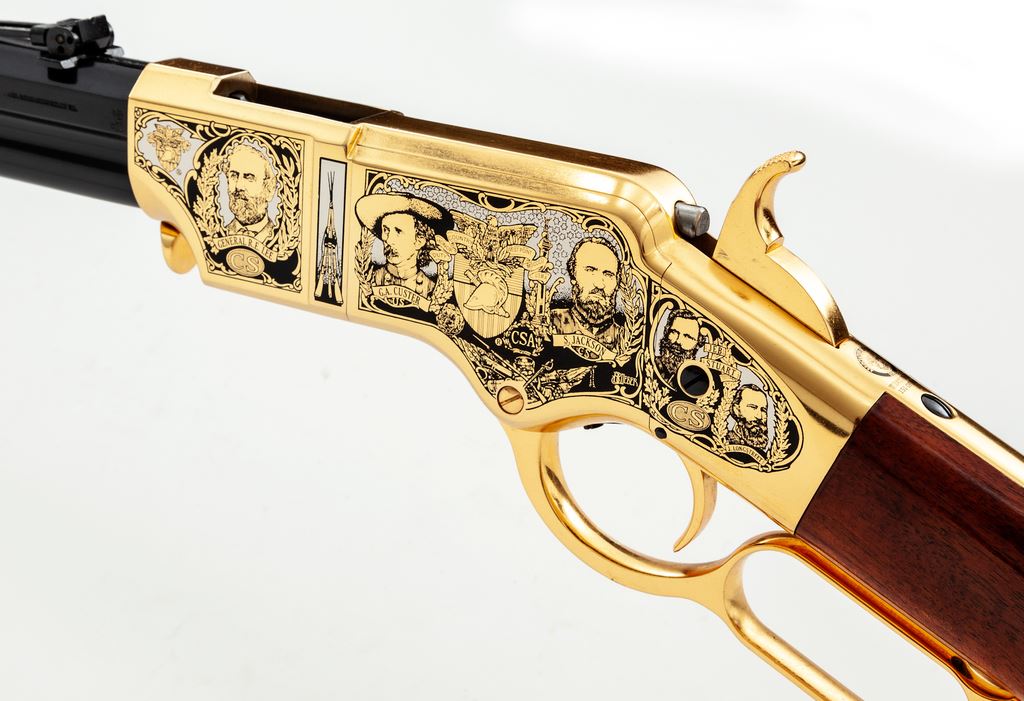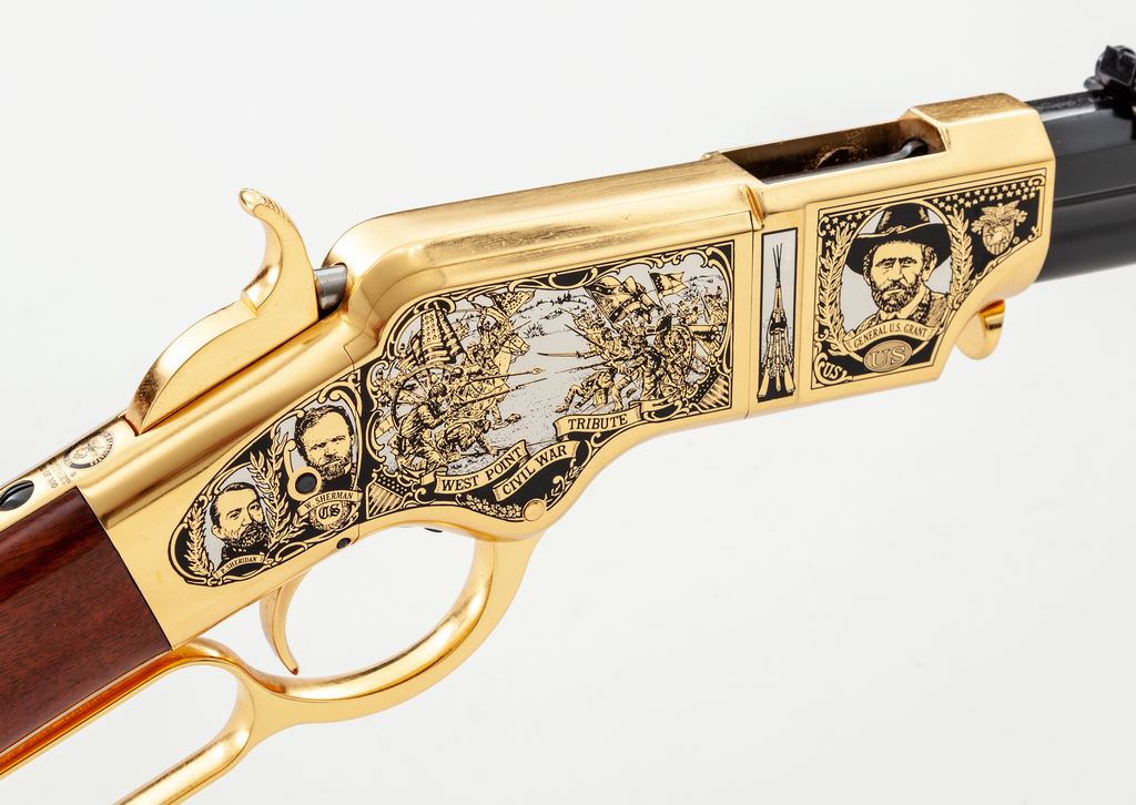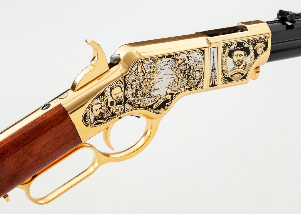 Limited Production America Remembers Uberti Henry Lever Action West Point Civil War Tribute Rifle, #19090, and is #152 of 300. Chambered in .44-40 cal., with a 24.25'' blued barrel, and 24k gold-plated receiver, lever, and crescent-shaped buttplate. Both sides of the receiver with extensive Civil War themed decorations as well as several portraits, including Custer, S. Jackson, R.E. Lee, U.S. Grant, etc. Straight grip walnut stock with a high gloss finish. This rifle includes a black plastic Gun Guard case with white outer America Remembers cardboard wrap, cable lock, maroon colored protective sleeve, America Remembers cleaning cloth, and plain white shipping box. In excellent as new and unfired condition. Est.: $1,000-$1,500. (Modern)(Sierra Sid's Casino, Sparks, NV.)