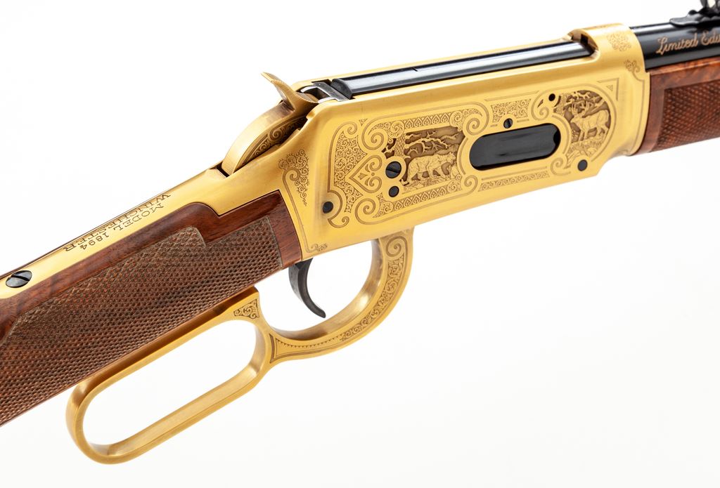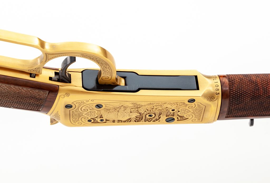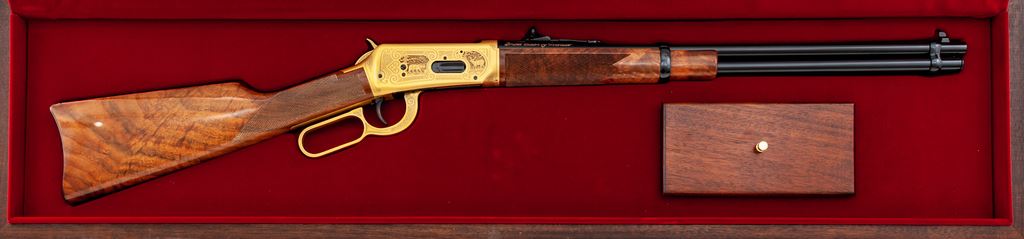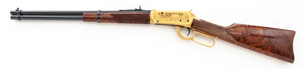 Cased Winchester Model 94 Limited Edition I Lever Action Carbine, #77L1083, .30-30 cal., 20'' round blued steel barrel with standard sights; right side of barrel is marked in gold lettering ''Limited Edition by Winchester''. Receiver and lever are gold plated; receiver with fine game scene engraving to both sides. High-grade straight grip checkered walnut stock and forend with a blued steel buttplate. In original box with matching end label; shipping box also with matching end label and paperwork. Also included is the wood display case with fitted red velvet lining; case interior with a wood-topped storage compartment. Appearing unfired, rifle is in fine to near excellent overall condition with approx. 99%+ original blue finish remaining. Wood with a few small handling marks and a little fading to right side and top edges of buttstock, which is most likely from being used as a display piece. Bore is like new. Box has been stored in its original shipping carton and shows only light wear. Wood display case was also stored in its shipping box and both the interior and exterior are excellent. Only 1,500 of these rifles were mfg'd in 1977. Est.: $900-$1,200. (C&R)(Sierra Sid's Casino, Sparks, NV.)