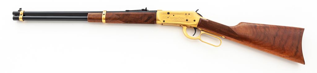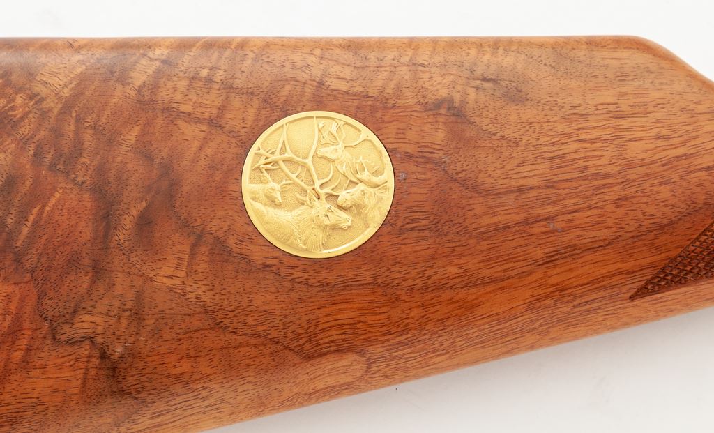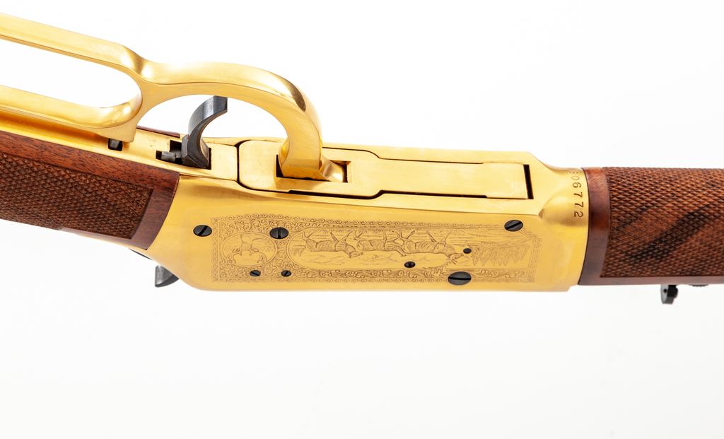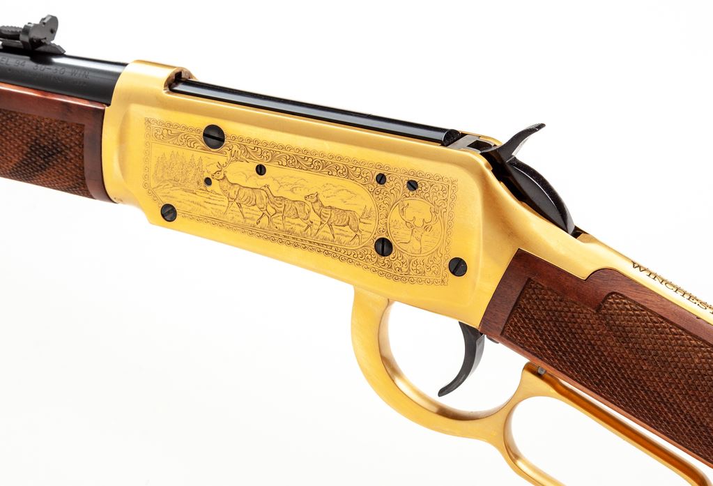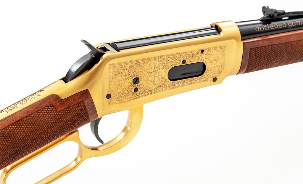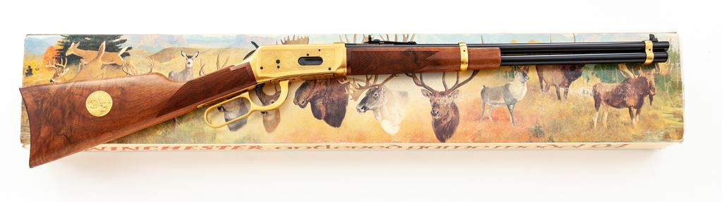 Winchester Model 94 Antlered Game Commemorative Lever Action Carbine, #AG06772, .30-30 cal., 20'' round blued steel barrel with standard sights; right side of barrel is marked in gold lettering ''Antlered Game''. Receiver, barrel bands, and lever are gold plated; receiver with game scene engraving to both sides. Straight grip checkered walnut stock and forend with a blued steel buttplate; right side of buttstock with inlaid commemorative medallion. In original box with matching end label, hang tag, and owner's manual. Appearing unfired, rifle remains in excellent overall condition. Gold surfaces with some micro-scratching and areas of minor toning from age. All of the original blue finish remains. Wood shows only a few insignificant handling marks; checkering is sharp. Bore is like new. Polychrome slipcover is a little tattered around the edges but overall shows mostly normal moderate age and storage wear. An approx. 6'' piece of the styrofoam lid is missing. Approx. 20,000 of these rifles were mfg'd in 1978. Est.: $500-$750. (C&R)(Sierra Sid's Casino, Sparks, NV.)