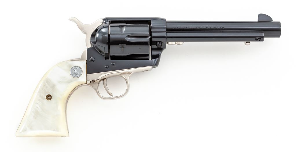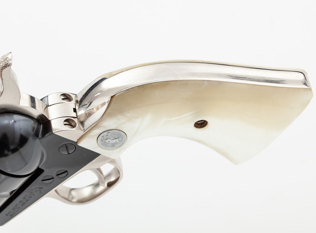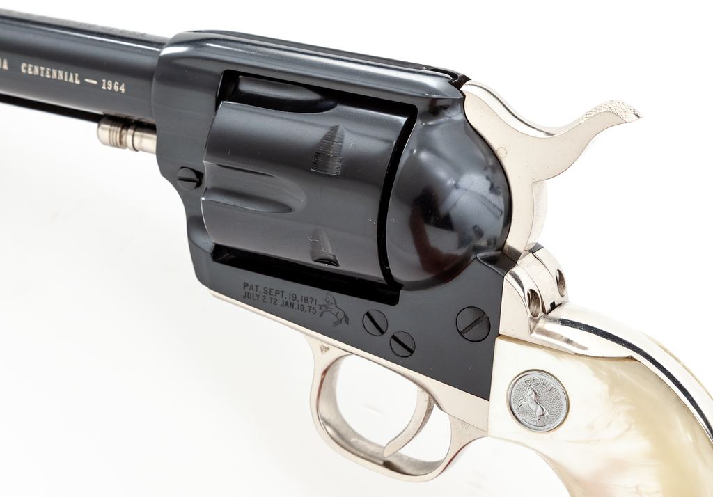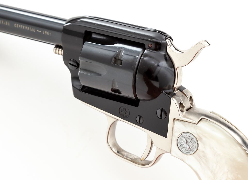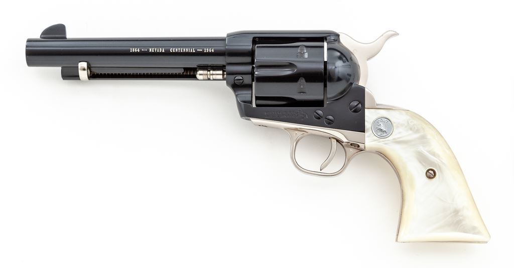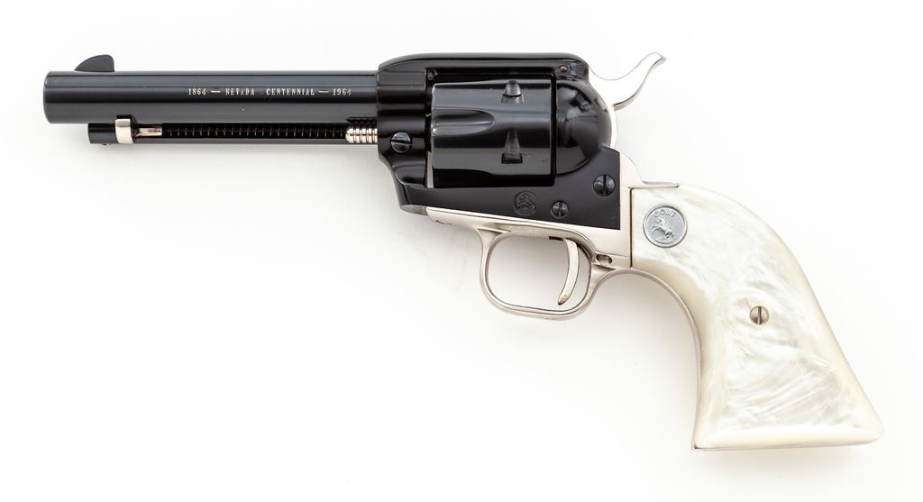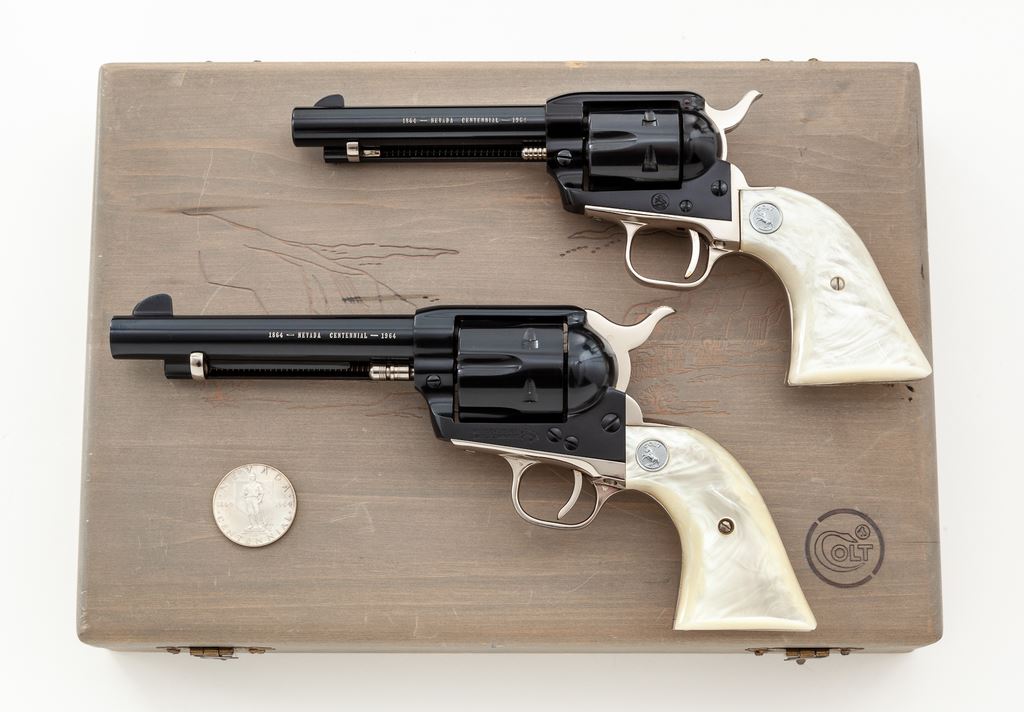 Cased Pair of Colt Commemorative Nevada Centennial Single Action Revolvers: 1.) #0841NC, .45 LC cal., 5.5'' barrel, blue finish, nickel triggerguard, faux pearl grips with silver Colt medallions, and standard sights. Left side of barrel is marked ''1864-NEVADA CENTENNIAL-1964''. 2.) Frontier Scout, #0841NS, .22 LR, 4.75'' barrel, finishes and grips match the first revolver. In original wood display box with light blue interior and Nevada centennial coin. Approx. 189 of these numbered sets were mfg'd in 1964. Both revolvers are in excellent overall condition, appearing unfired, with approx. 99% remaining factory finishes. Metal with intermittent micro-scratches and small handling marks. The .45 revolver with a very light index line; .22 LR cylinder appears unturned. Grips are excellent, no chips or cracks. Factory lettering is crisp and clear. Bores are mirror bright. Commemorative coin is tarnished and needs cleaning. Case exterior with scattered light scratches and other moderate storage wear. Est.: $1,400-$1,800/set. (C&R)(Sierra Sid's Casino, Sparks, NV.)