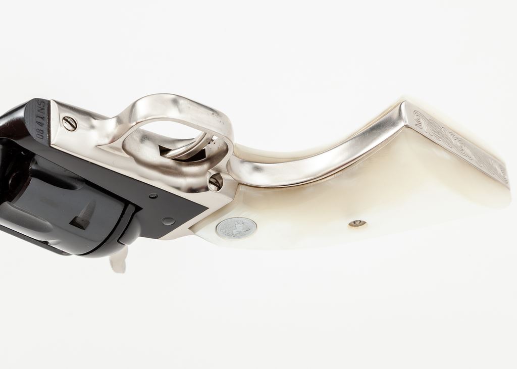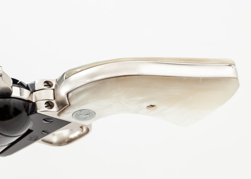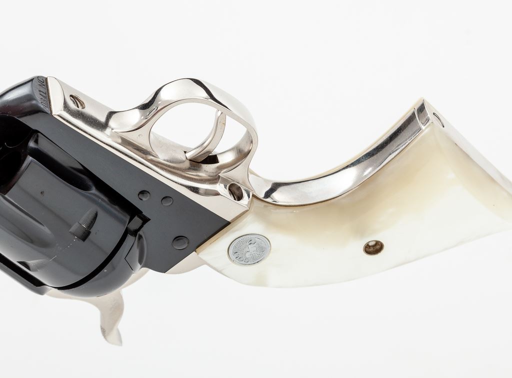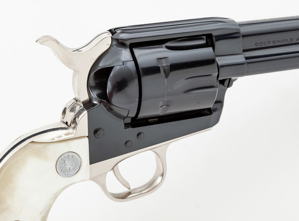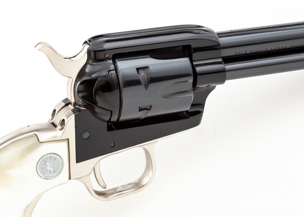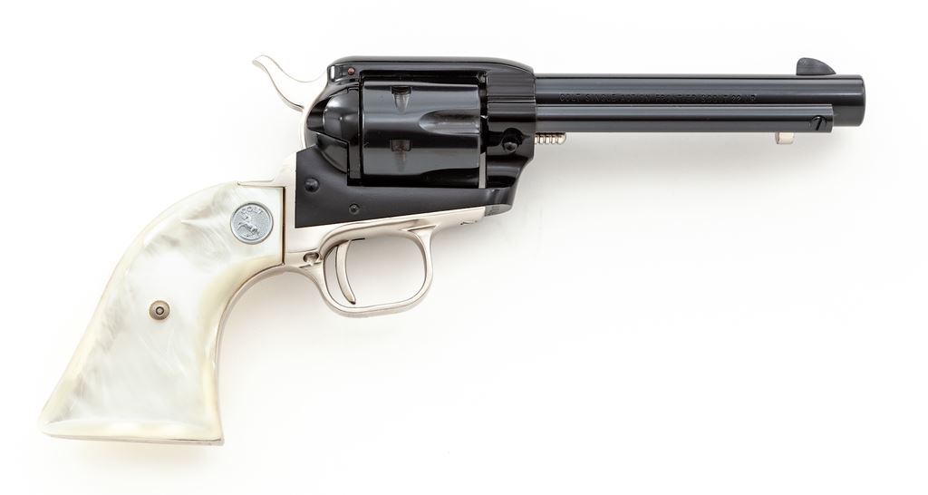 Cased Pair of Colt Commemorative Nevada Centennial Single Action Revolvers: 1.) #0841NC, .45 LC cal., 5.5'' barrel, blue finish, nickel triggerguard, faux pearl grips with silver Colt medallions, and standard sights. Left side of barrel is marked ''1864-NEVADA CENTENNIAL-1964''. 2.) Frontier Scout, #0841NS, .22 LR, 4.75'' barrel, finishes and grips match the first revolver. In original wood display box with light blue interior and Nevada centennial coin. Approx. 189 of these numbered sets were mfg'd in 1964. Both revolvers are in excellent overall condition, appearing unfired, with approx. 99% remaining factory finishes. Metal with intermittent micro-scratches and small handling marks. The .45 revolver with a very light index line; .22 LR cylinder appears unturned. Grips are excellent, no chips or cracks. Factory lettering is crisp and clear. Bores are mirror bright. Commemorative coin is tarnished and needs cleaning. Case exterior with scattered light scratches and other moderate storage wear. Est.: $1,400-$1,800/set. (C&R)(Sierra Sid's Casino, Sparks, NV.)