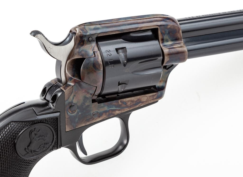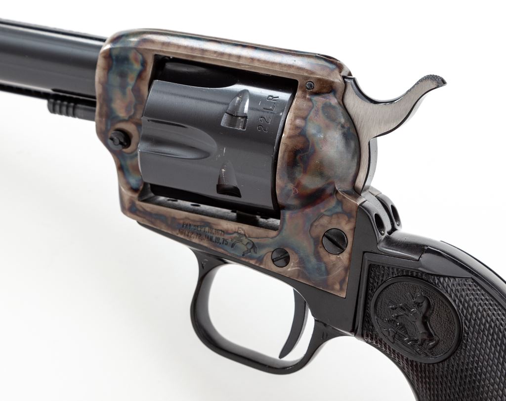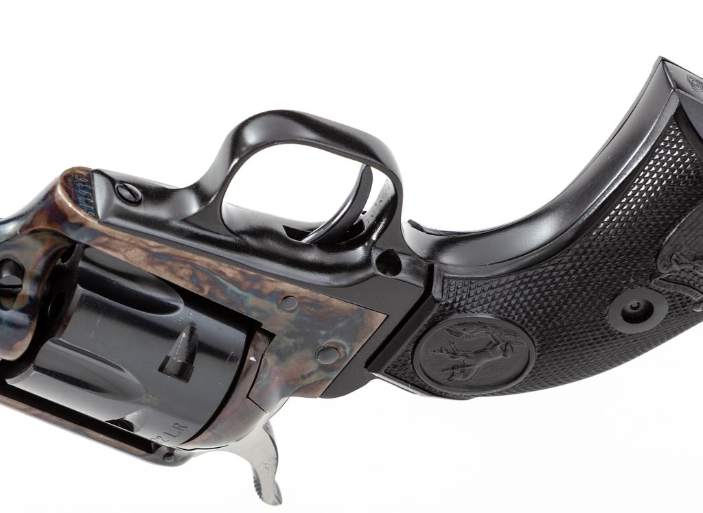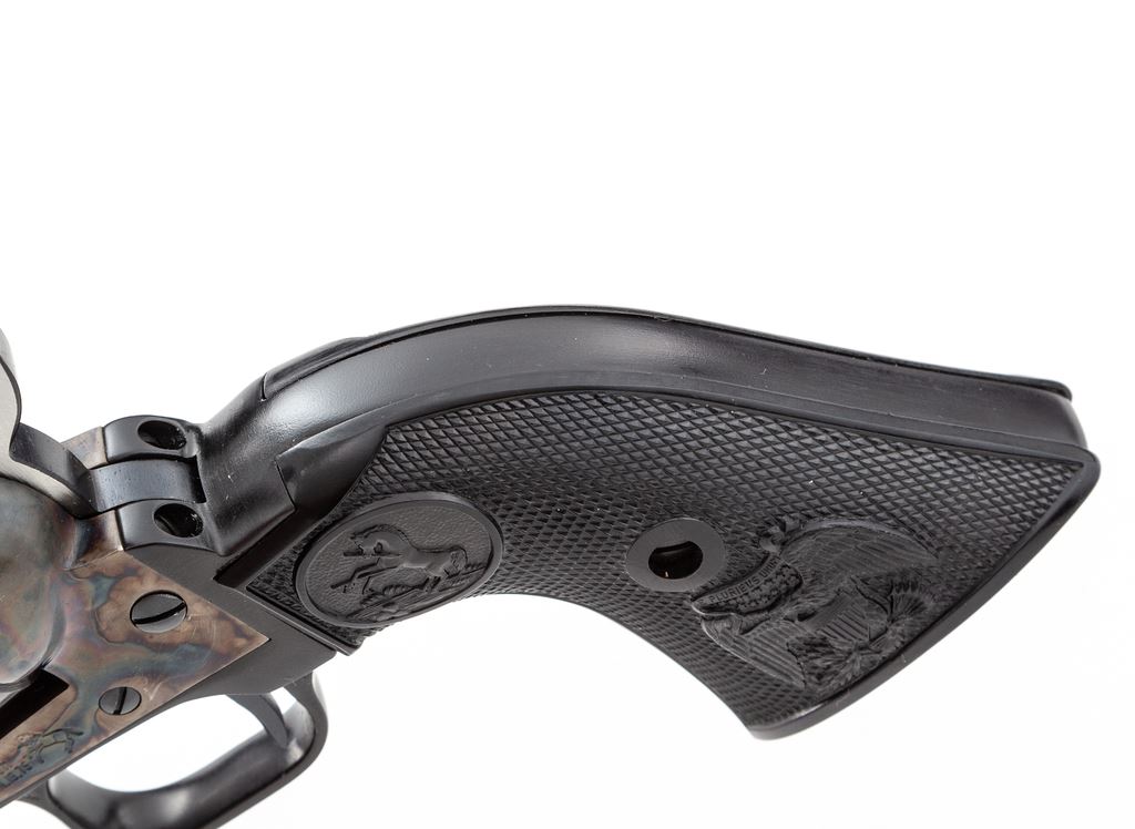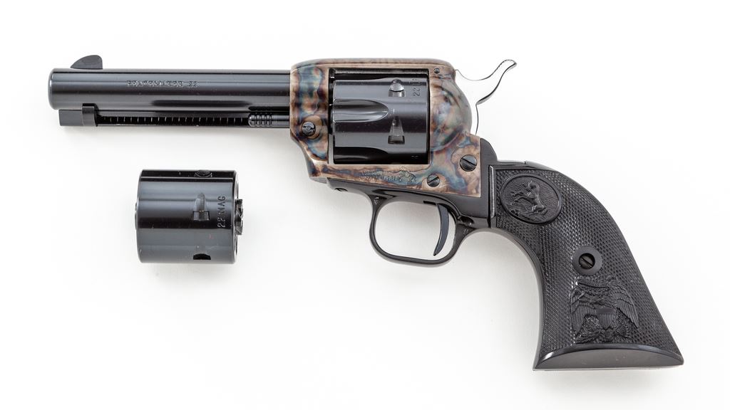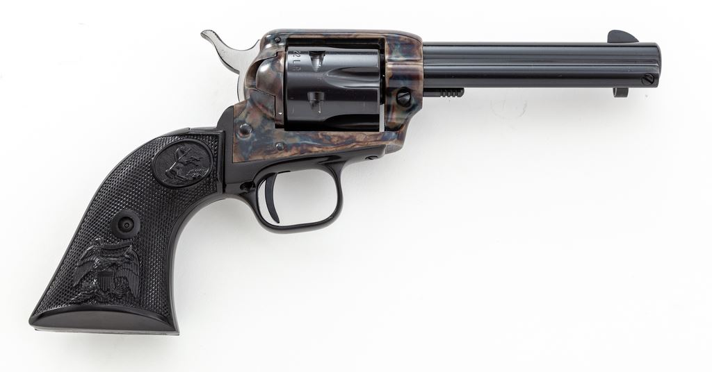 Colt Peacemaker Single Action Revolver, #G139364, .22 LR/.22 mag. cal., 4.5'' barrel, blue and case hardened finish, factory black plastic eagle grips, complete with extra cylinder. Condition is excellent retaining very nearly all of its original finish, with very light marks to cylinder. Est.: $500-$750. (Modern/PPT)