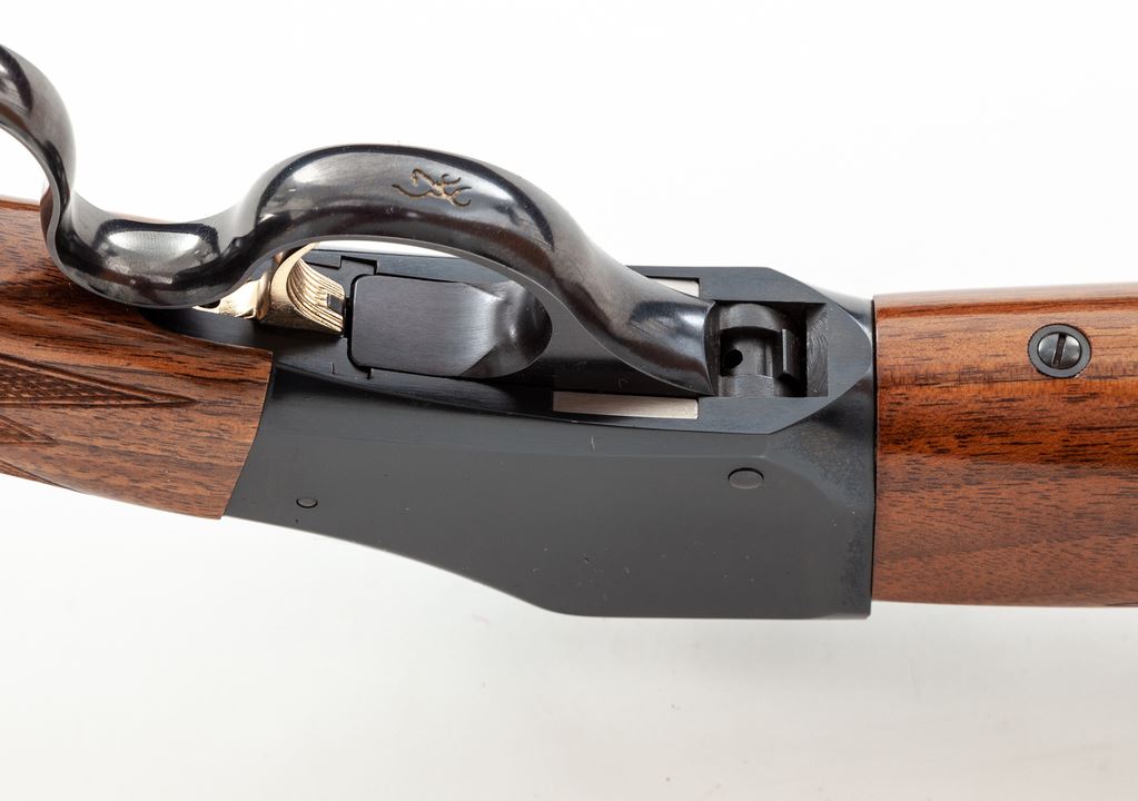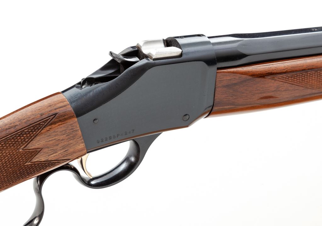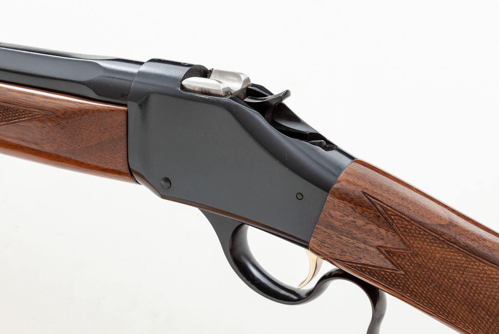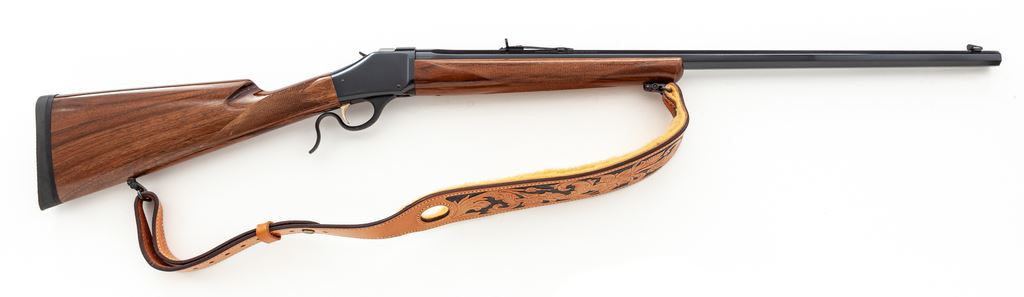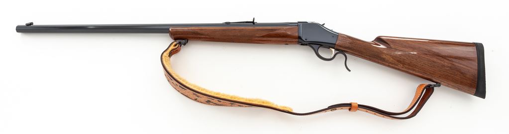 Browning Model 1885 High Wall Single Shot Rifle, #02295PN247, .45-70 cal., 28'' tapered octagon barrel, dark blue finish, Rocky Mountain front sight, and semi-buckhorn rear sight; checkered straight grip walnut stock with a gloss finish, black rubber Browning recoil pad, sling swivels, and tooled leather Bianchi #74 ''Cobra Grande'' padded sling. Rifle is in excellent overall condition with approx. 99%+ original blue finish. Wood with a few slight handling marks, most noticeable near the comb; checkering is clean. Factory lettering is crisp. Excellent action with a smooth hammer and trigger; bright bore. Overall a high condition rifle that shows signs of little use. Est.: $1,000-$1,400. (Modern)