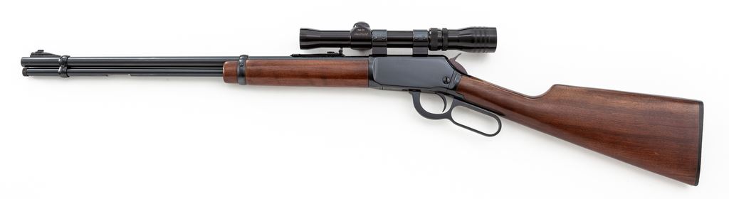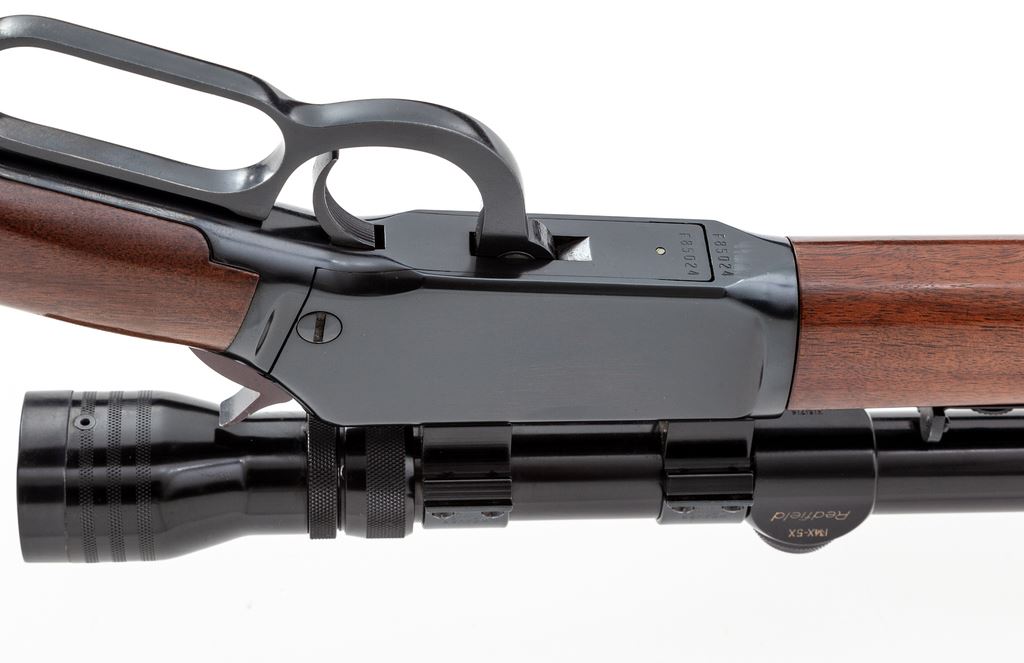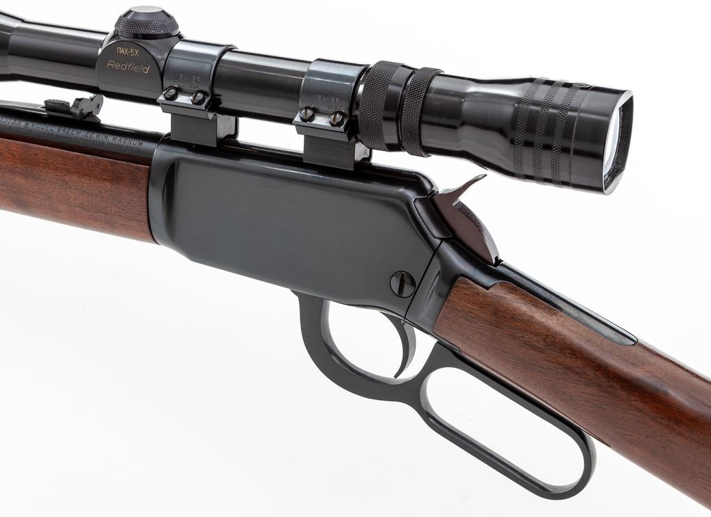 Pre-XTR Winchester Model 9422M Lever Action Rifle, #F85024, .22 Win. mag., 20.25'' round barrel, blue finish, early feature uncheckered straight grip walnut stock and forend, factory black composite Winchester buttplate, dovetailed silver bead front sight, standard elevator rear sight, factory grooved receiver, and topped with a Redfield 1-3/4-5x ''Wide-Field'' scope and Weaver rings; scope with duplex range finding reticle. Metal is excellent with approx. 98%+ remaining factory blue finish. Wood rates fine with normal scattered light handling marks, most noticeable on the wrist and forend. Action is crisp with a smooth hammer and trigger; bore is bright and in excellent condition. Exterior of the scope shows only slight handling marks, optics are clear. Est.: $600-$900. (Modern)