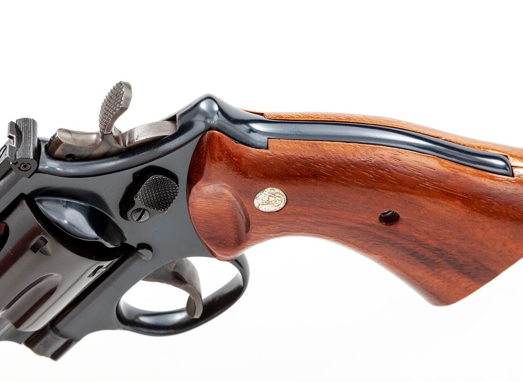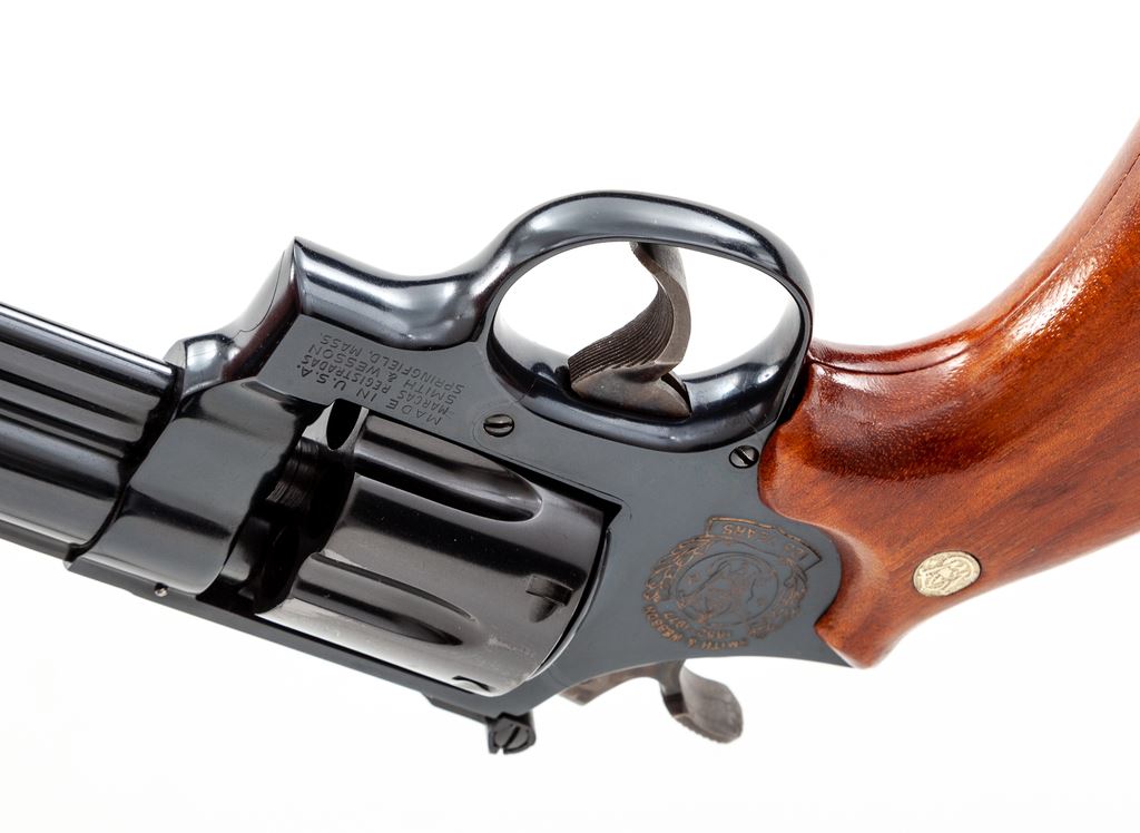 Smith & Wesson 125th Anniversary Commemorative Model 25-3 Double Action Revolver, #S&W1668, .45 LC cal., 6.5'' solid rib barrel, blue finish, smooth Goncalo alves target grips with S&W medallions, red ramp front sight, white outline adjustable rear sight, color case hardened wide target hammer and trigger. Right side of barrel reads in gold lettering ''SMITH & WESSON / 125TH ANNIVERSARY''; right side of frame with 125th Anniversary logo. Included is the original wood display case with blue velvet interior, silver commemorative coin, and the book ''125 Years with Smith & Wesson'', by Roy G. Jinks. Revolver is in excellent near new overall condition and appears to be possibly unfired. Cylinder shows a faint index line and looks as if it was turned very little. Metal with a few normal light handling marks and approx. 99%+ original bright blue finish. With the exception of fine crazing to the finish along the bottom edges, both grips are also excellent. Factory lettering is crisp. Case colors are vibrant. Bore is also excellent. Case interior needs repair, as the blue velvet upper section and straps that hold the book in place have come loose from the wood; inlaid medallion on the exterior of the lid is missing, otherwise the exterior shows moderate scuffs and scratches. Approx. 10,000 of these revolvers were mfg'd in 1977. Est.: $700-$1,000. (C&R)(Sierra Sid's Casino, Sparks, NV.)