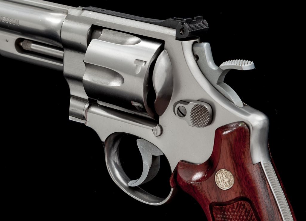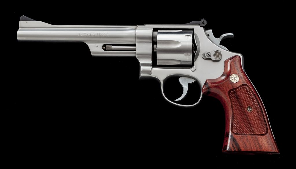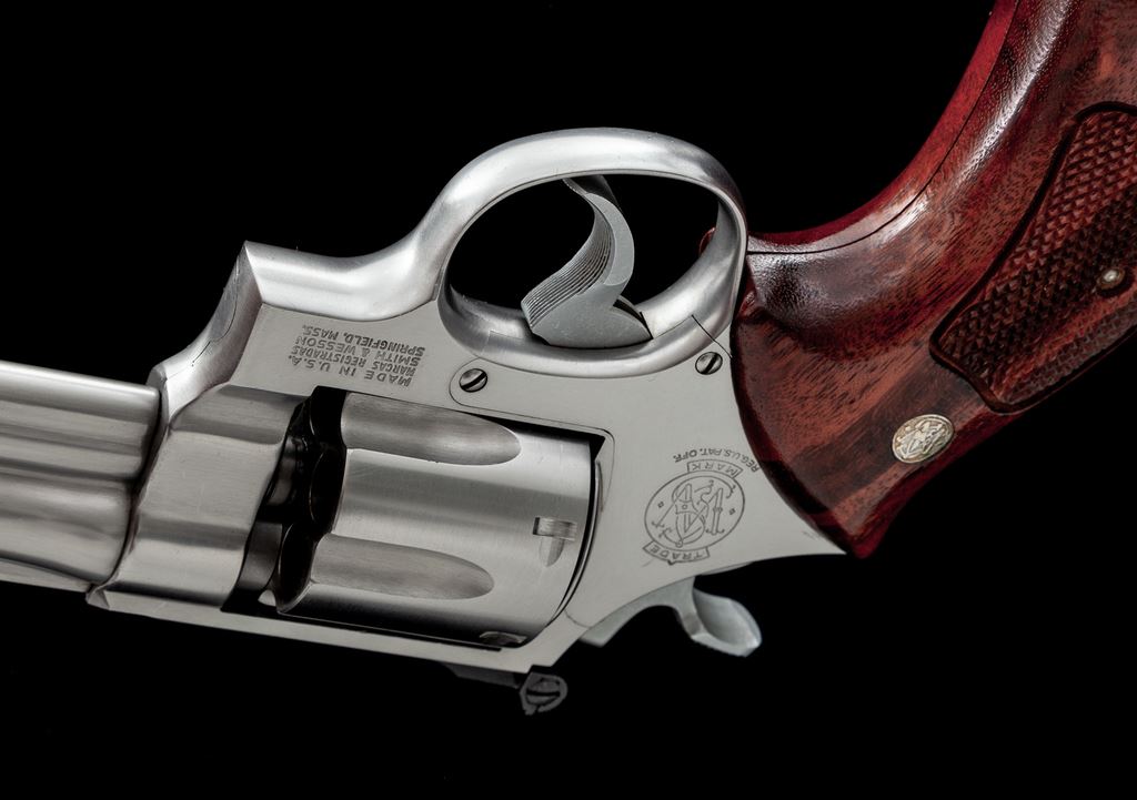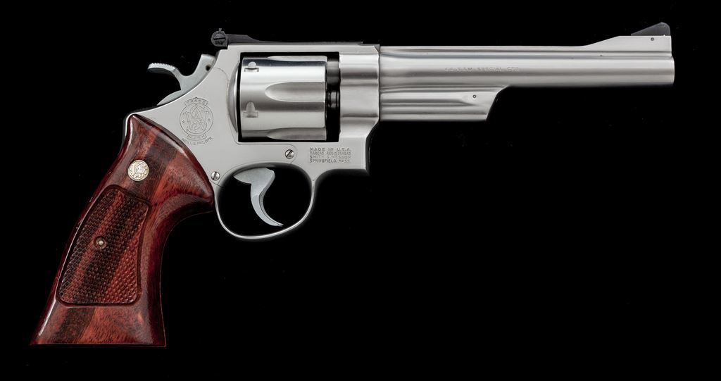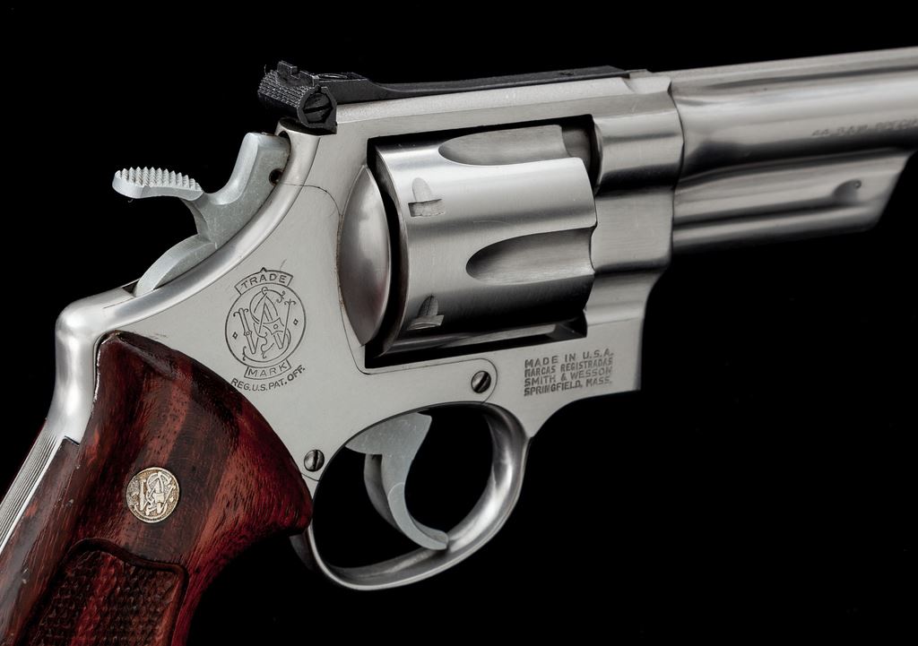 Smith & Wesson Model 624 (.44 Target) Double Action Revolver, #AHB6303, .44 S&W Spec. cal., 6.5'' barrel, stainless steel, factory checkered Goncalo Alves target grips with S&W medallions, pinned blade front sight, square-notched micrometer click adjustable rear sight, wide spur hammer, and serrated trigger. Mfg'd circa 1985-1988. Condition is near excellent showing normal signs of moderate range use. Metal with some light micro-scratching, most concentrated on the cylinder. Factory lettering is clear and well defined. Grips with a small amount of shallow handling marks, most noticeable in the speedloader cutout and along the back edges; checkering is sharp with 99%+ remaining varnish. Action is smooth and crisp with an excellent bore. Est.: $650-$950. (Modern/PPT)