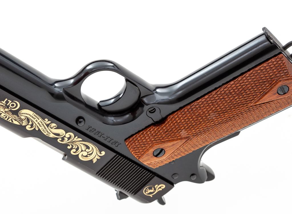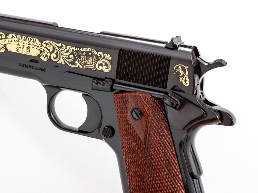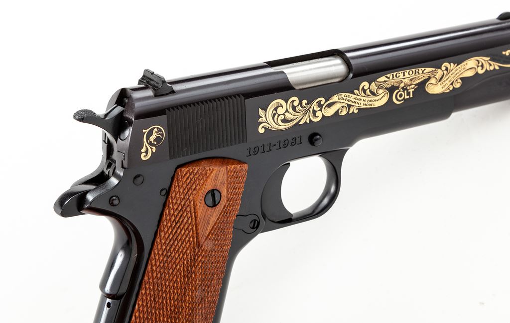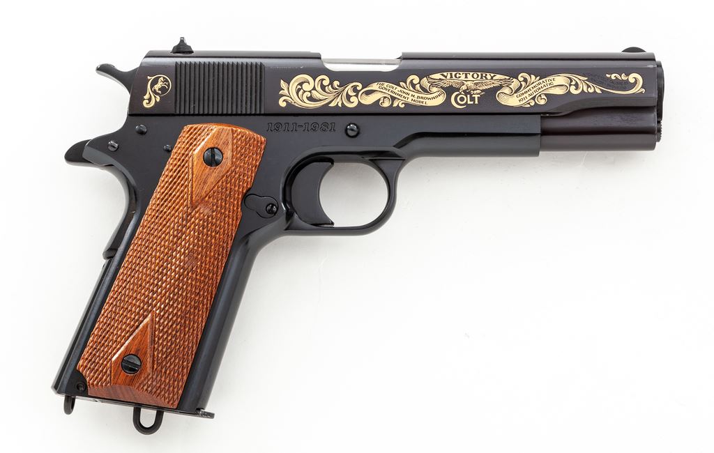 Colt Gov't Model John Browning Commemorative Semi-Automatic Pistol, #CJMBC0410, .45 ACP cal., 5'' barrel, dark blue finish, checkered double diamond wood grips, standard fixed sights, and one magazine with lanyard loop. Both sides of slide with gold embellishments. Right side of frame is marked ''1911-1981''. In original wood display case with brass plaque on both the inside and outside of lid. With the exception of two moderate impressions to the right grip, this pistol is in excellent as new overall condition. Metal shows only a few insignificant handling marks. Action is smooth with a mirror bright bore. Case interior appears as new; exterior with scratches and storage wear. Mfg'd in 1981 with a limited production of 3,000 pistols. Est.: $800-$1,200. (Modern)(Not available to Calif. residents.)(Sierra Sid's Casino, Sparks, NV.)