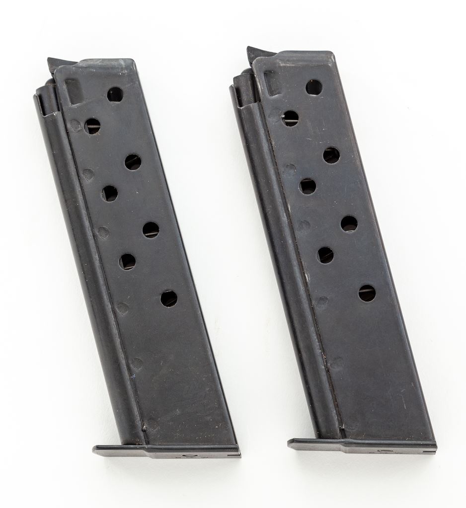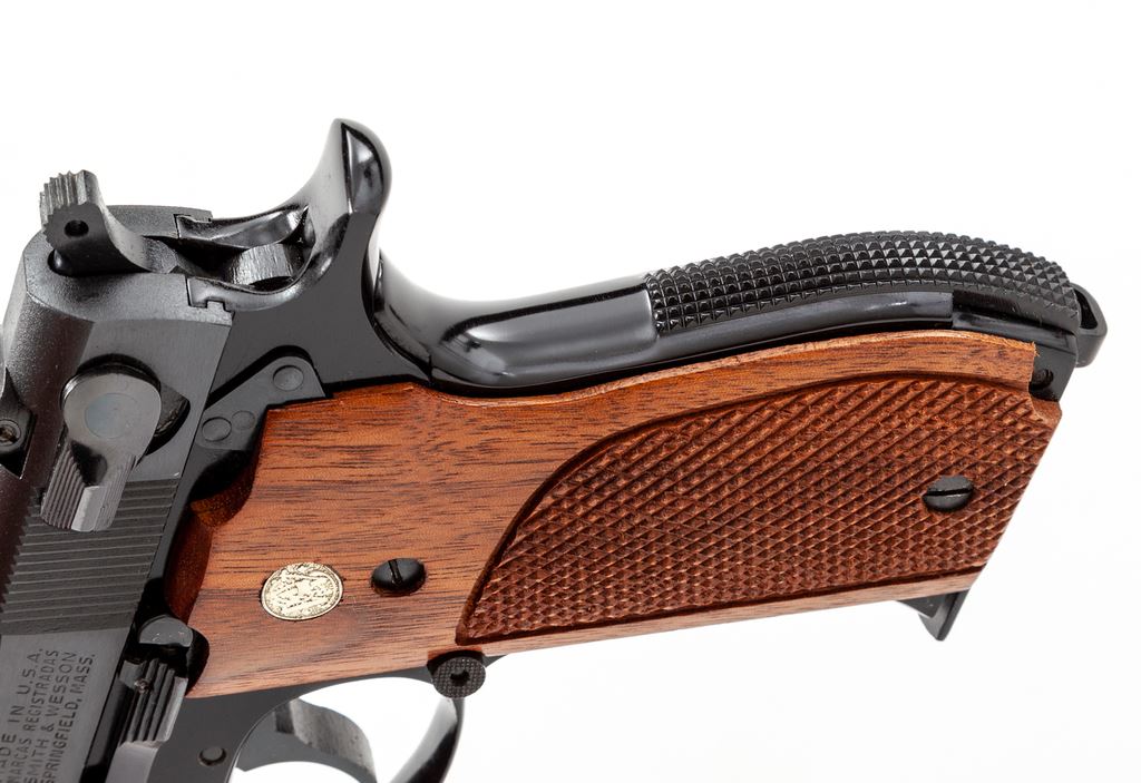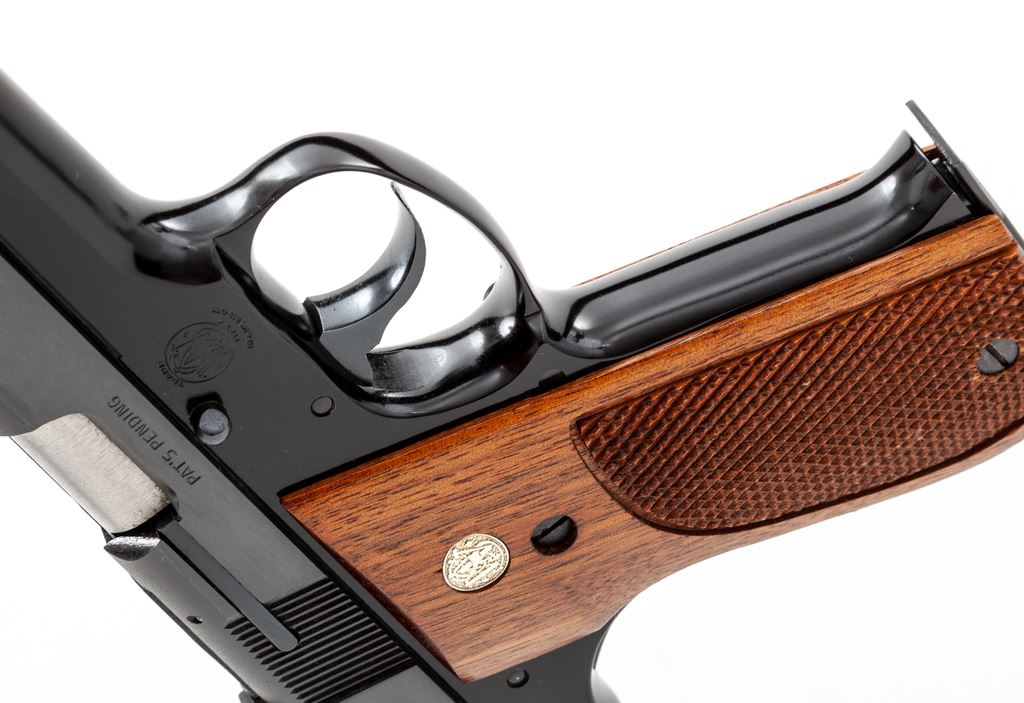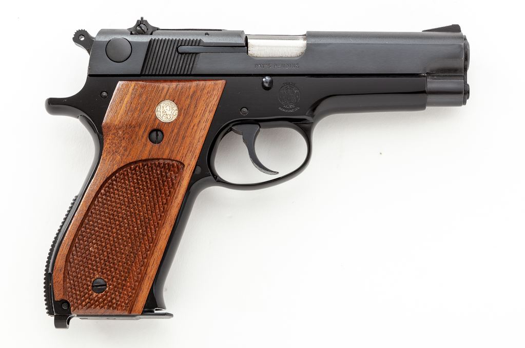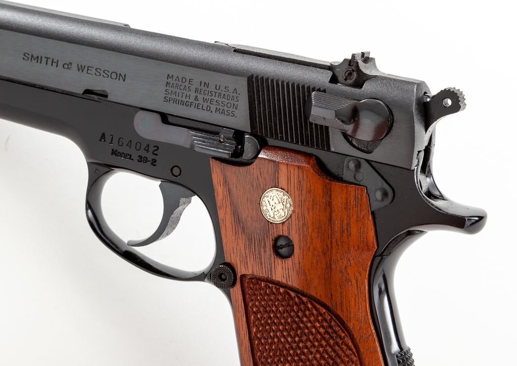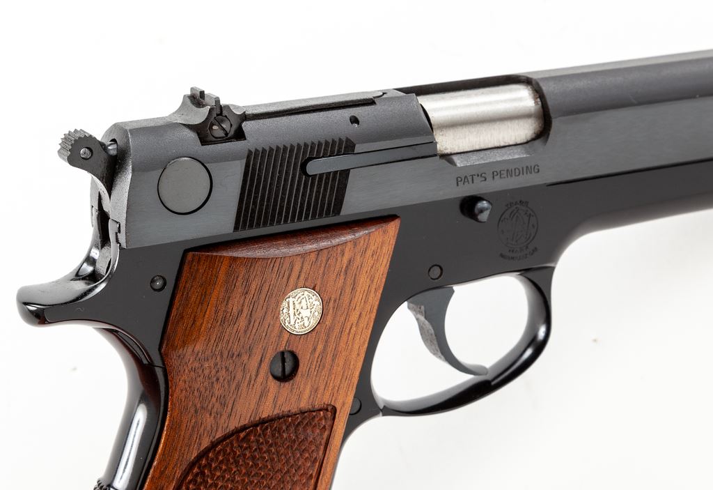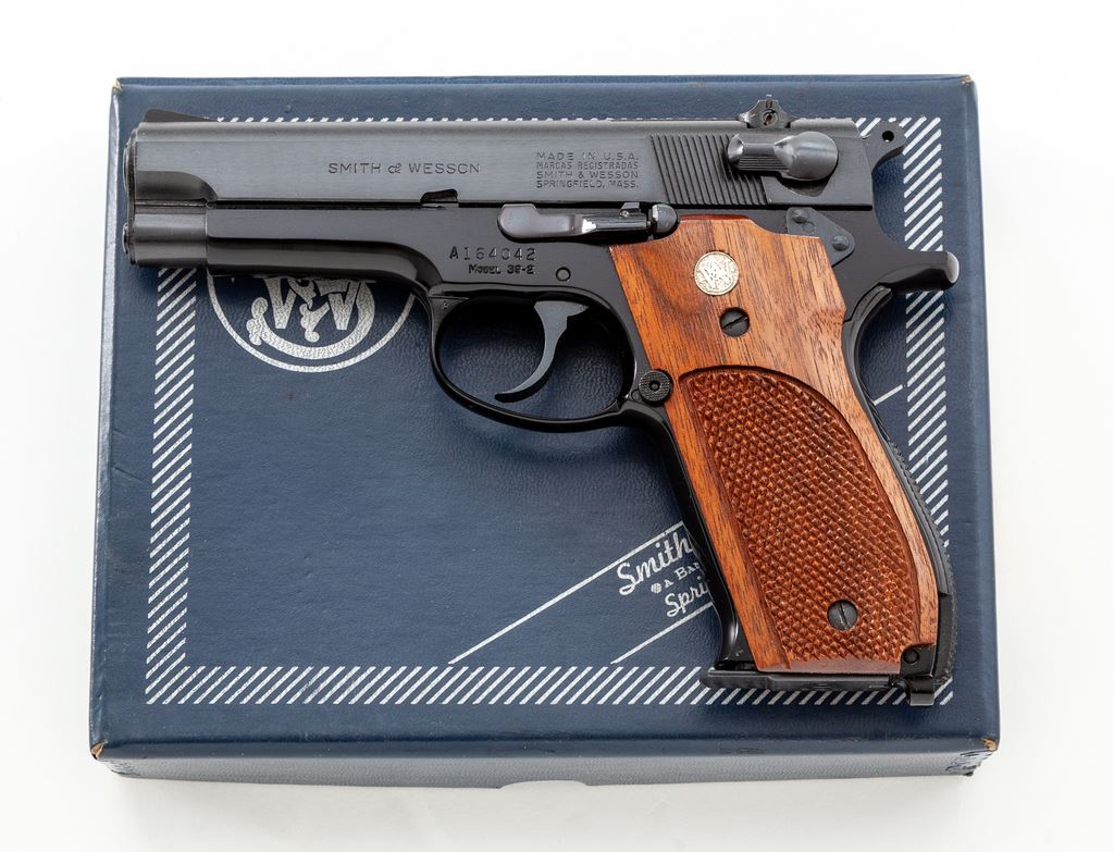 Smith & Wesson Model 39-2 Semi-Automatic Pistol, #A164042, 9mm, 4'' barrel, blue slide, black alloy frame, factory checkered walnut grips with S&W medallions, checkered backstrap, fixed ramped front sight, square notched rear sight, and three (3) factory magazines. In original two-piece box with matching end label, S&W packing paper, and owner's manual. Overall a really high condition pistol that retains approx. 99% factory finishes and shows only minor handling marks. Grips are also excellent with an even color and finish; checkering is sharp and clean. Action is smooth; bright bore. Box shows only minor storage wear. Overall a nice example that would be hard to improve upon. Est.: $500-$700. (Modern/PPT)