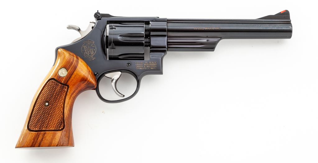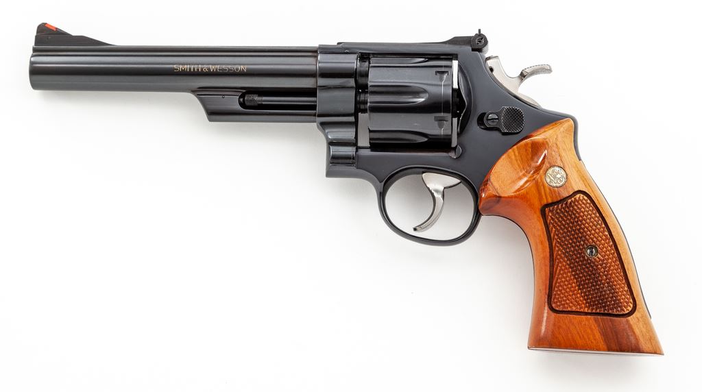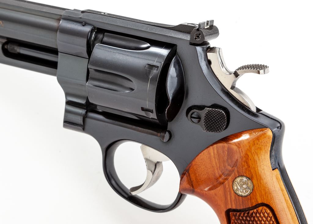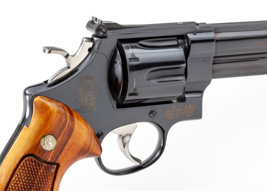 Smith & Wesson Model 25-2 1955 Target Model Double Action Revolver, #N300697, .45 ACP cal., 6.5'' pinned barrel, blue finish, wide target hammer and trigger have been polished bright, factory checkered square butt Goncalo alves target grips with S&W medallions, red ramp front sight and micrometer click adjustable rear sight. All of the factory lettering has been highlighted in gold. Mfg'd 1975-1976. Revolver rates as excellent with approx. 98+% original blue finish; cylinder with a thin index line. Factory lettering is clear. Grips retain most of their finish; bottom edges with a few shallow impressions; checkering is sharp and shows no visible wear. Action is crisp with a smooth hammer and trigger; bore is excellent. Est.: $700-$1,000. (Modern)(Not available to Calif. residents.)(Sierra Sid's Casino, Sparks, NV.)